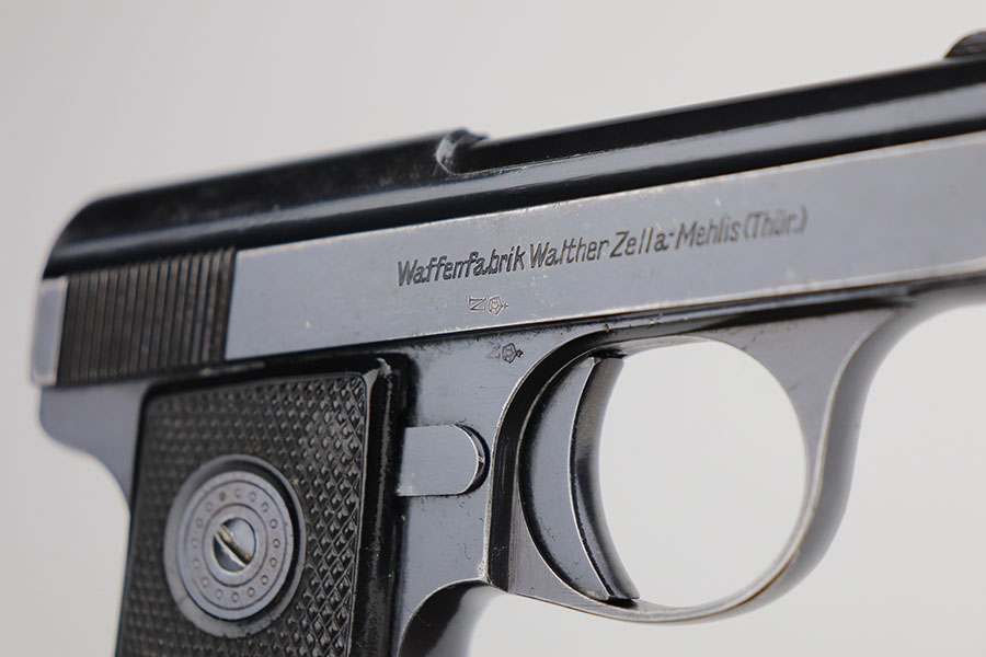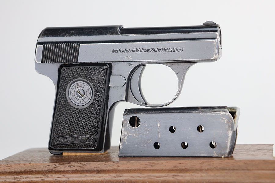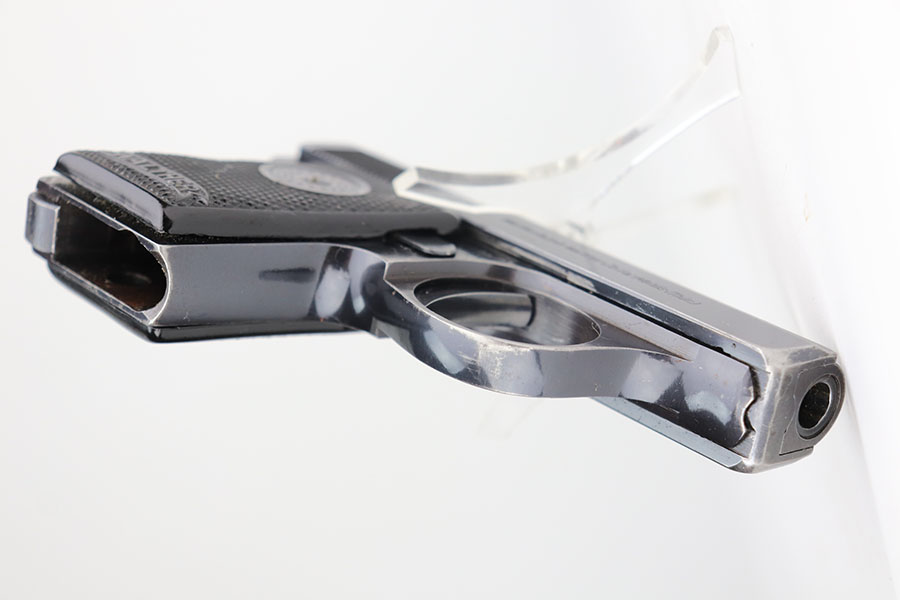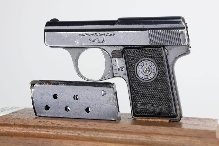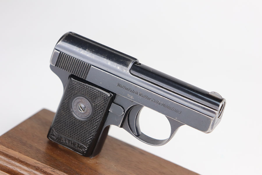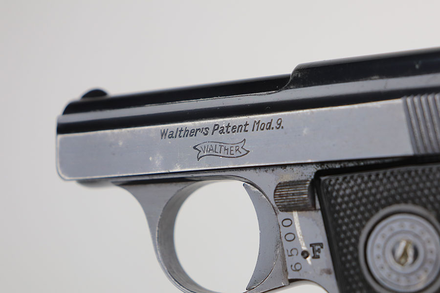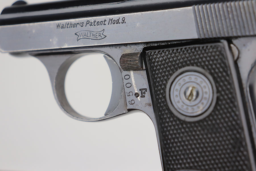 7/27/21 – This is an original Walther Model 9 from the 1930s. The bluing is original and rates at about 92% with wear on both sides of the slide, but most pronounced on the rounded portion of the right side of the slide. Excellent grips with just a hint of handling wear. Bore has pronounced rifling but some pitting in the grooves. Original Walther banner magazine. The listing also includes the display stand that’s in the photos.