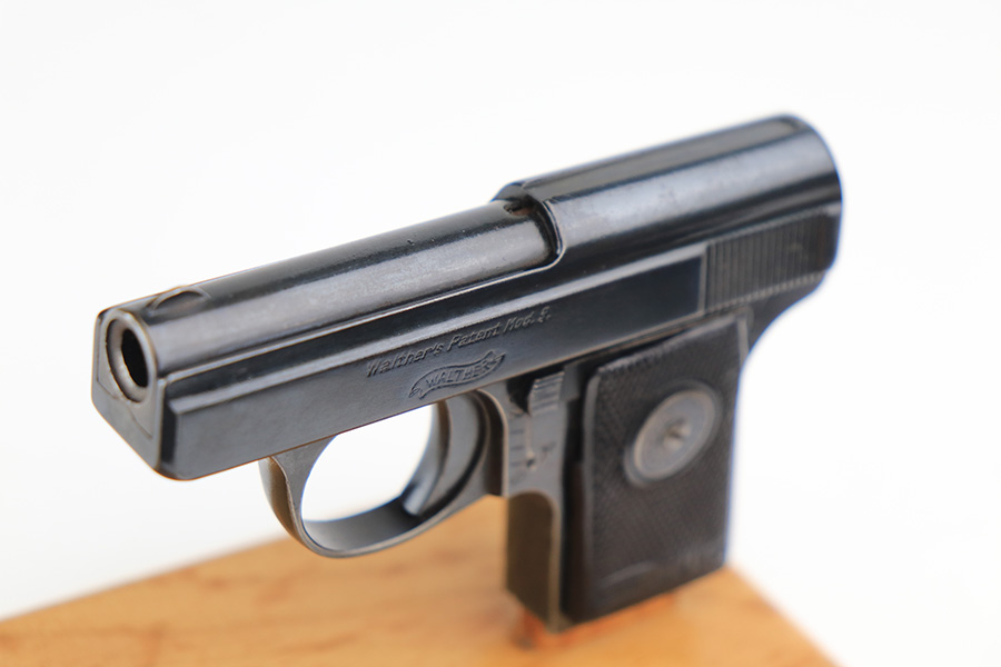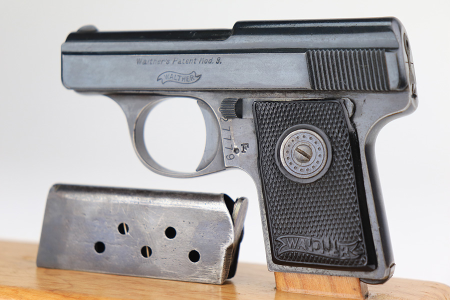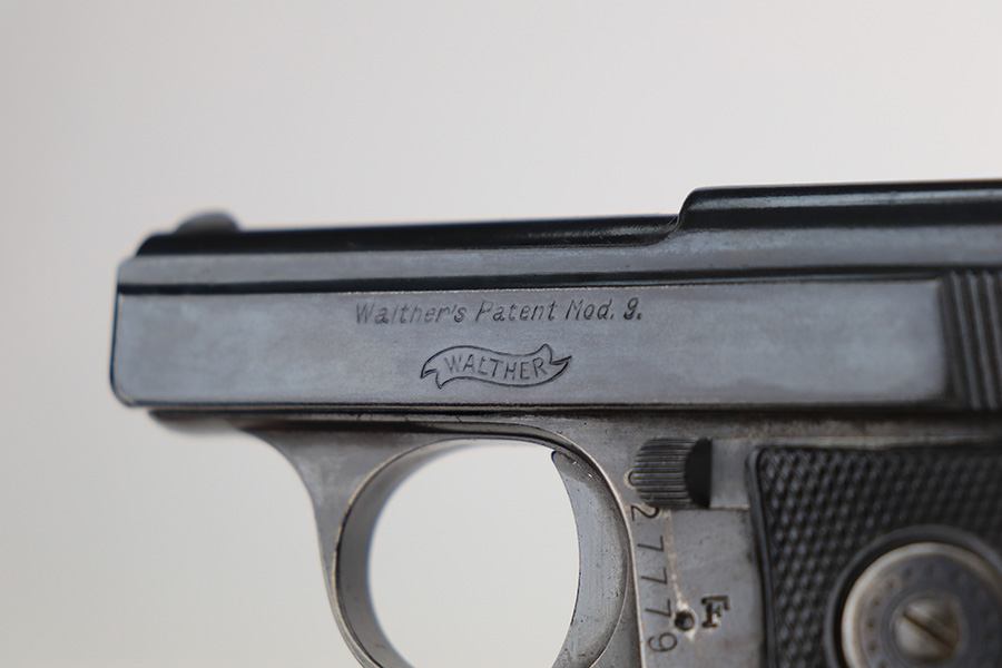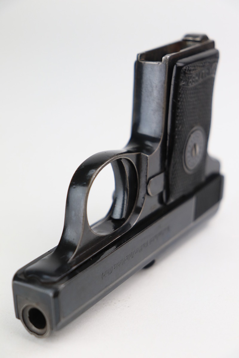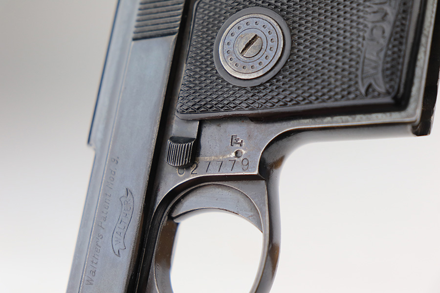 3/4/22 – This is an excellent example of a Walther Model 9 sold in the commercial market in the 1930’s. The gun is all matching and has the proper “Crown N” proofs. The gun whole gun has been professionally restored, so the finish is in beautiful condition. There are just hints of wear on some of the high edges and some cloudiness in the finish on the left side of the slide. It comes with period-correct black bakelite grips – there is some slight warping around the top edge of the left panel. Also comes with a modified Sauer magazine that fits well in the gun. Minty bore.