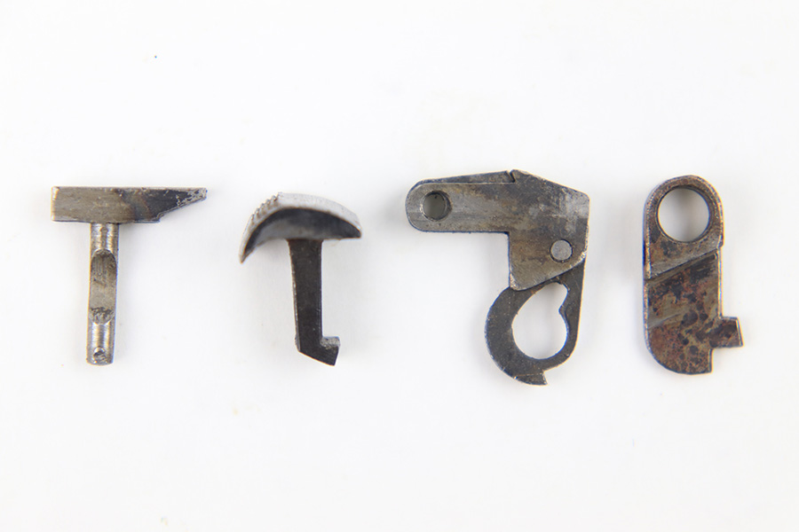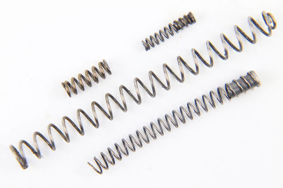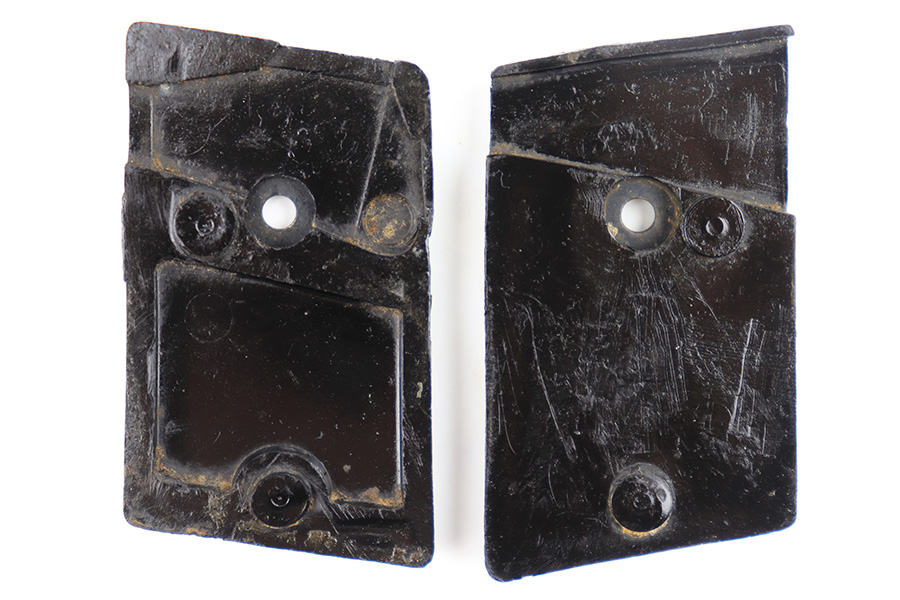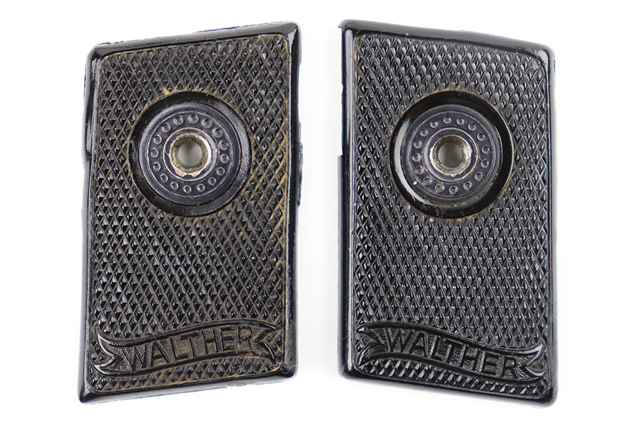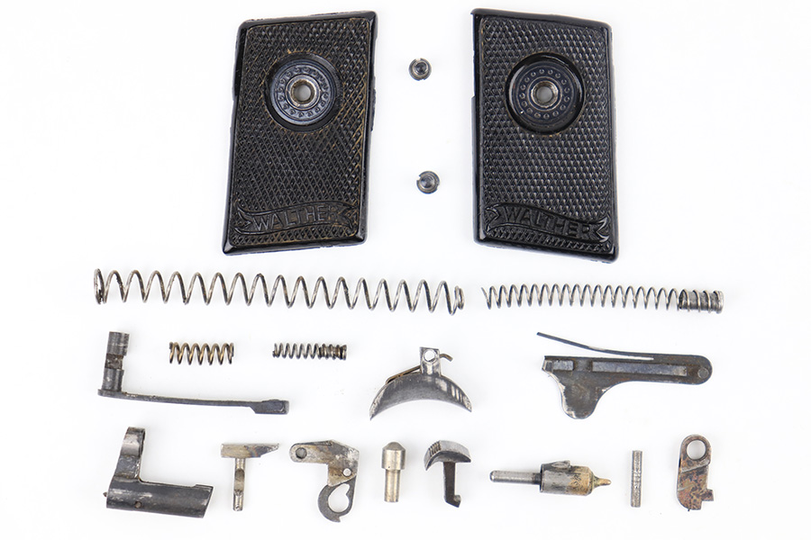 8/7/23 – This is an original pair of Walther model 9 grips, complete with original screws. The grips also come with a set of small parts and springs, as shown, also for the Walther model 9. These are all vintage 1920’s – 1930’s production Walther parts, and all are in great condition. The grips have no cracks or chips as well.