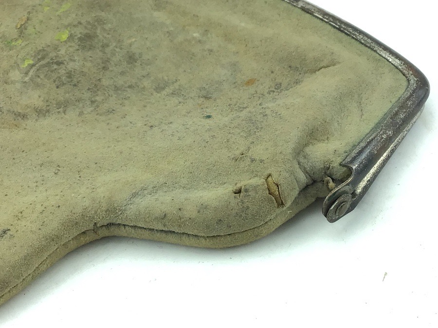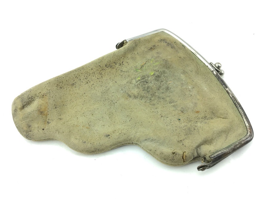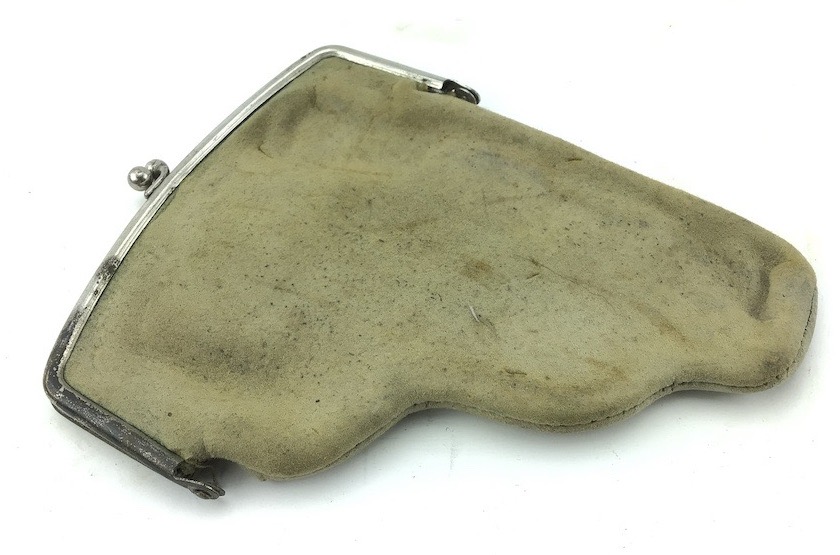 4/2/24 – Original and great condition “purse” style leather pouch holster for the Walther Model 9 pocket pistol. Strong and supple leather with minimal wear. There are minor stains and handling wear, and a small tear near one of the hinges, but it does not penetrate the leather. Scarce piece.