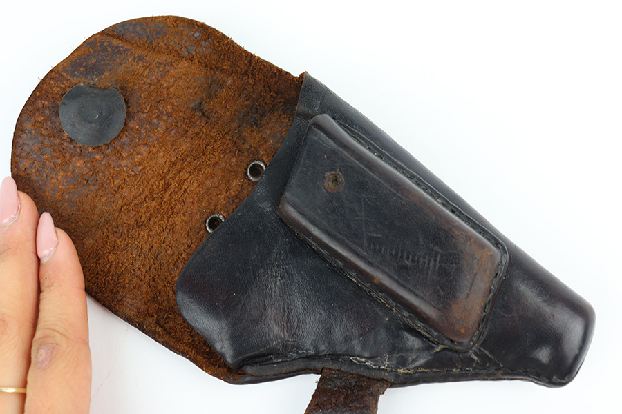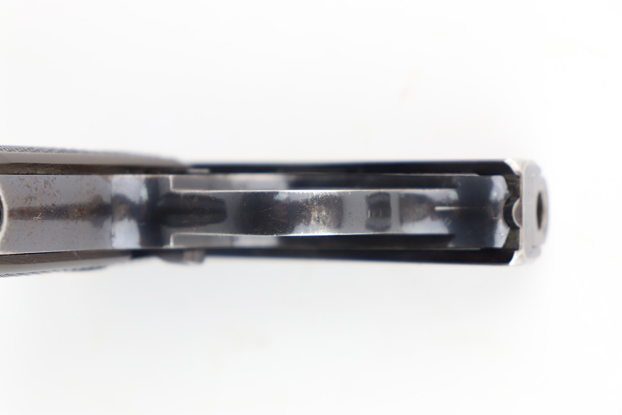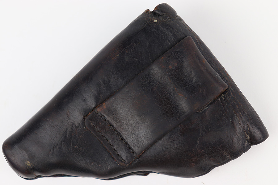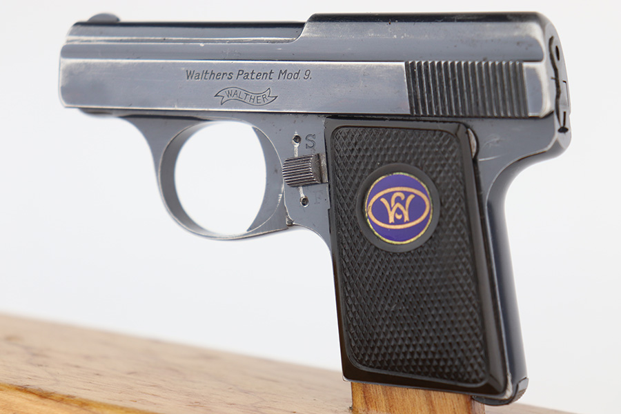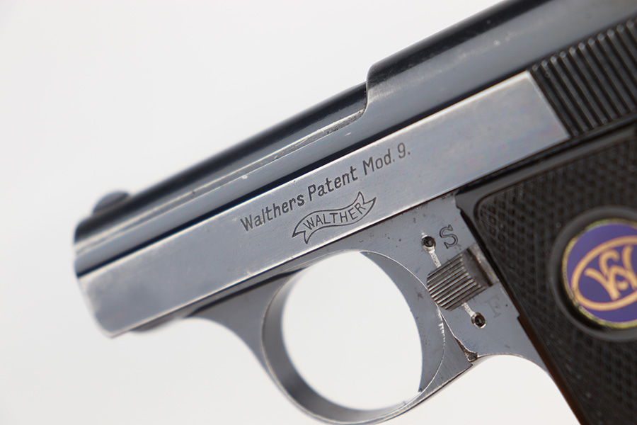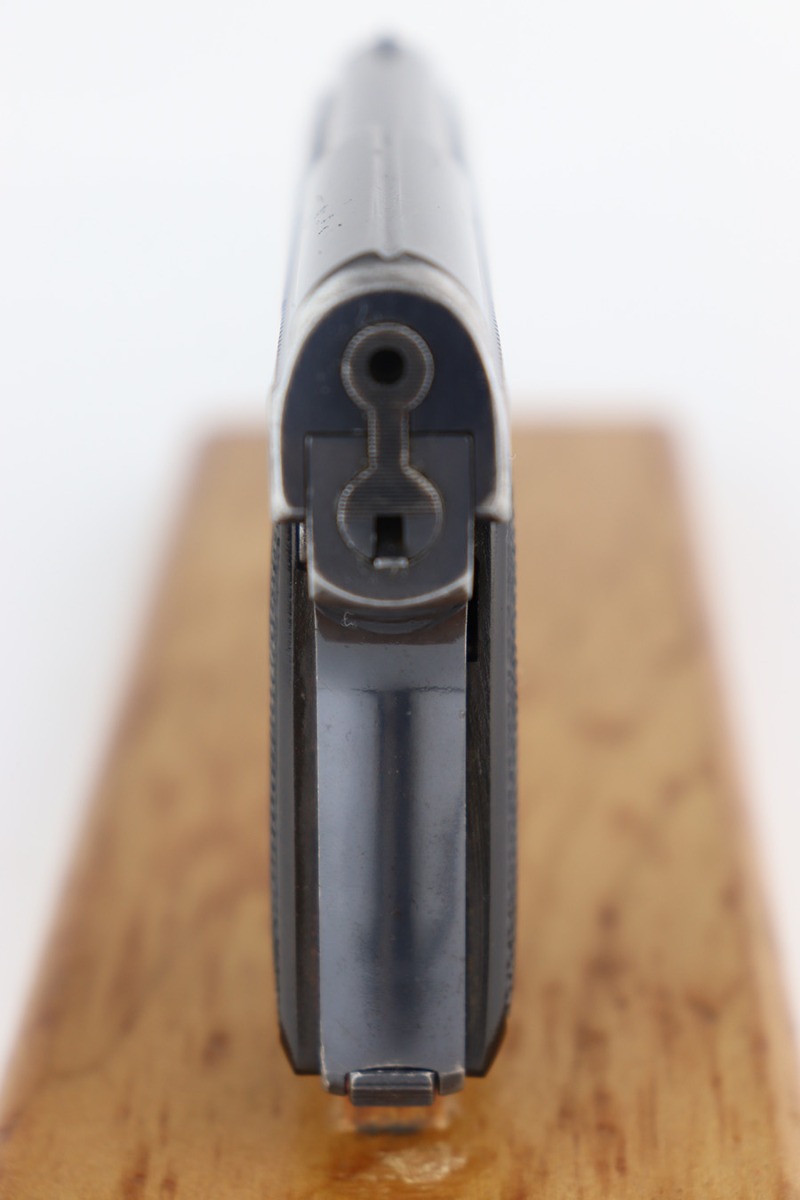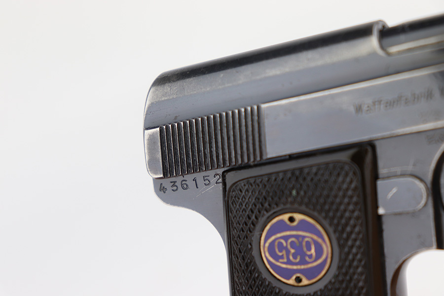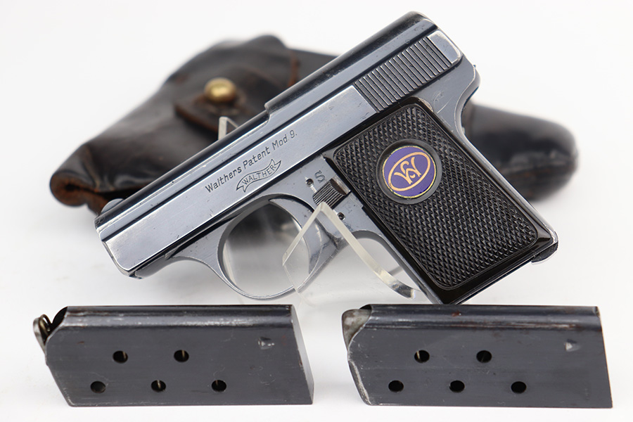 12/1/22 – This is a very nice example of a first variation Walther Model 9, manufactured between 1921-24 and chambered in 6.35mm. It is all matching and has the proper “Crown N” commercial proofs throughout. It comes as a rig with a period-correct leather holster and two proper magazines – not Walther marked on the bottom. The gun itself has retained about 92% of its original high polish finish. There is minor wear along both sides of the slide, concentrated mostly around the high edges. There is light freckling on both grip straps and a few tiny dots of discoloration on the right side of the slide, near the muzzle. Comes with excellent period-correct blackish-brown bakelite grips. The bore has good rifling, but there is minor pin-pricking throughout.