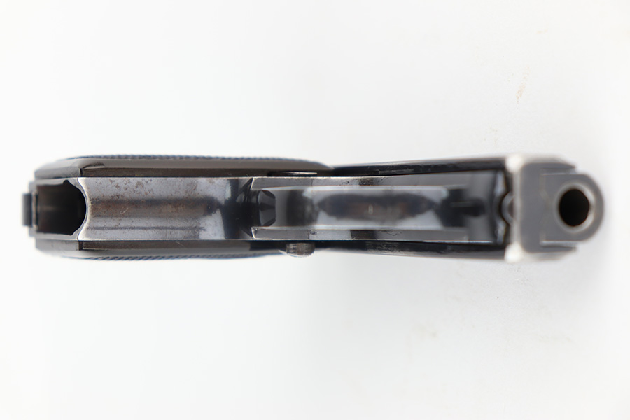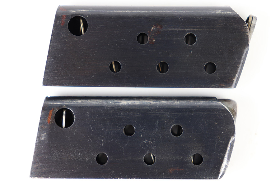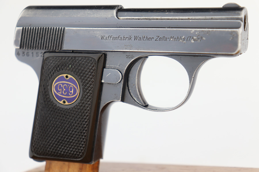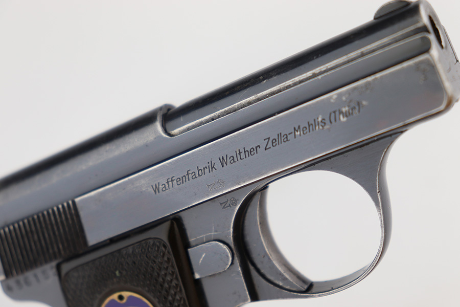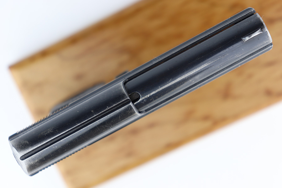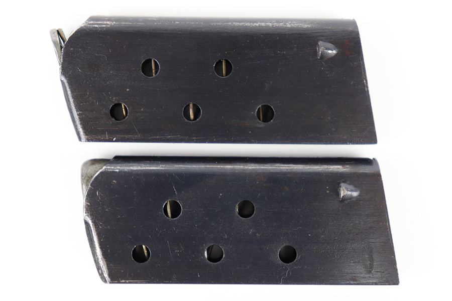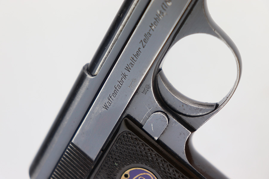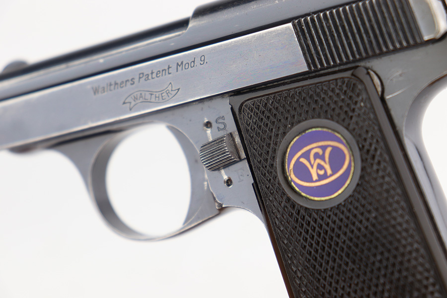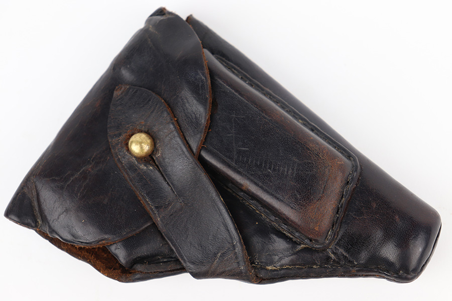 12/1/22 – This is a very nice example of a first variation Walther Model 9, manufactured between 1921-24 and chambered in 6.35mm. It is all matching and has the proper “Crown N” commercial proofs throughout. It comes as a rig with a period-correct leather holster and two proper magazines – not Walther marked on the bottom. The gun itself has retained about 92% of its original high polish finish. There is minor wear along both sides of the slide, concentrated mostly around the high edges. There is light freckling on both grip straps and a few tiny dots of discoloration on the right side of the slide, near the muzzle. Comes with excellent period-correct blackish-brown bakelite grips. The bore has good rifling, but there is minor pin-pricking throughout.