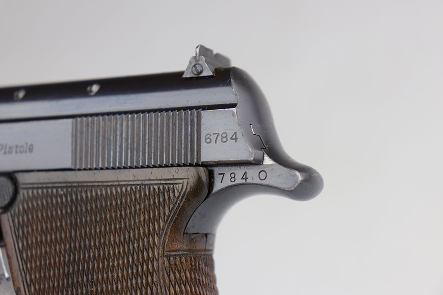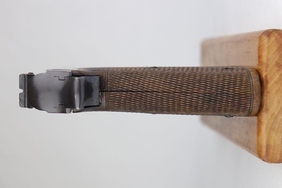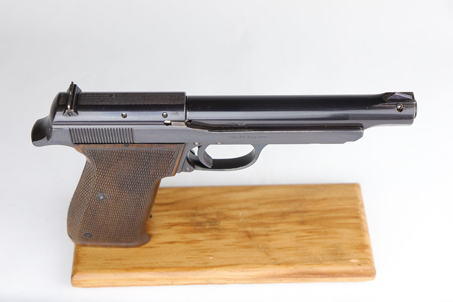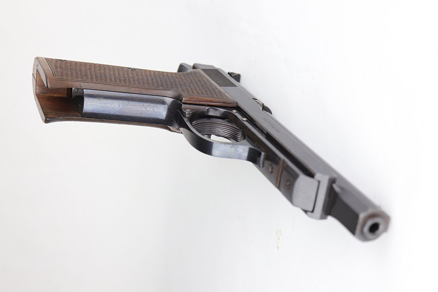 7/9/20 – This is an excellent Walther Olympia Jaeger Pistol made in the late 1930’s. The original design was actually developed for use by the German Olympic team who used it during the 1936 Berlin Olympics. Germany won both the Gold & Silver medals in the 25 meter Rapid Fire Pistol matches during those games. The Olympia is a single-action, blow-back pistol with an internal hammer and push-button magazine release. This is the short-barreled “Hunter” version of the Olympia pistol, introduced in 1937 to comply with new German firearms regulations which stipulated what type of firearm a hunter was allowed to carry in the woods. It is chambered for the .22 Long Rifle and has a 4-5/8″ barrel. This example has retained about 97-98% of its original bluing and still has the matching, numbered magazine. There is minor high point wear but very little bluing loss overall. There is some oxidation on the front strap though. Mint bore and excellent two-piece grips.