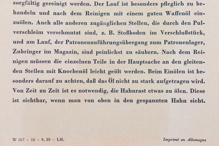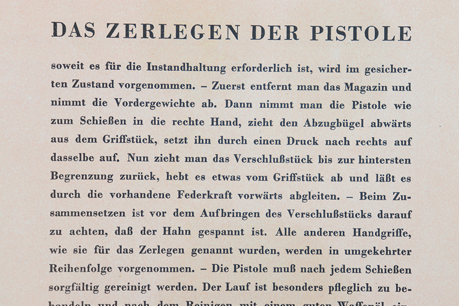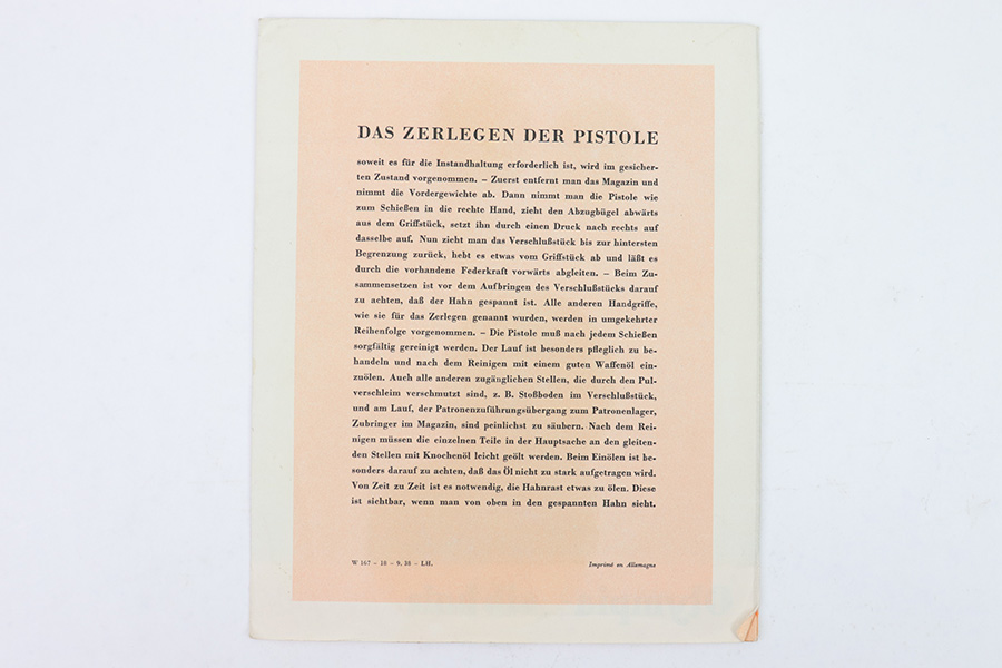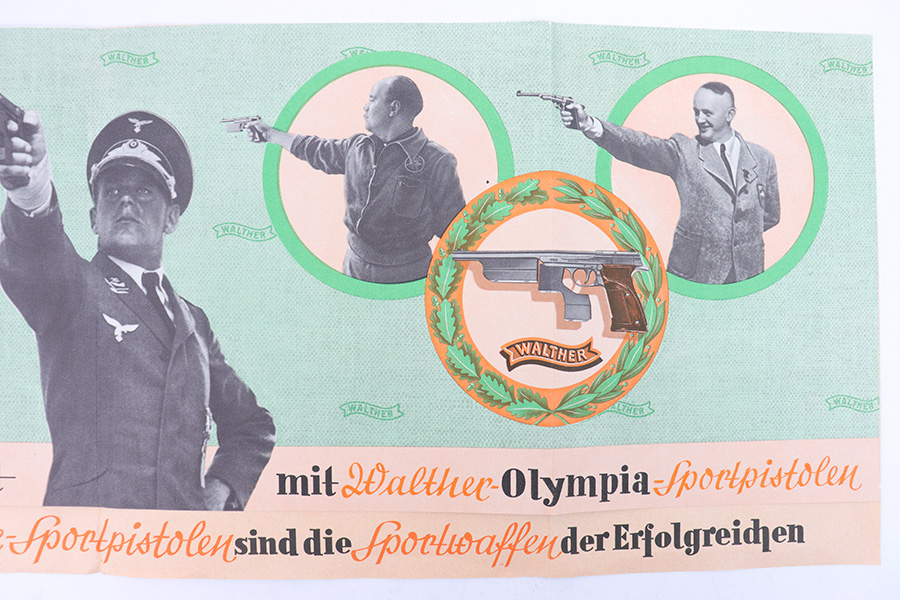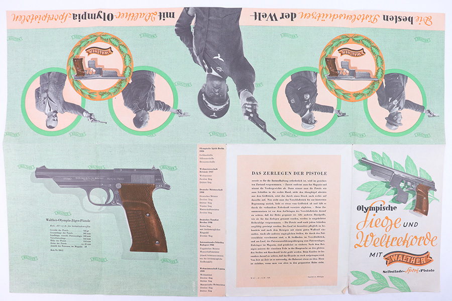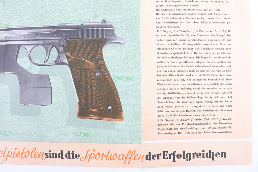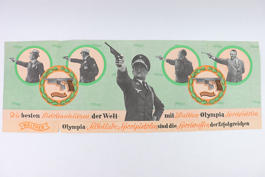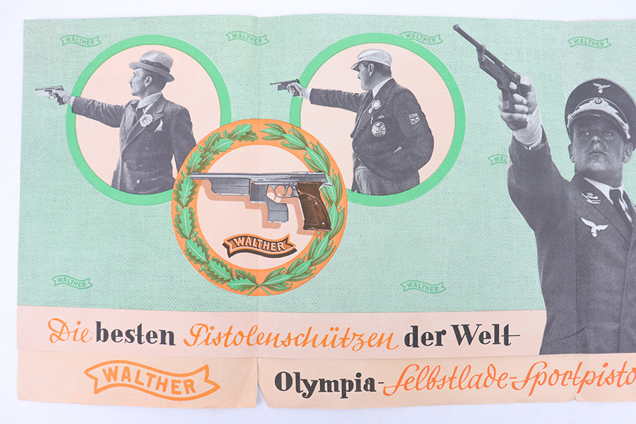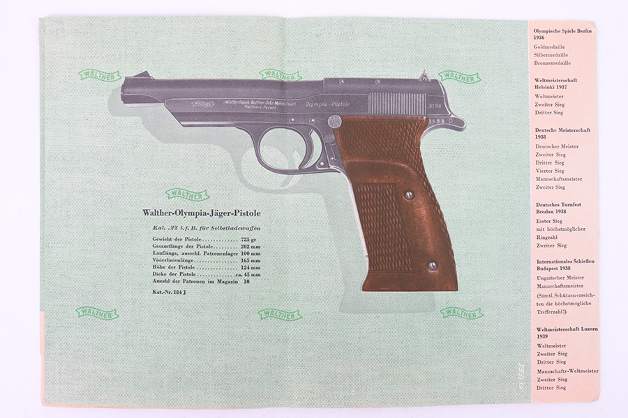 1/19/23 – This is an original Walther Olympia promotional sales brochure / manual from 1938. The manual unfolds to show prized competition shooters using the Olympia pistol. The featured image being of a Luftwaffe soldier in uniform. The pages are in color and completely intact, with some mild edge wear and a few slight rips along the folds of a few pages, but this is minor. Excellent overall condition and a very cool piece of WW2 history.