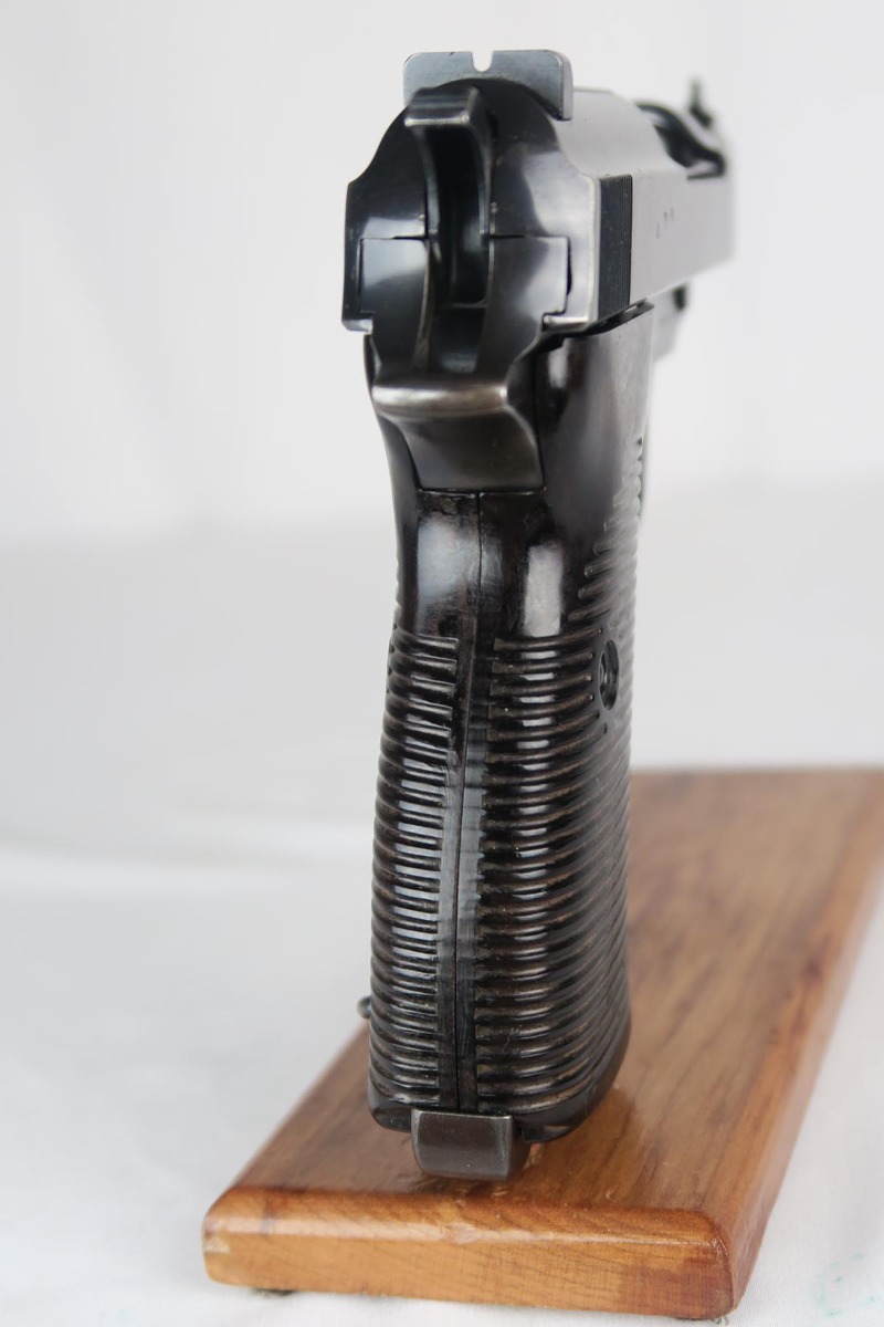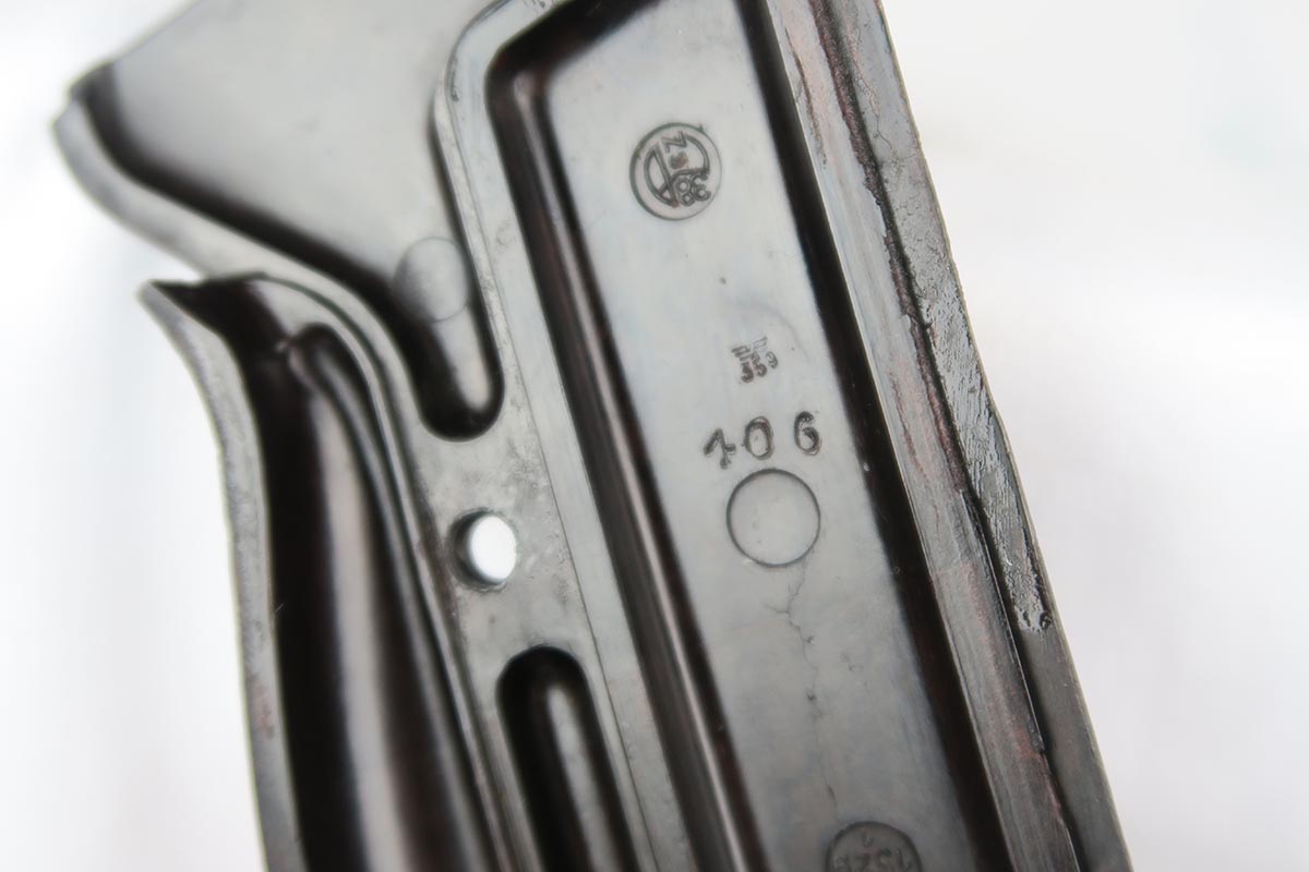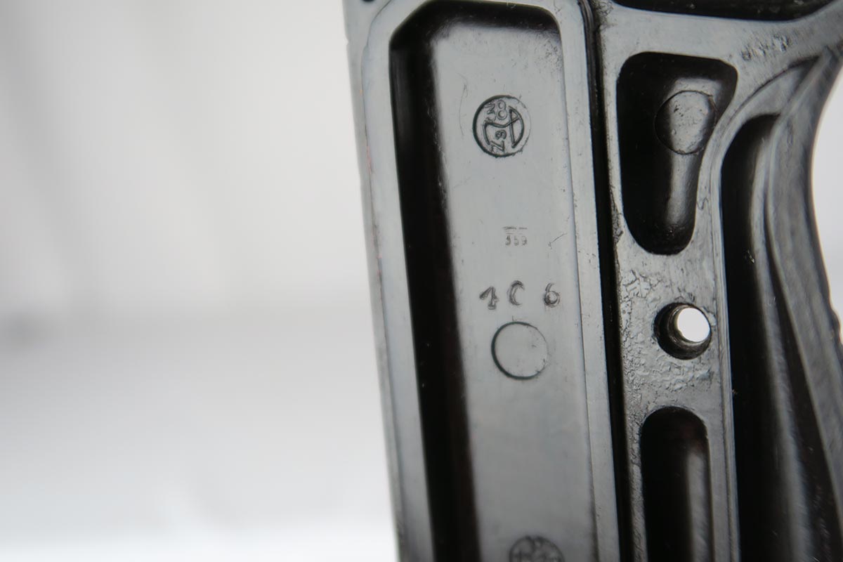 3/16/18 – This is an all matching and original Walther P.38 from 1941. It is a first variation ac 41 with original matching magazine and grips. The high-polish blue rates at about 85% with uniform thinning and patina on the slide and front strap. All small parts are waffen proofed, as they should be. Bore is excellent and shiny. Grips are in excellent condition with no chips or cracks. Magazine properly has two E/359 proofs on the spine.