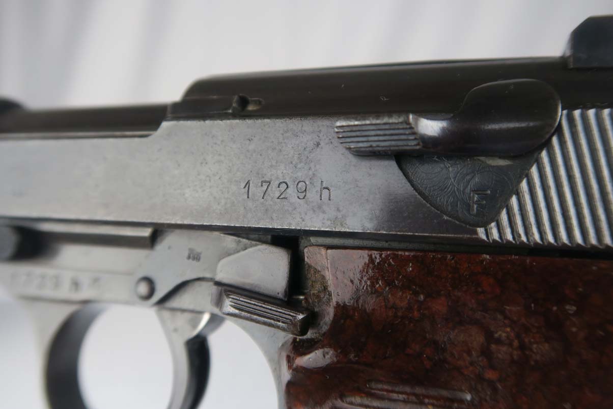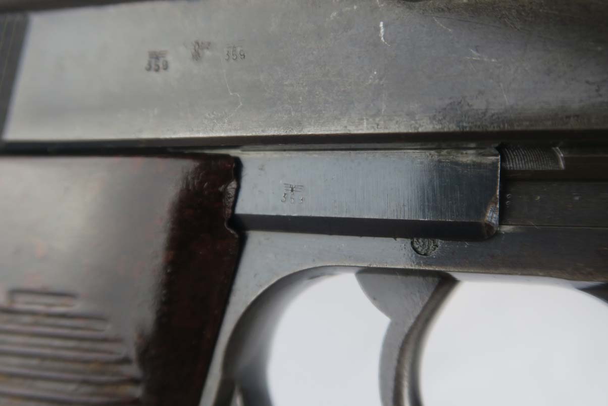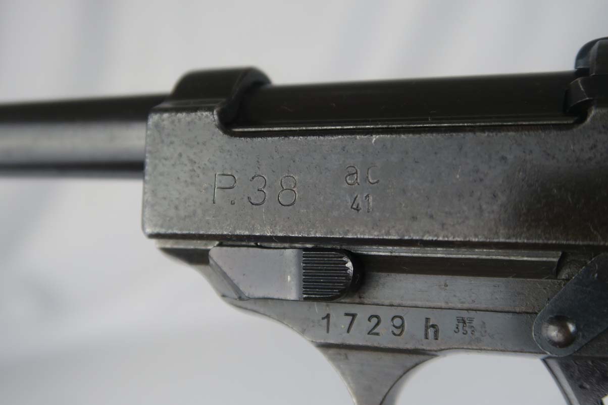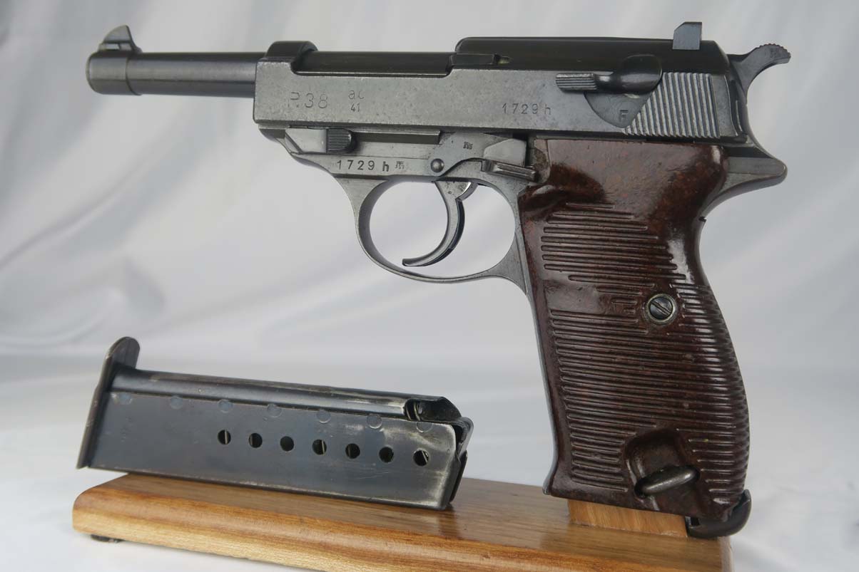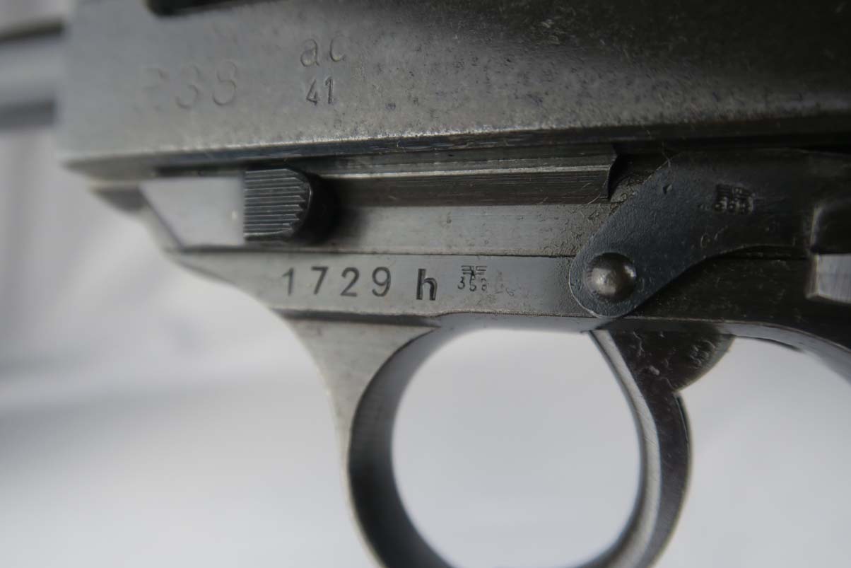 7/26/17 – This is an original WW2-era Walther P.38 from 1941. It is a third variation ac 41, with military finish that rates at about 90%. Slide shows a decent amount of oxidization and the front strap has some thinning. Right side of slide shows some patina and a lightly scratched ‘X’ near the inspection marks, but it is not a Russian ‘X’. All matching with E/359 small proofs. Unmarked grips – chip in top of right panel. Walther magazine. Bore is a little frosted but no major flaws. Decocker works.