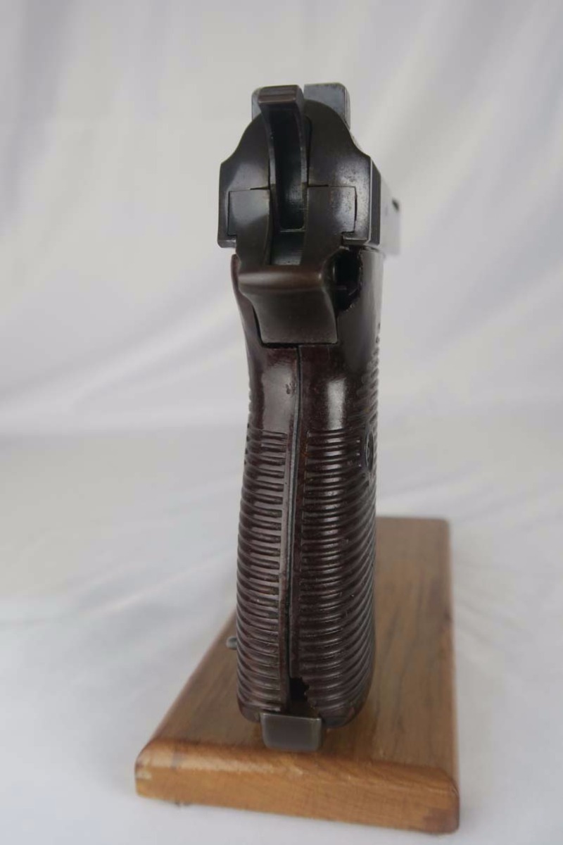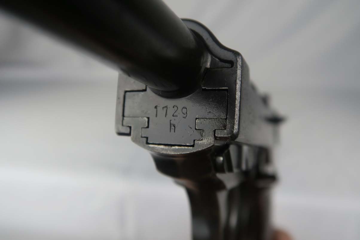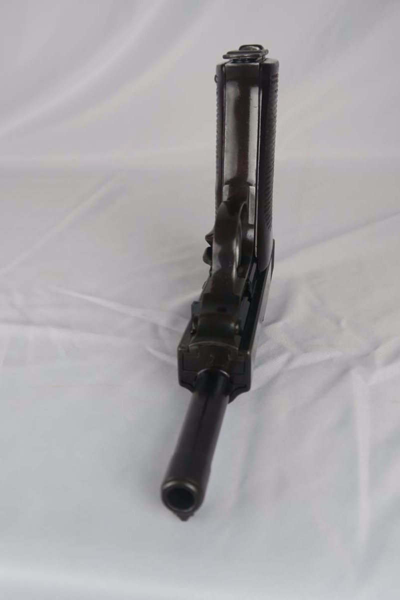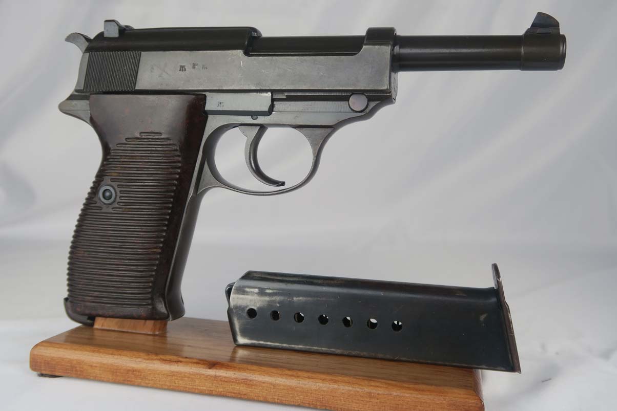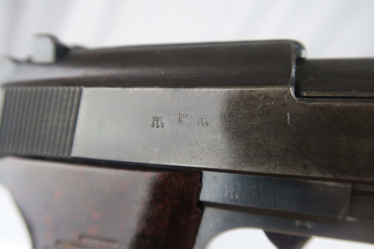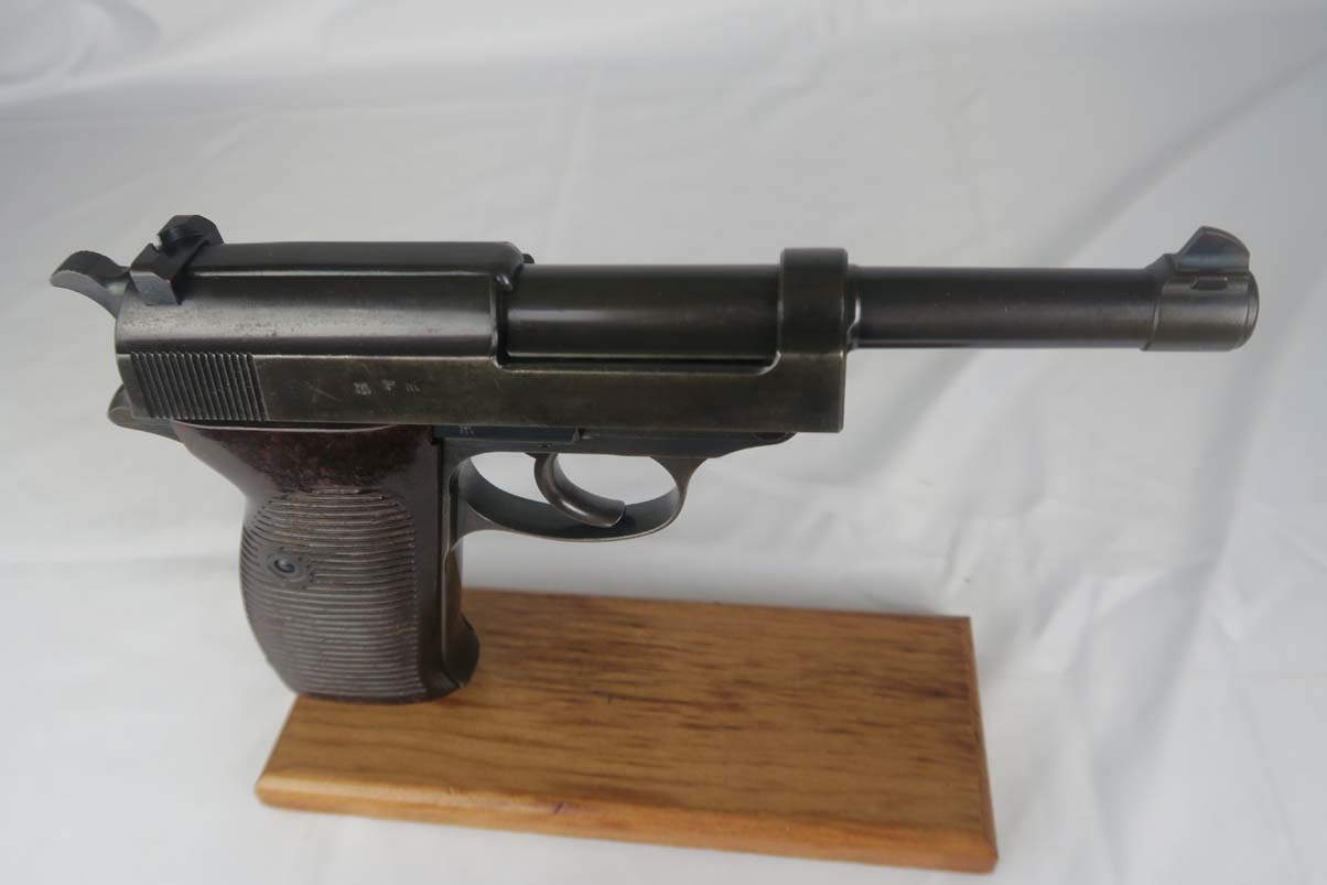 7/26/17 – This is an original WW2-era Walther P.38 from 1941. It is a third variation ac 41, with military finish that rates at about 90%. Slide shows a decent amount of oxidization and the front strap has some thinning. Right side of slide shows some patina and a lightly scratched ‘X’ near the inspection marks, but it is not a Russian ‘X’. All matching with E/359 small proofs. Unmarked grips – chip in top of right panel. Walther magazine. Bore is a little frosted but no major flaws. Decocker works.