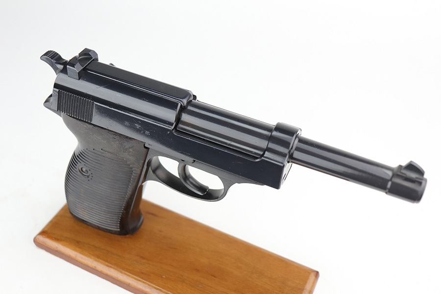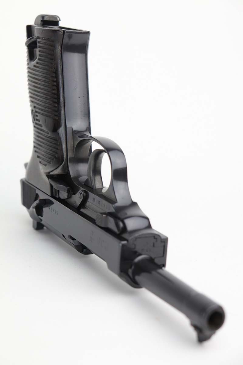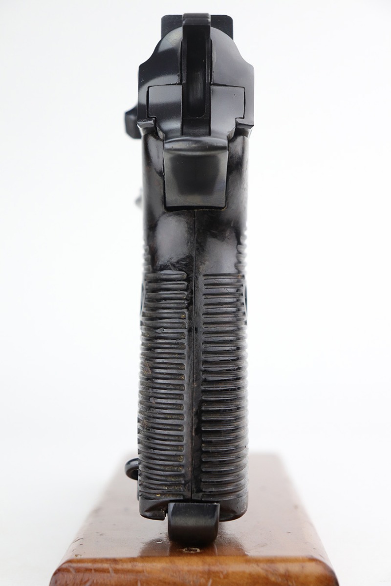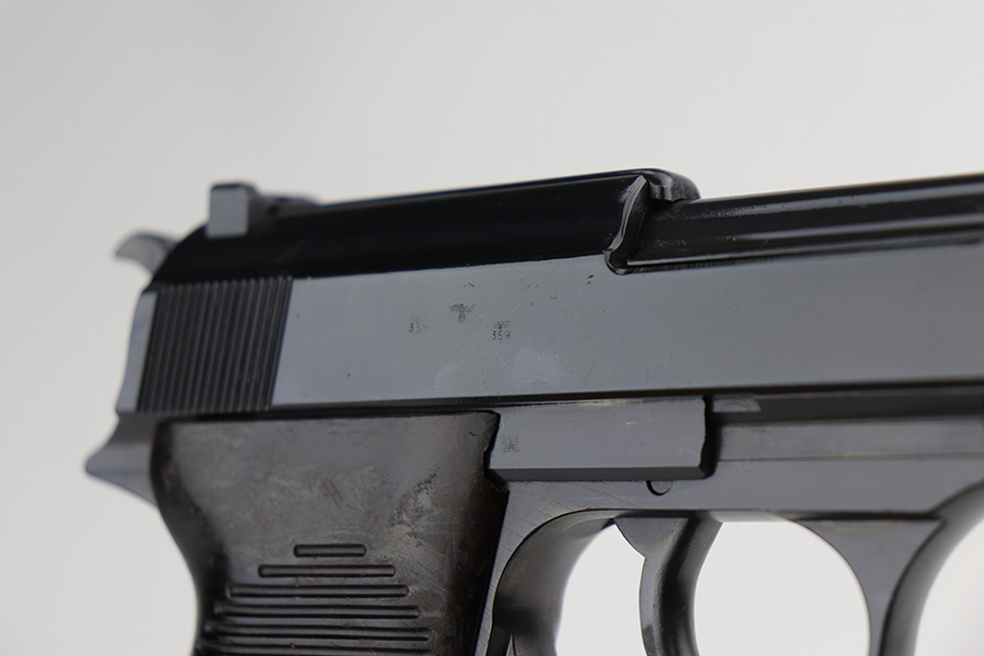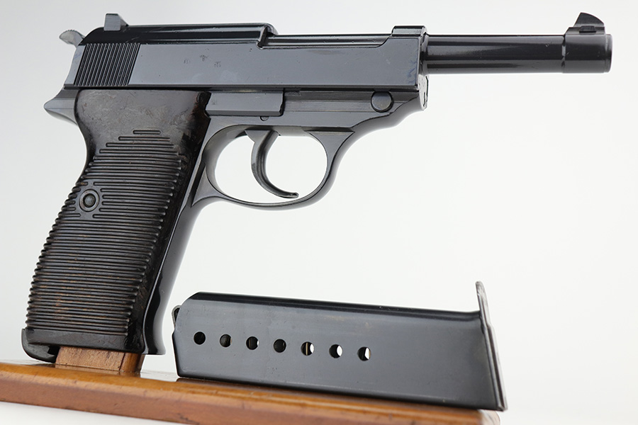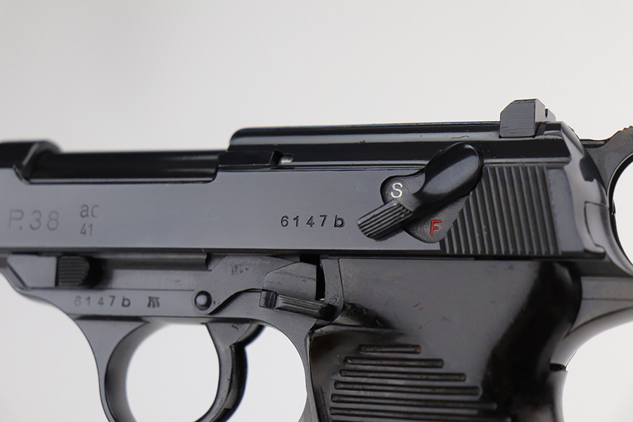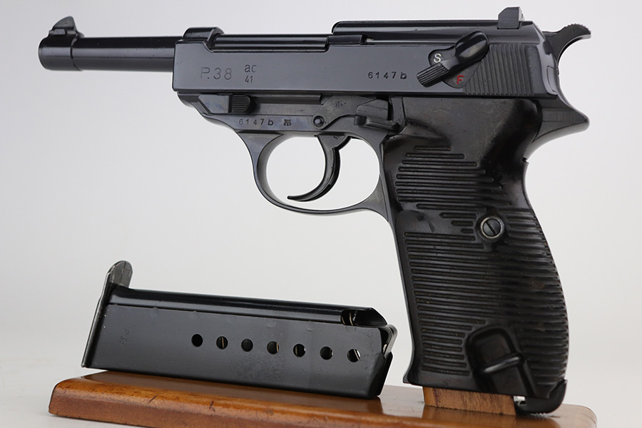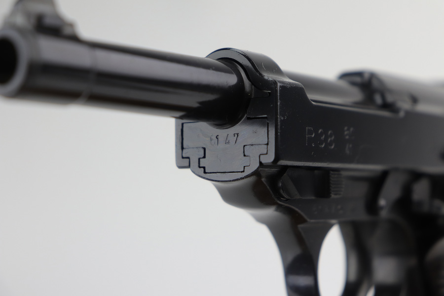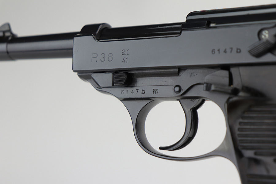 9/27/21 – This is a beautiful example of a Walther P.38 issued to the Nazi military in 1941. It is all matching and has the proper “Eagle 359” military inspection proofs throughout, even on the small parts. It comes with a numbered magazine that is not matching but is very close. The gun has retained about 99% of its finish. There are a few very light scratches and small dots of discoloration on the right side of the slide. Comes with excellent bakelite grips. The bore has strong rifling with minor freckling throughout. De-cocker is functional.
