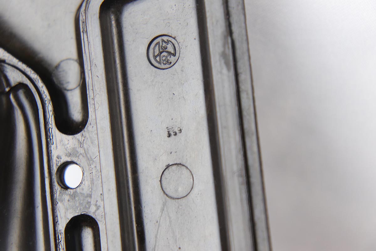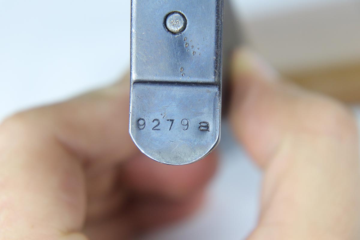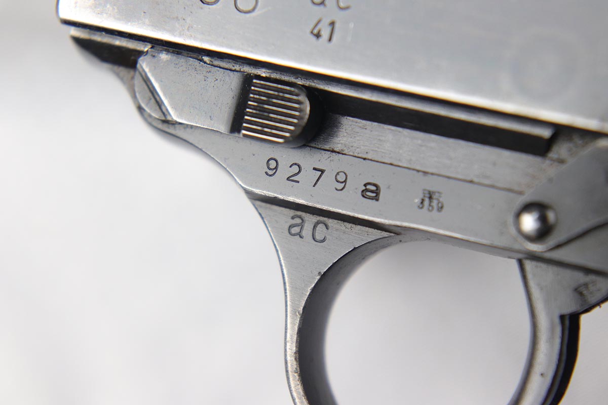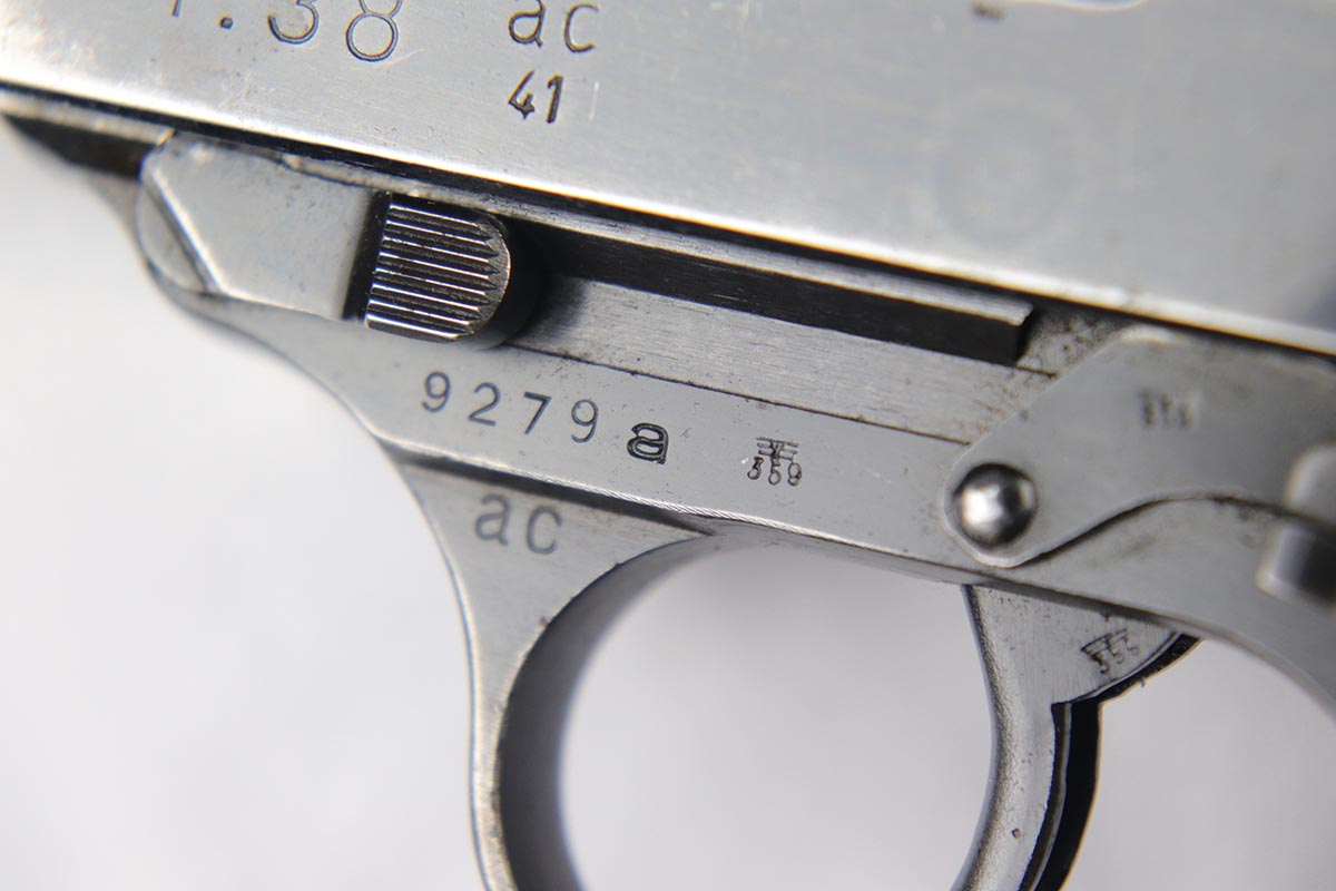 6/19/18 – This is an all original and matching Walther P.38 from 1941, including the original matching magazine.  This is a first variation ac 41 with ‘ac’ mark on trigger guard and high-polish blue.  The blue rates at around 85-90% with high edge wear in most areas and thinning throughout the right side of the slide.  All small parts are waffen marked, including grips.  Bore is shiny and shows only minor frosting.