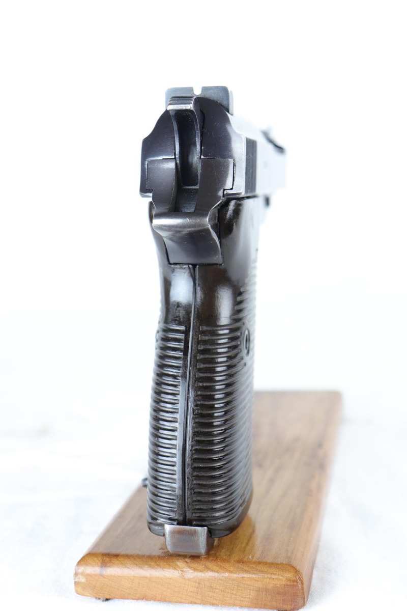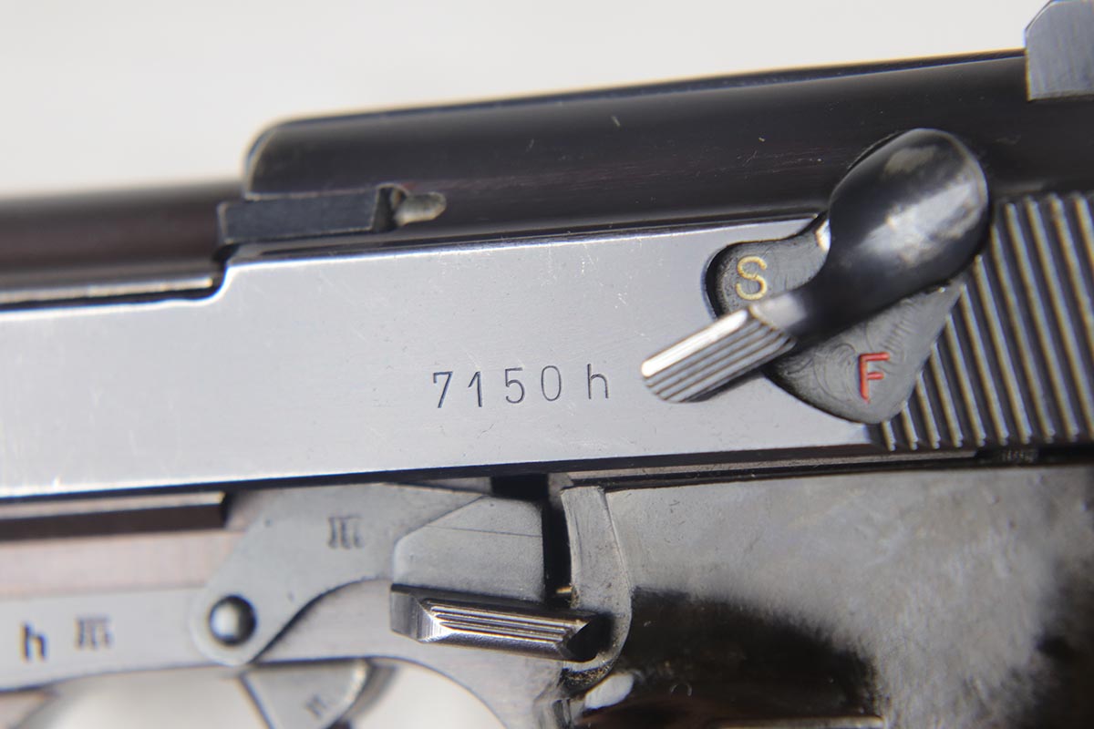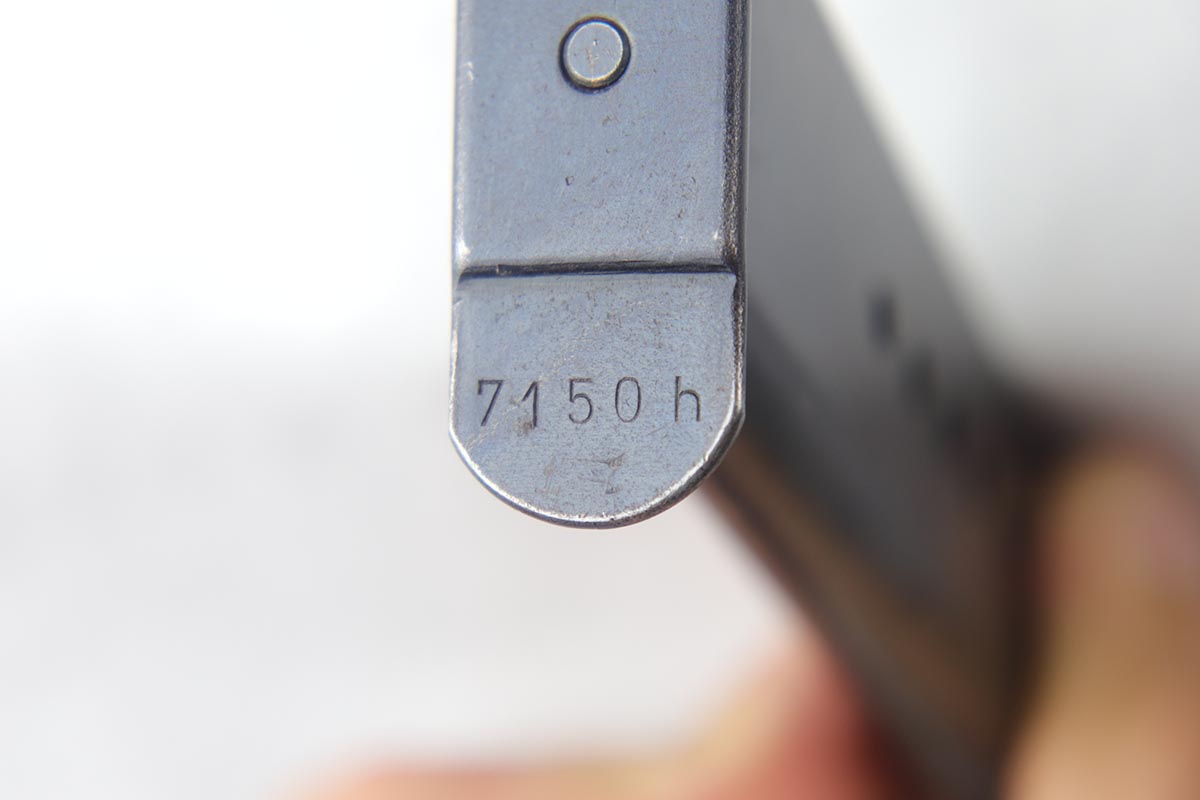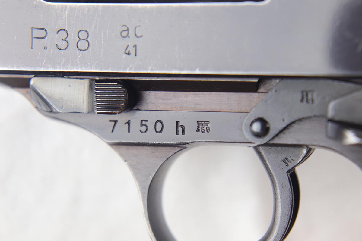 7/30/18 – This is a Walther made P.38 from 1941 with the original matching magazine and all matching parts.  This is a second variation ac 41 with high-polish finish but no ‘ac’ proof on frame.  The finish on this pistol rates at about 92% with edge finish loss and a few other small areas of minor finish loss.  All small parts are waffen marked, including the grips.  The magazine is original and matching to the pistol.  The bore is shiny with strong rifling.