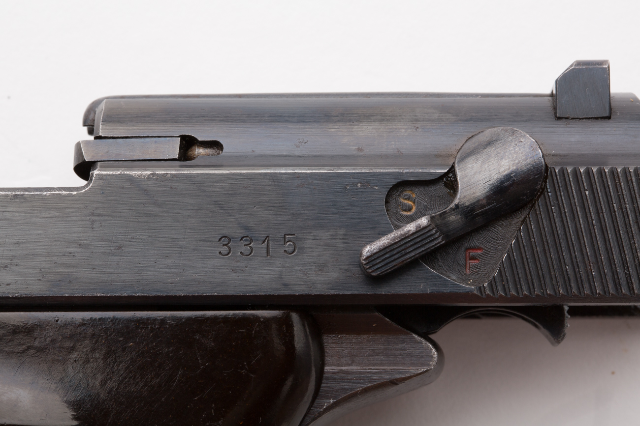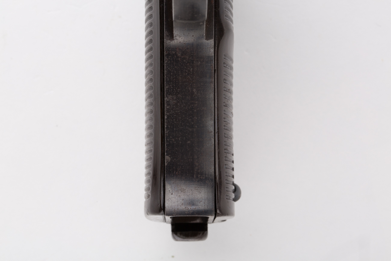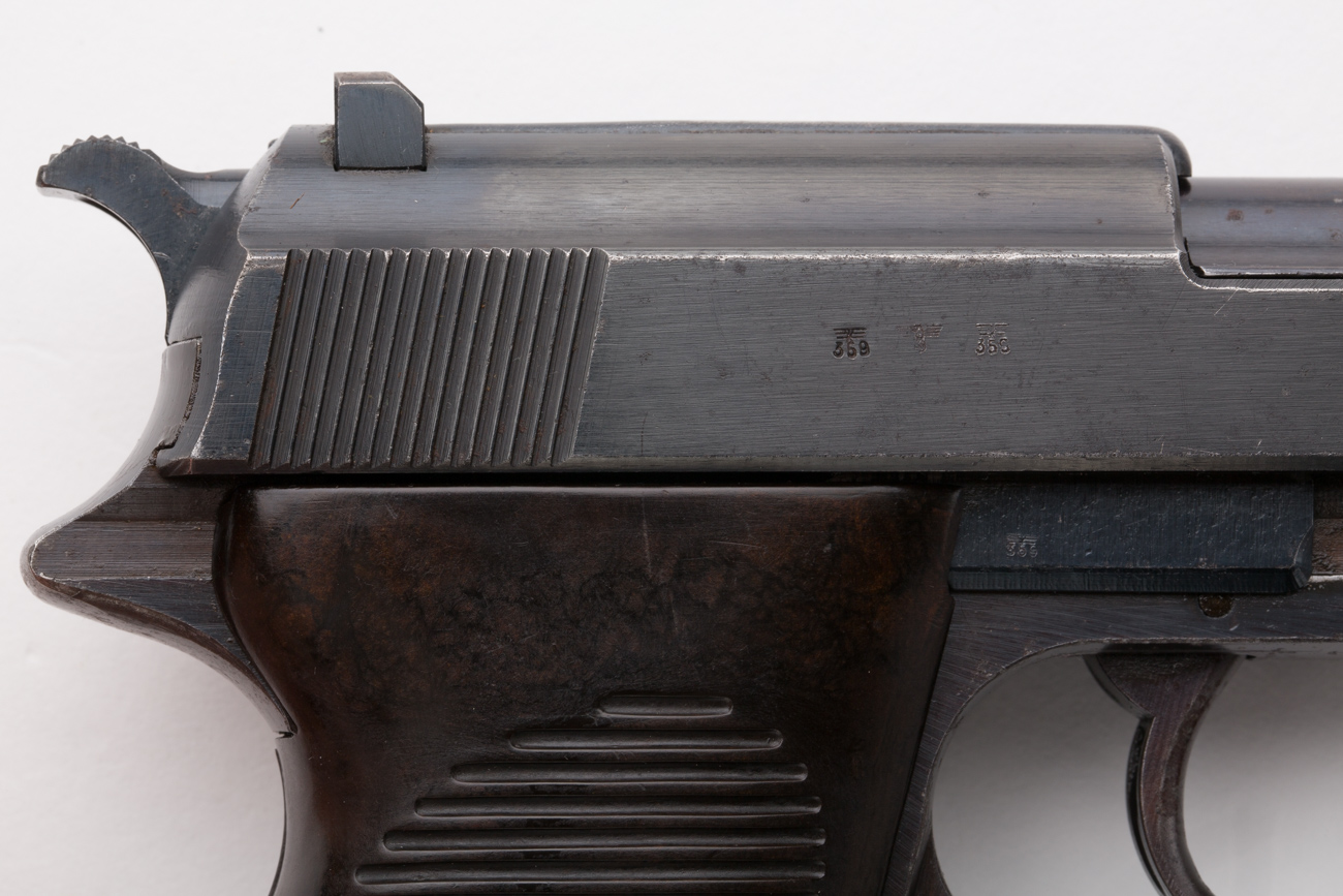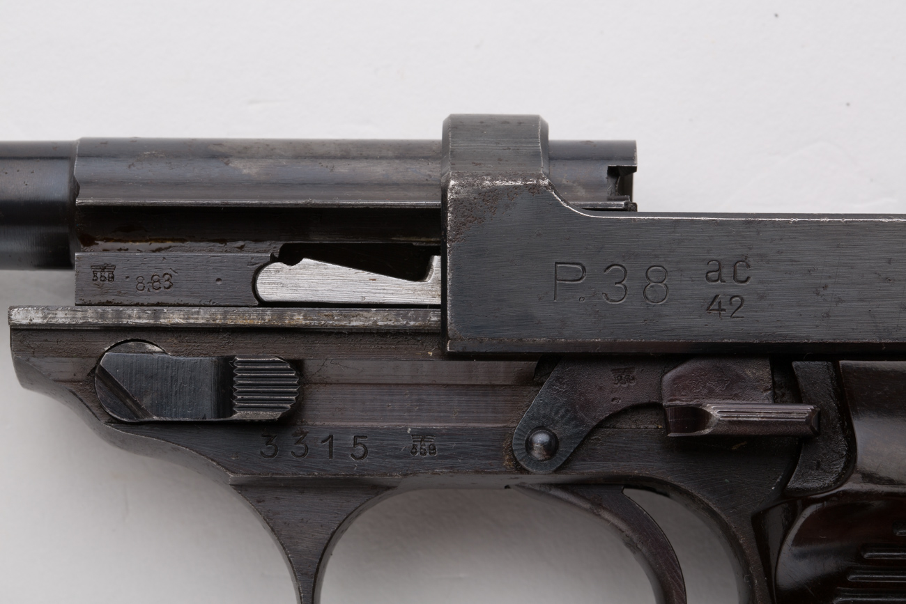 9/29/17 – This is an all original and matching Walther P.38. It is a first variation ac 42 with no letter suffix, meaning it was manufactured in January of ’42. Bluing rates at about 94% with some patina and freckling on the slide, as well as muzzle wear. Small parts are E/359 proofed. Excellent brownish grips and mint bore.