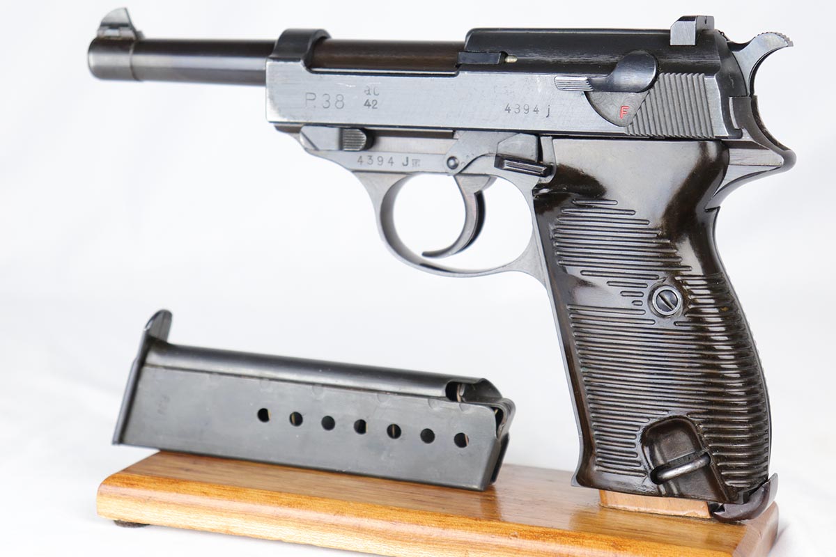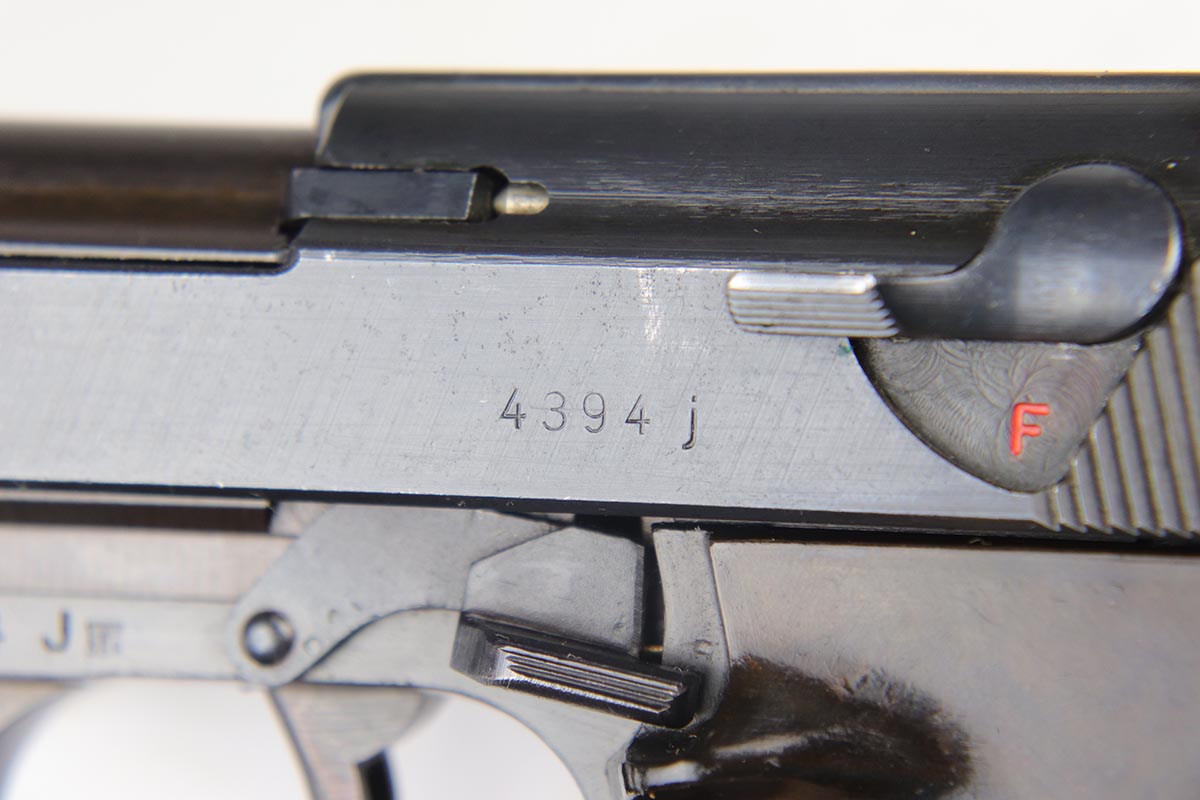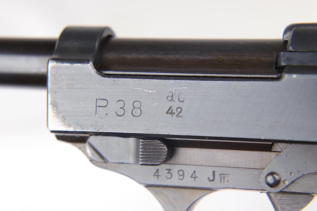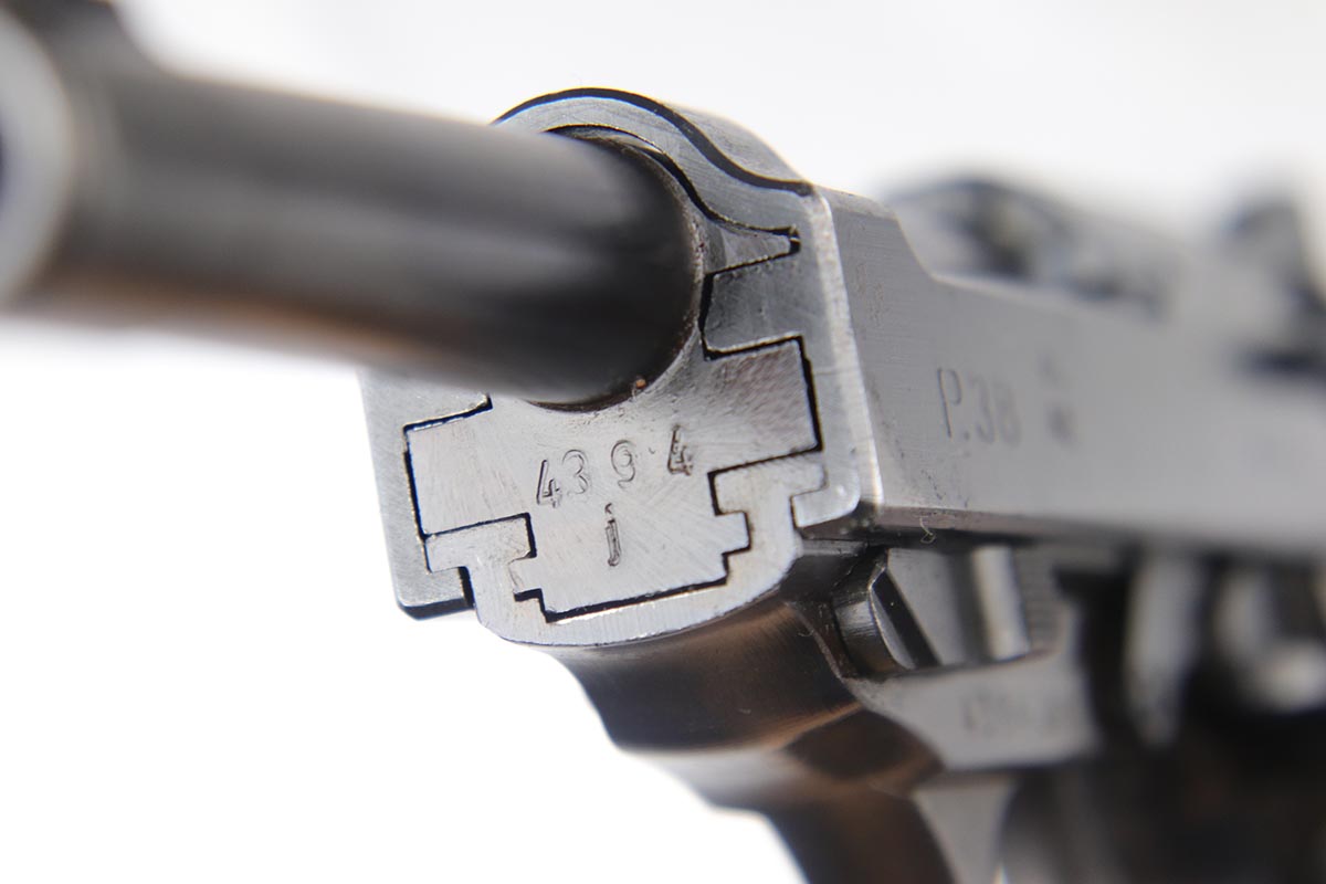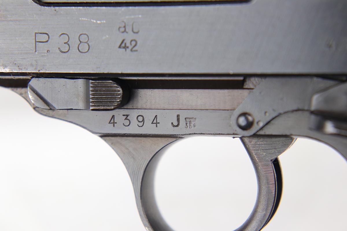 6/5/18 – This is an all matching and original Walther P.38 from November of 1942. The finish rates at about 97% with most of the wear found on the front edge of the left side of the slide. Excellent grips and bore. Early Walther magazine with two waffen marks on spine.