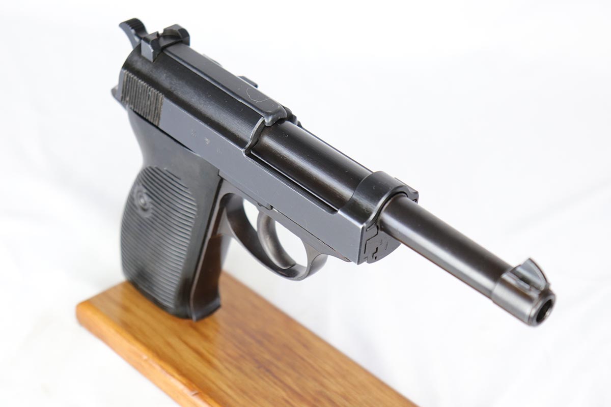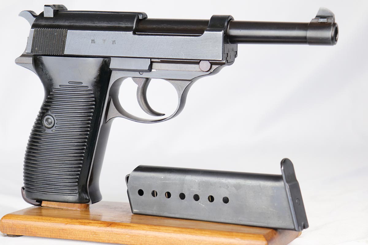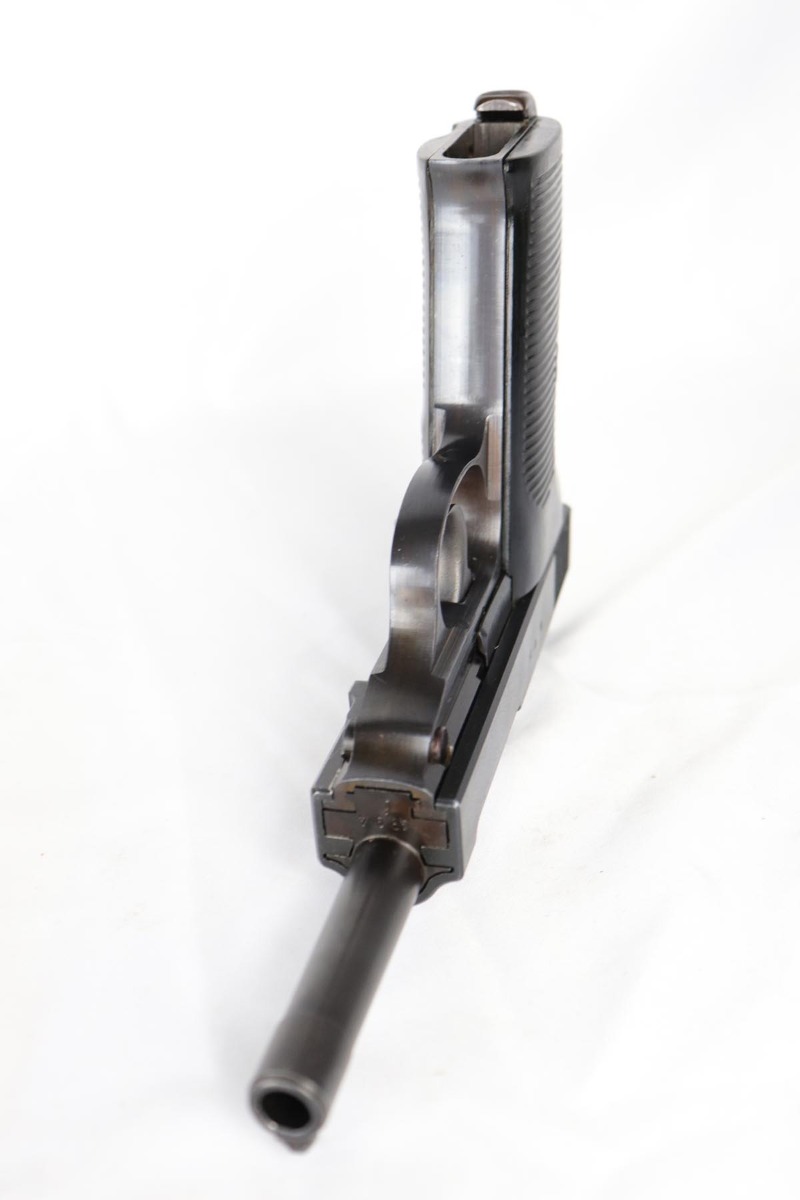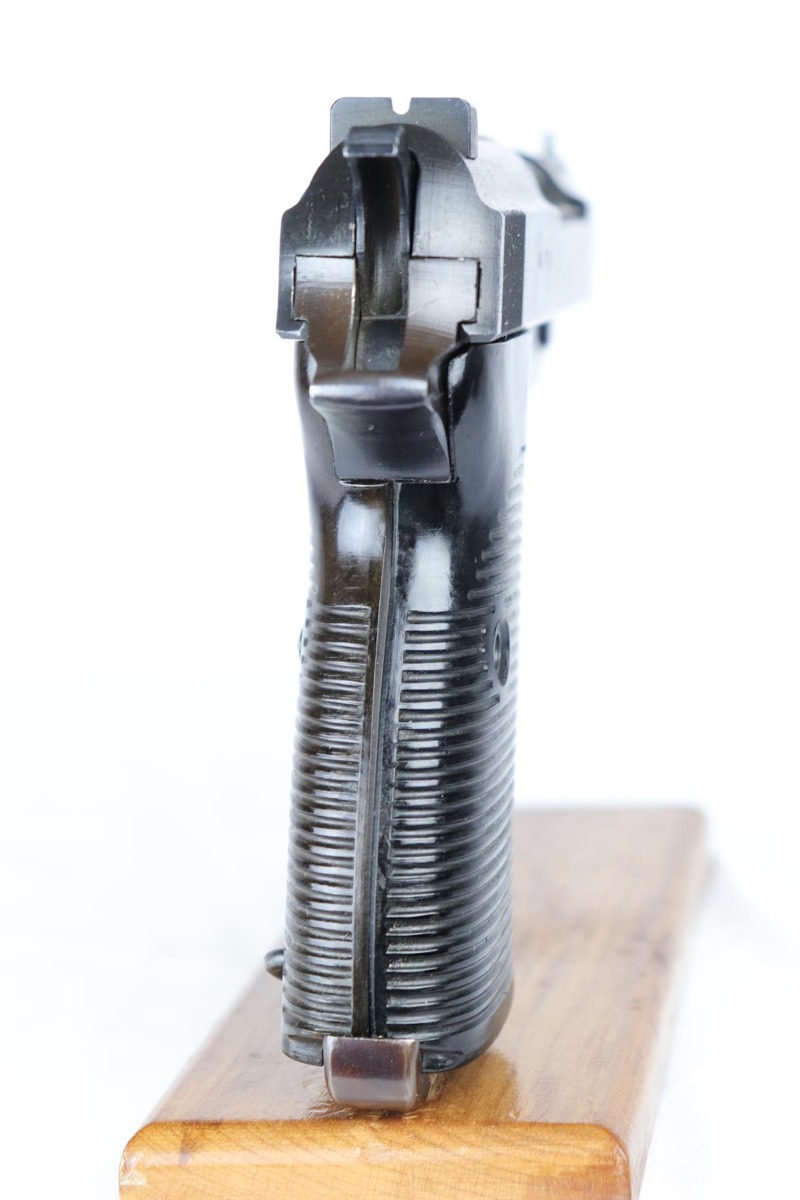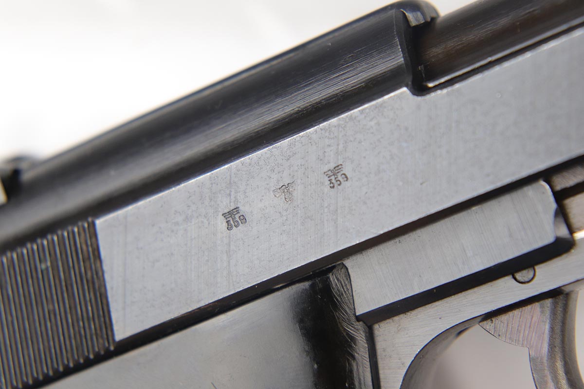 6/5/18 – This is an all matching and original Walther P.38 from November of 1942. The finish rates at about 97% with most of the wear found on the front edge of the left side of the slide. Excellent grips and bore. Early Walther magazine with two waffen marks on spine.