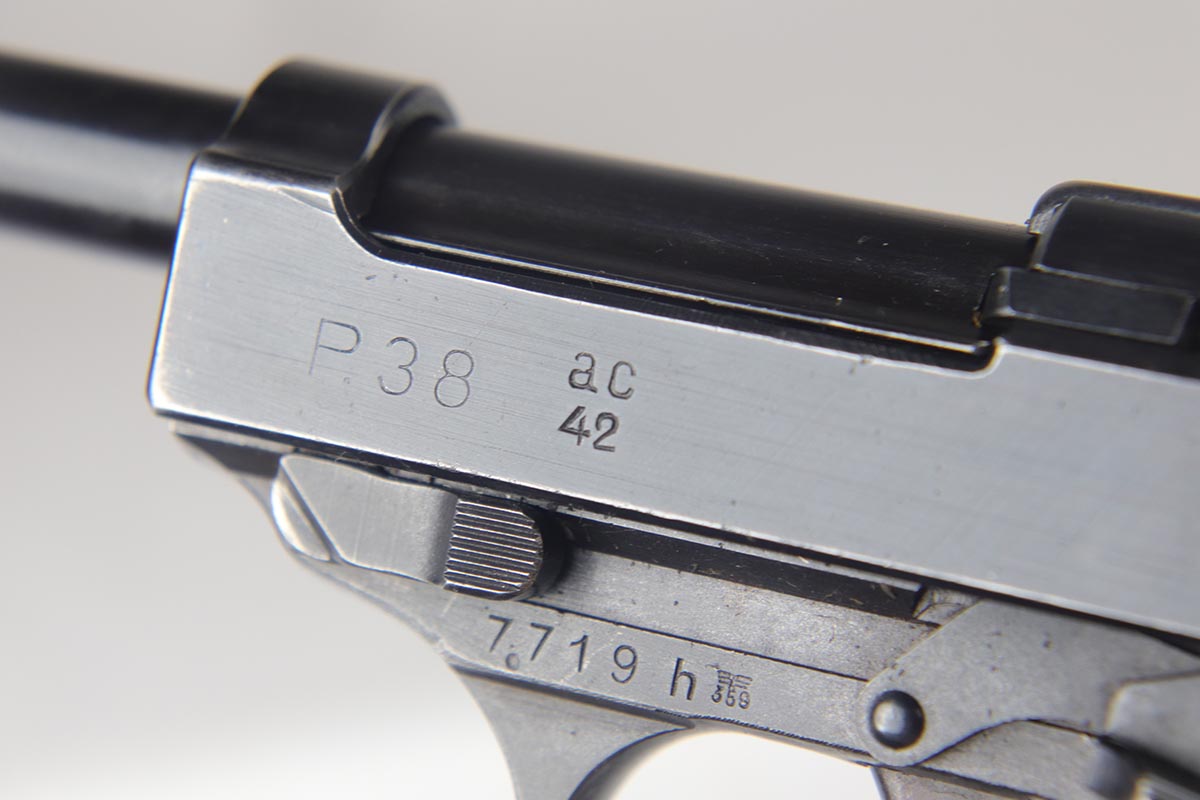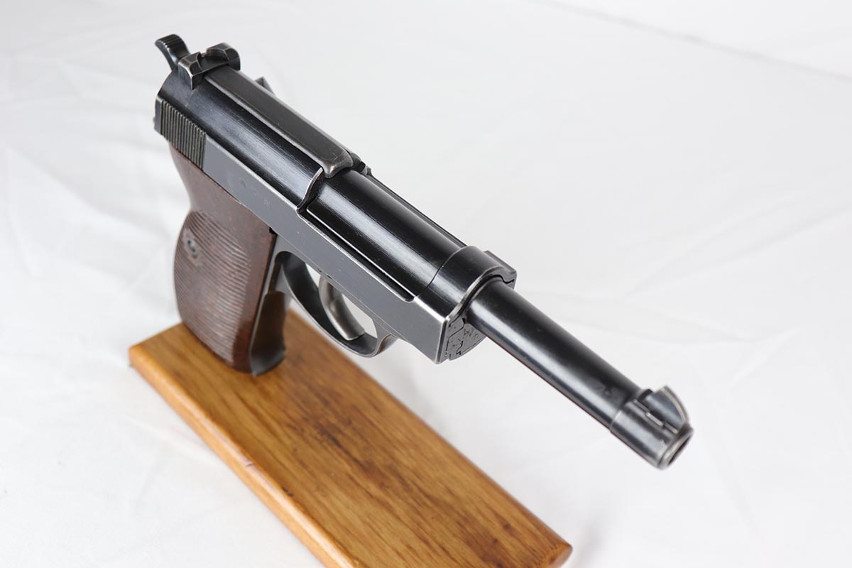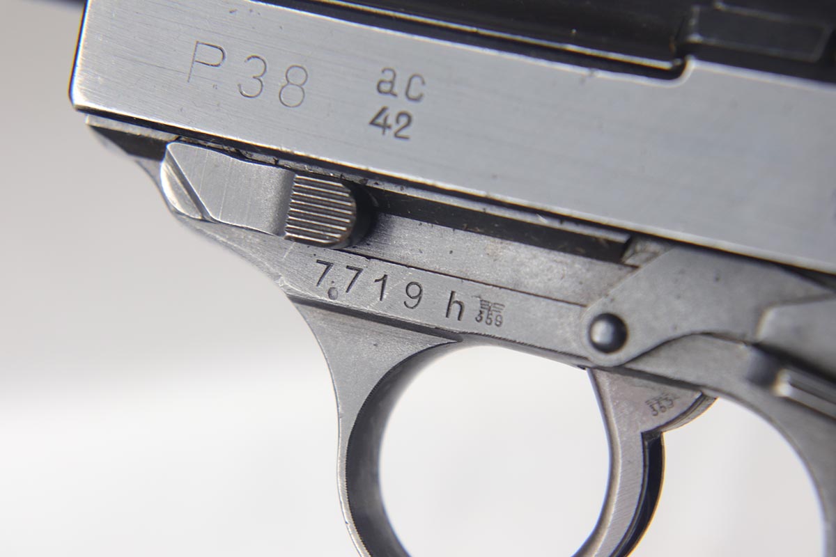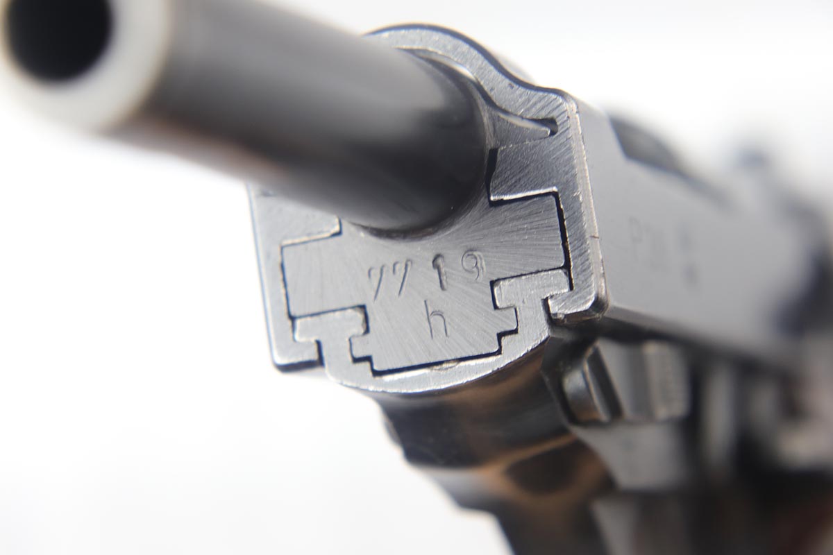 8/23/18 – This is a nice Walther P.38, produced in 1942. The gun has about 96% of its original, dull military finish. The wear is generally high edge wear, found on either side of the muzzle and front edge of the slide. Magazine is E/359 proofed on the spine. Very nice reddish grips with no cracks or scratches. Bore is shiny with good rifling.