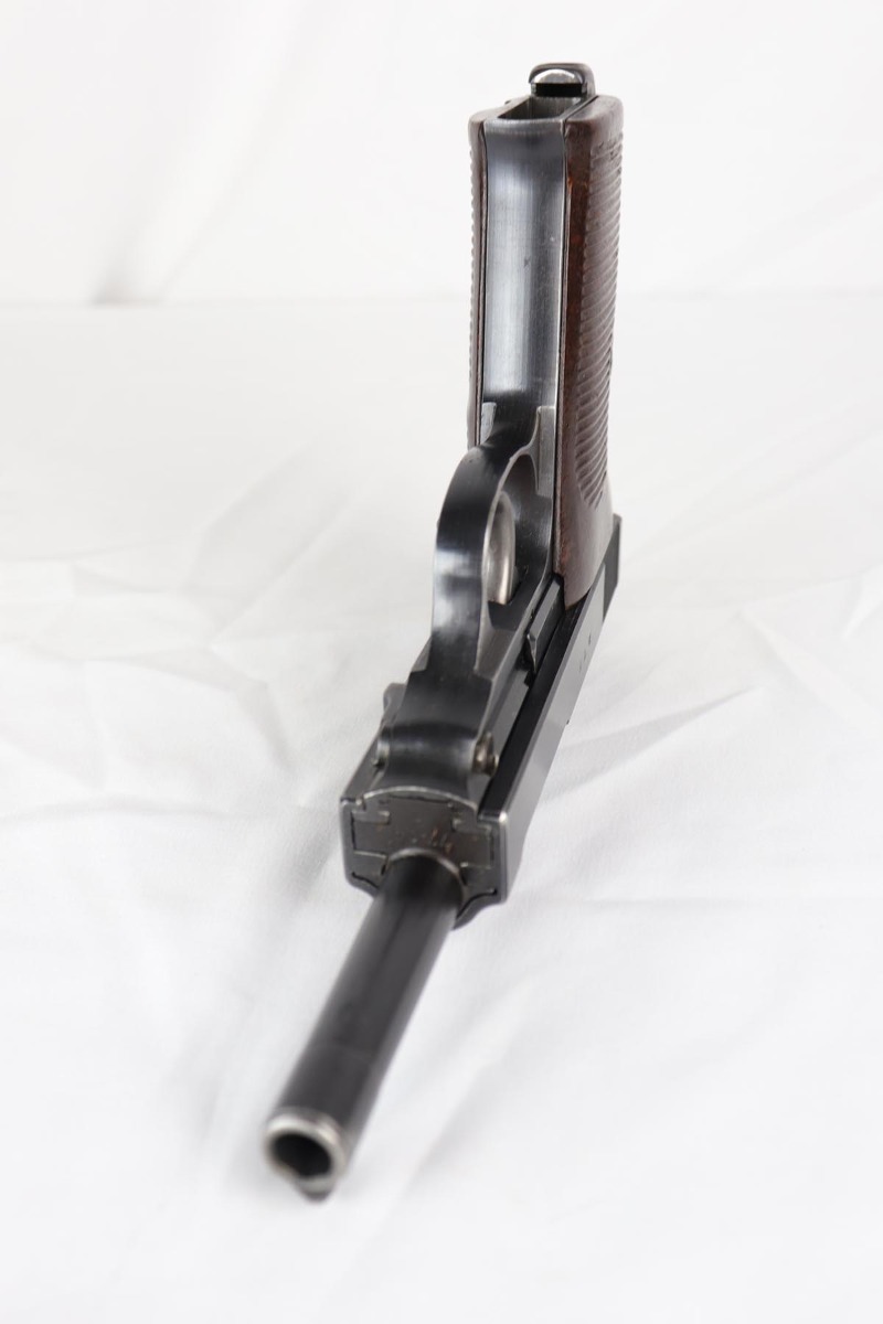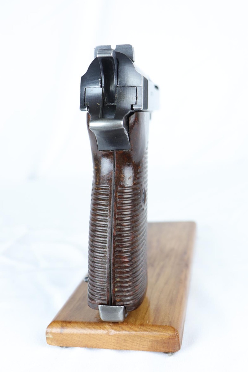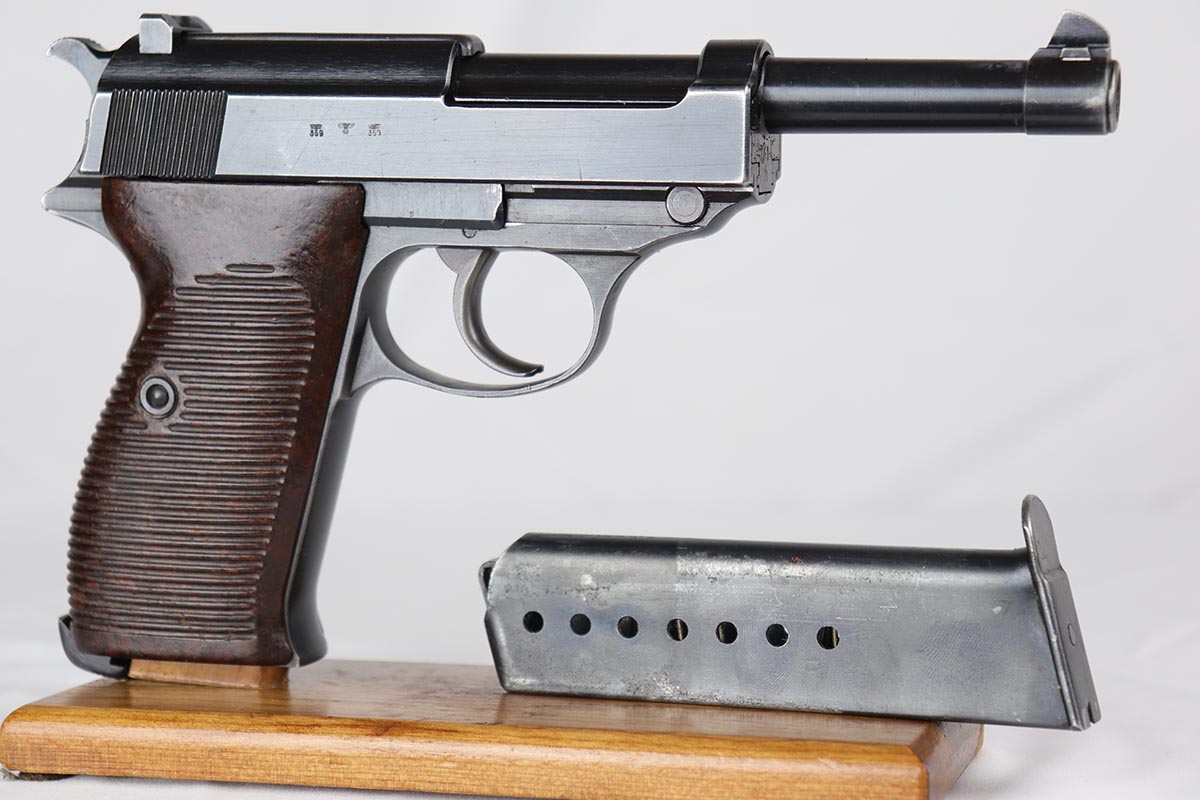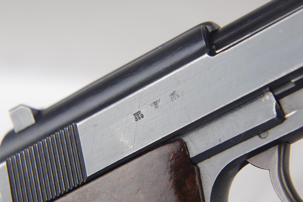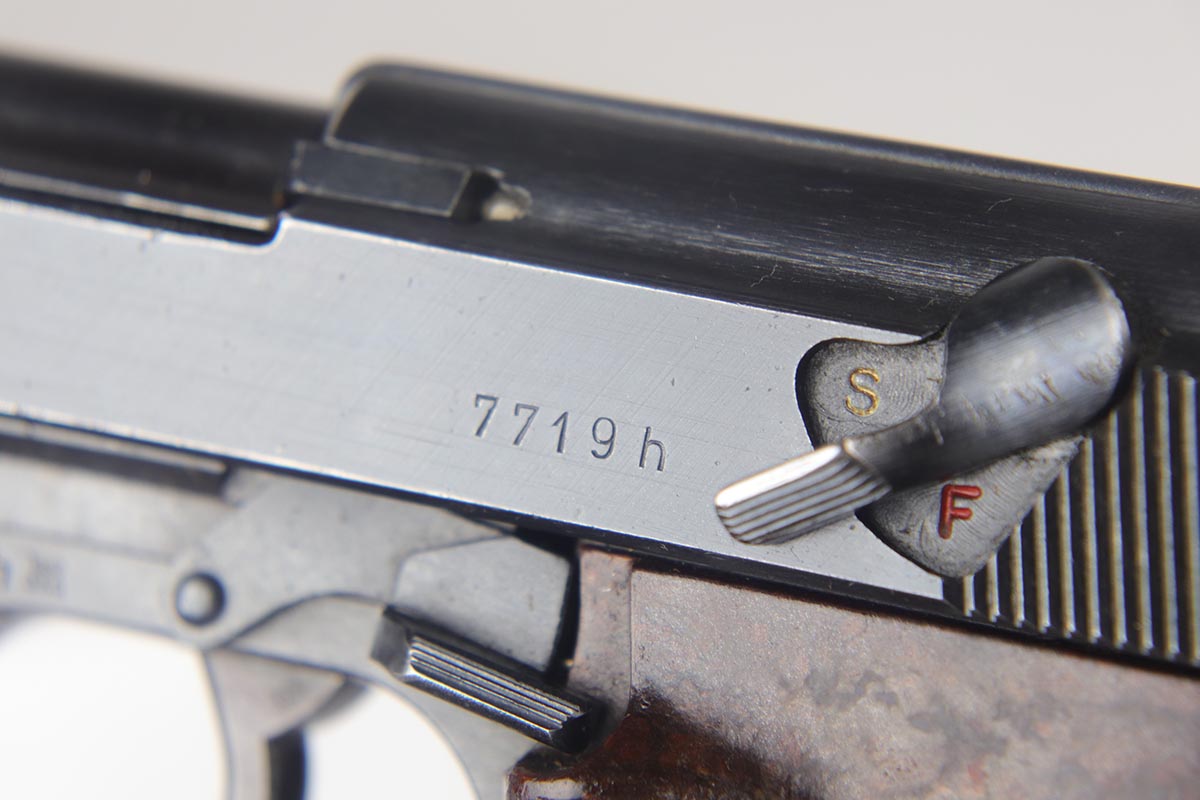 8/23/18 – This is a nice Walther P.38, produced in 1942. The gun has about 96% of its original, dull military finish. The wear is generally high edge wear, found on either side of the muzzle and front edge of the slide. Magazine is E/359 proofed on the spine. Very nice reddish grips with no cracks or scratches. Bore is shiny with good rifling.
