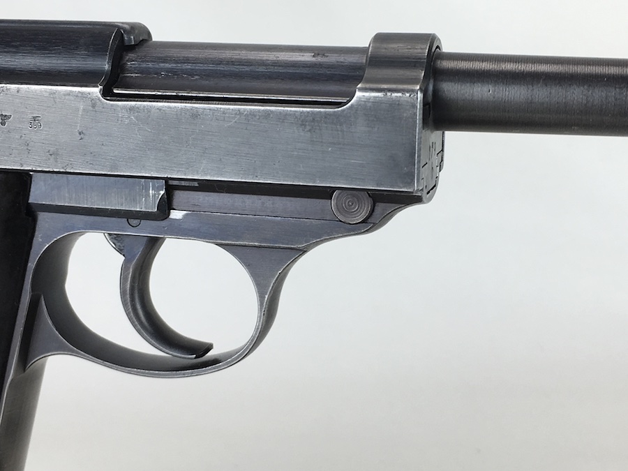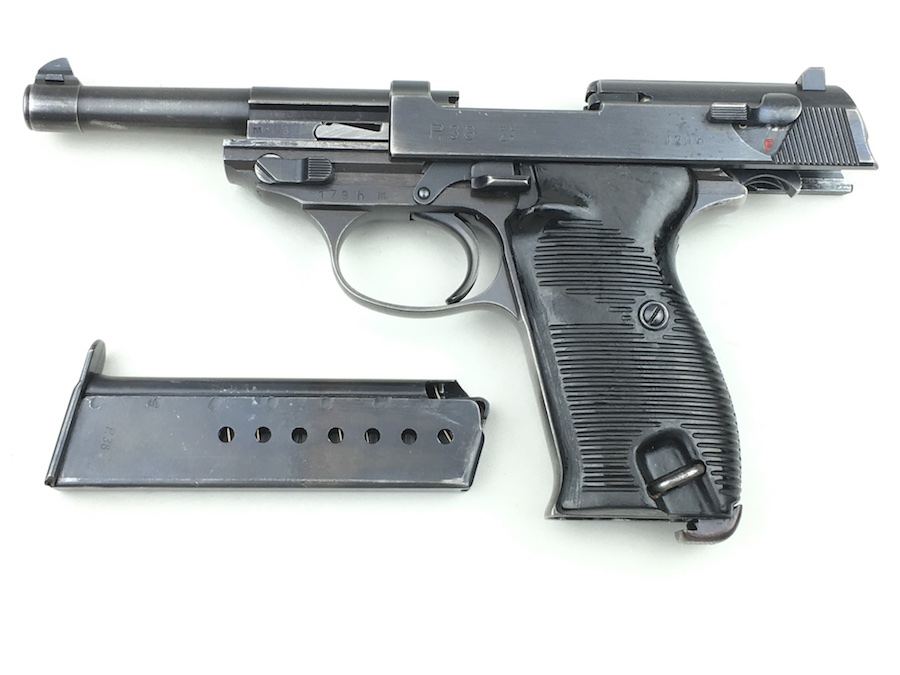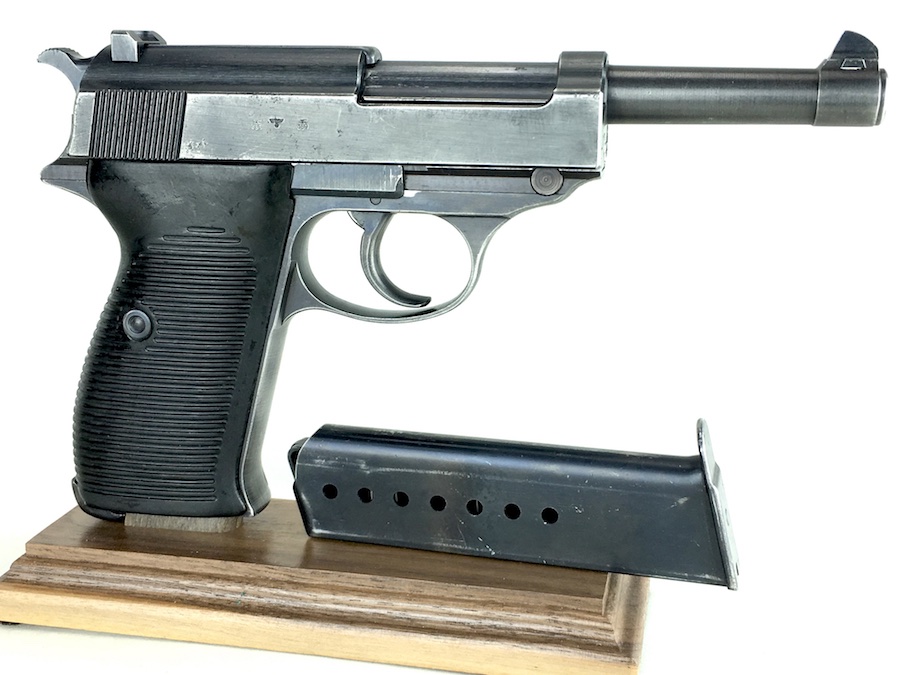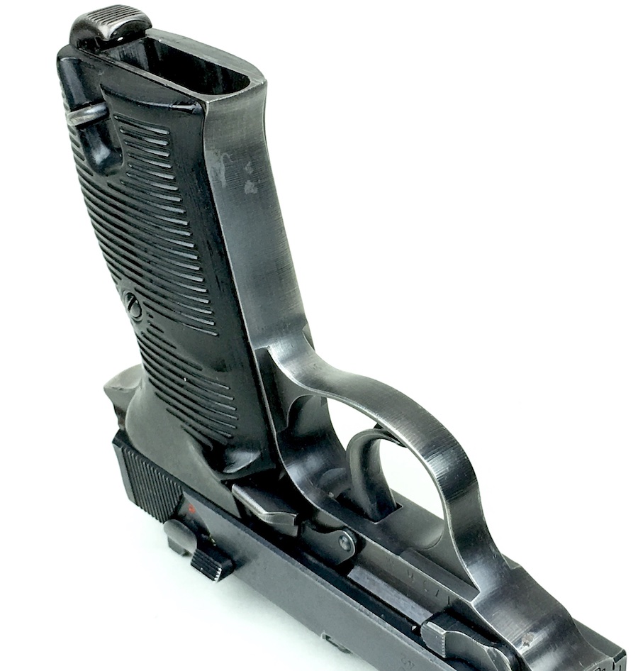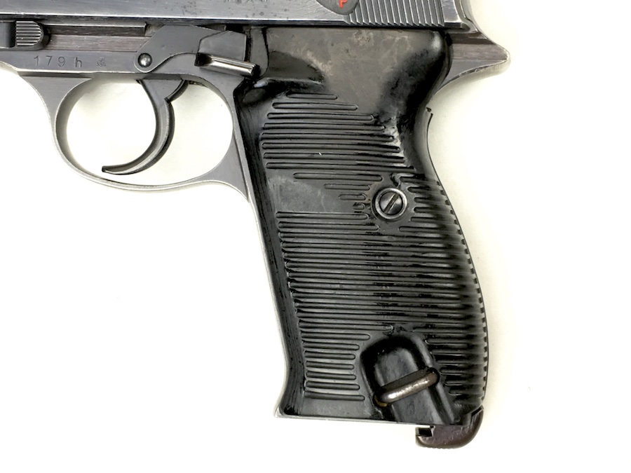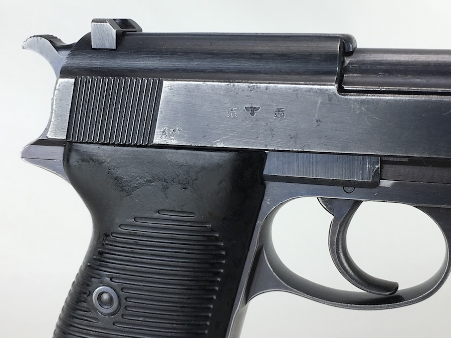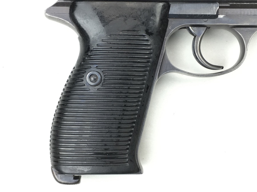 8/26/19 – This is a nice Walther P.38, produced in 1942. This all matching gun has about 90-93% of its original, dull military finish. The wear is generally high edge wear, found on either side of the muzzle and front edge of the slide. Also some minor speckling found on the slide as shown in photos. Front strap has a few spots of discoloration as well. Magazine is E/359 proofed on the spine. Very nice deep brown, nearly black grips with no cracks or scratches. Bore is shiny with good rifling with minor areas of pitting, resulting in a 7.5/10 overall rating. Mechanically sound with smooth action.
