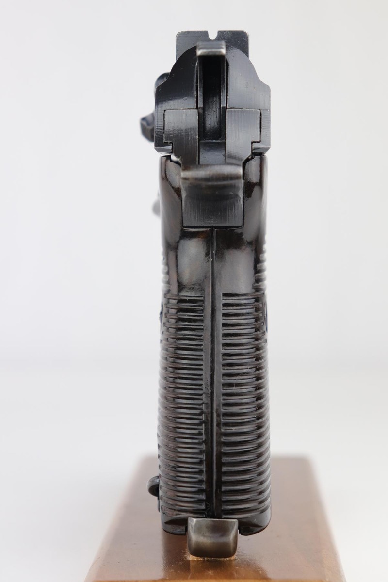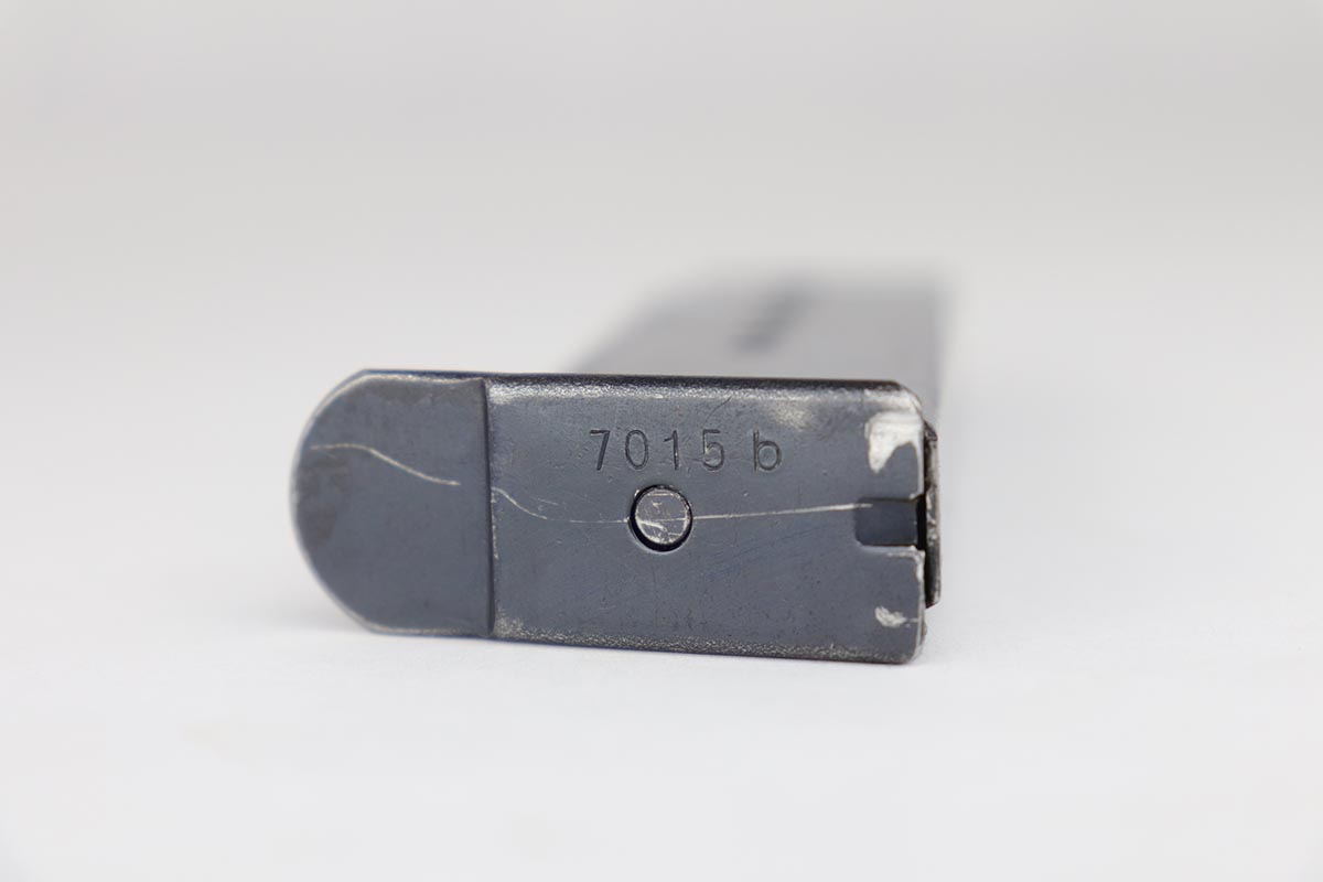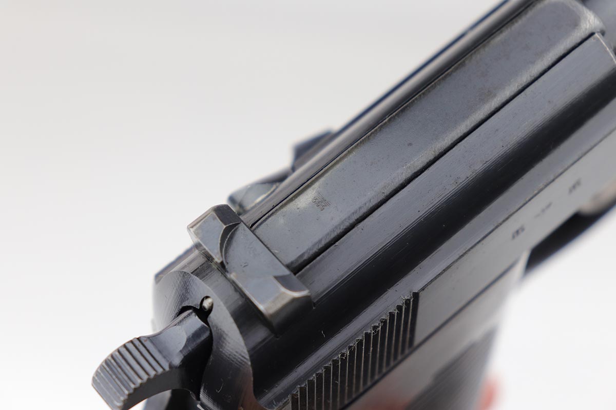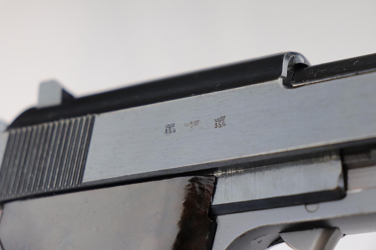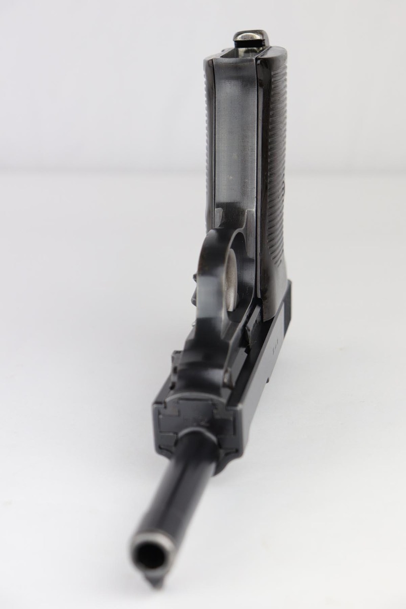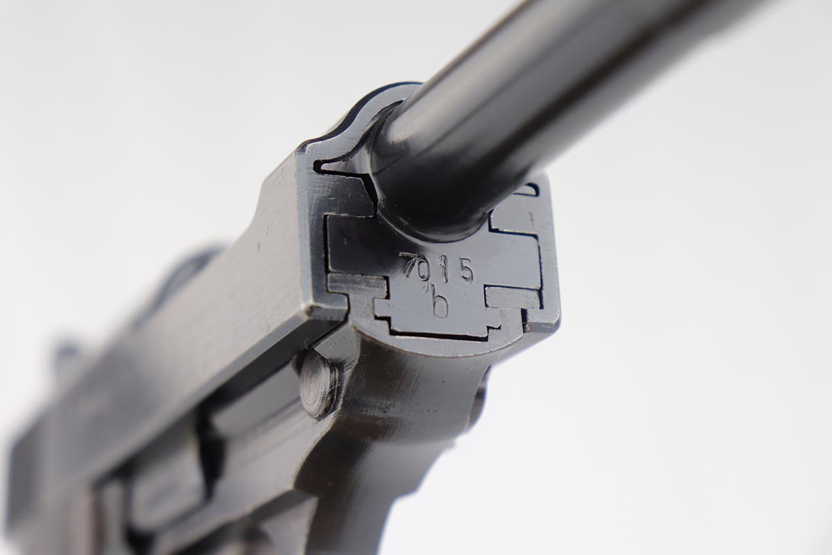 7/1/19 – This is an excellent example of a Nazi Walther P.38, manufactured in March of 1942, with one of the original, matching magazines! The pistol is all matching and correct, with 95-96% blue remaining. There’s muzzle wear on both sides of the barrel, and minor edge thinning throughout. The left side of the slide also shows minor pinpricking in a few areas. Excellent brown grips, which are unmarked. Magazine is factory numbered and matching the gun. Note that the safety on this pistol does not work, neither as a safety or de-cocker. Terrific bore.