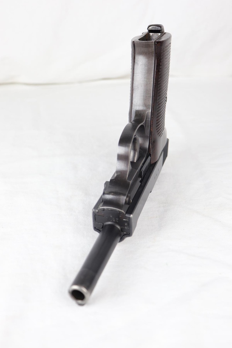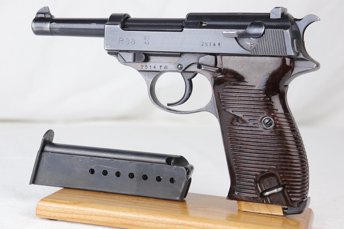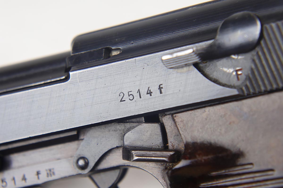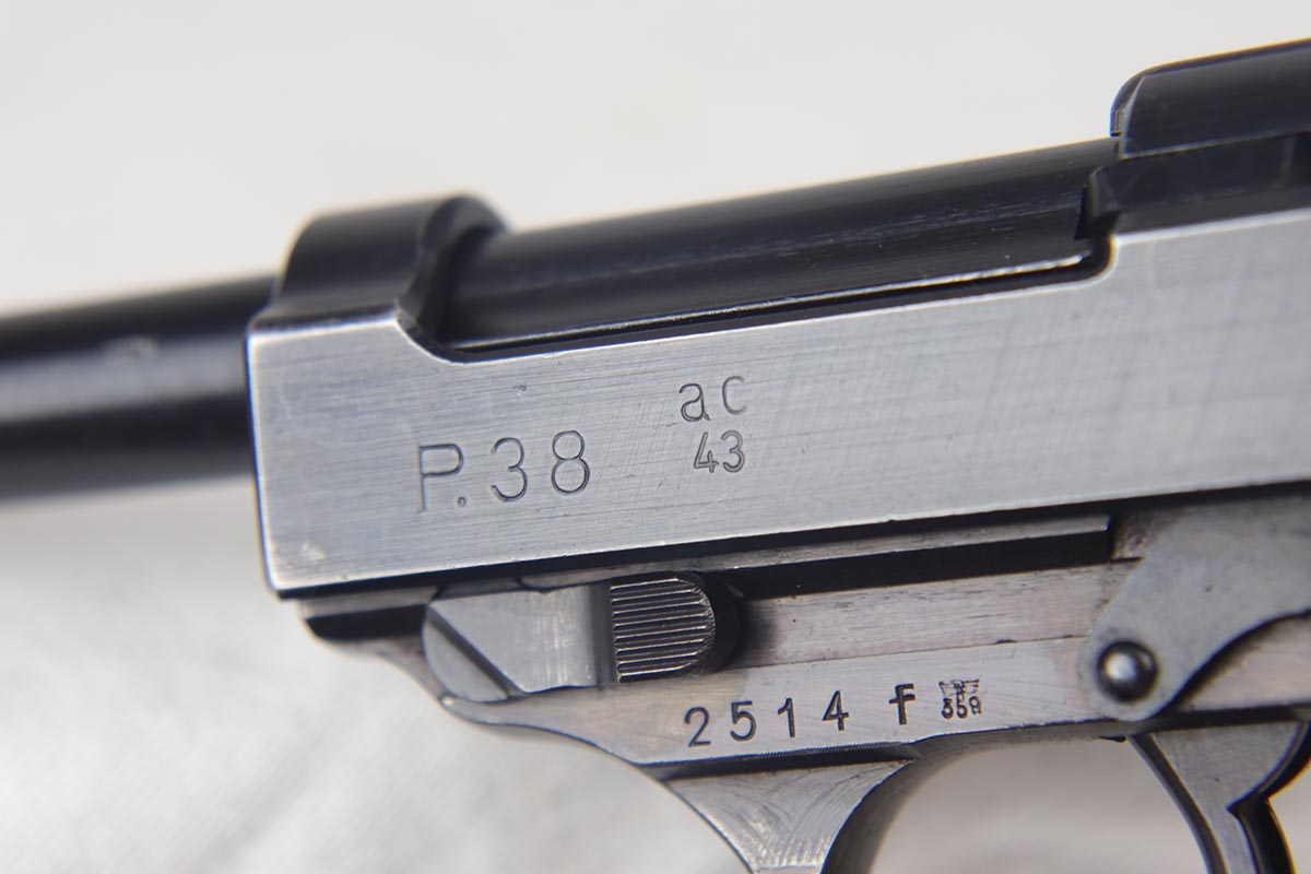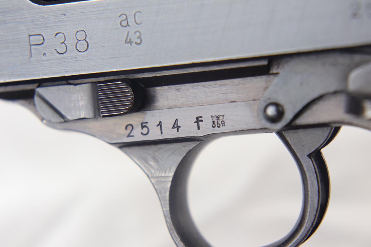 7/23/18 – This is an all matching and original Walther P.38 with stacked ‘ac 43’ marking on slide.  The original finish rates at 90+% with a thin front strap, as well as some minor high edge wear and some finish loss on the left side of the barrel.  Comes with excellent brown grips and a Walther magazine.  Minty bore.