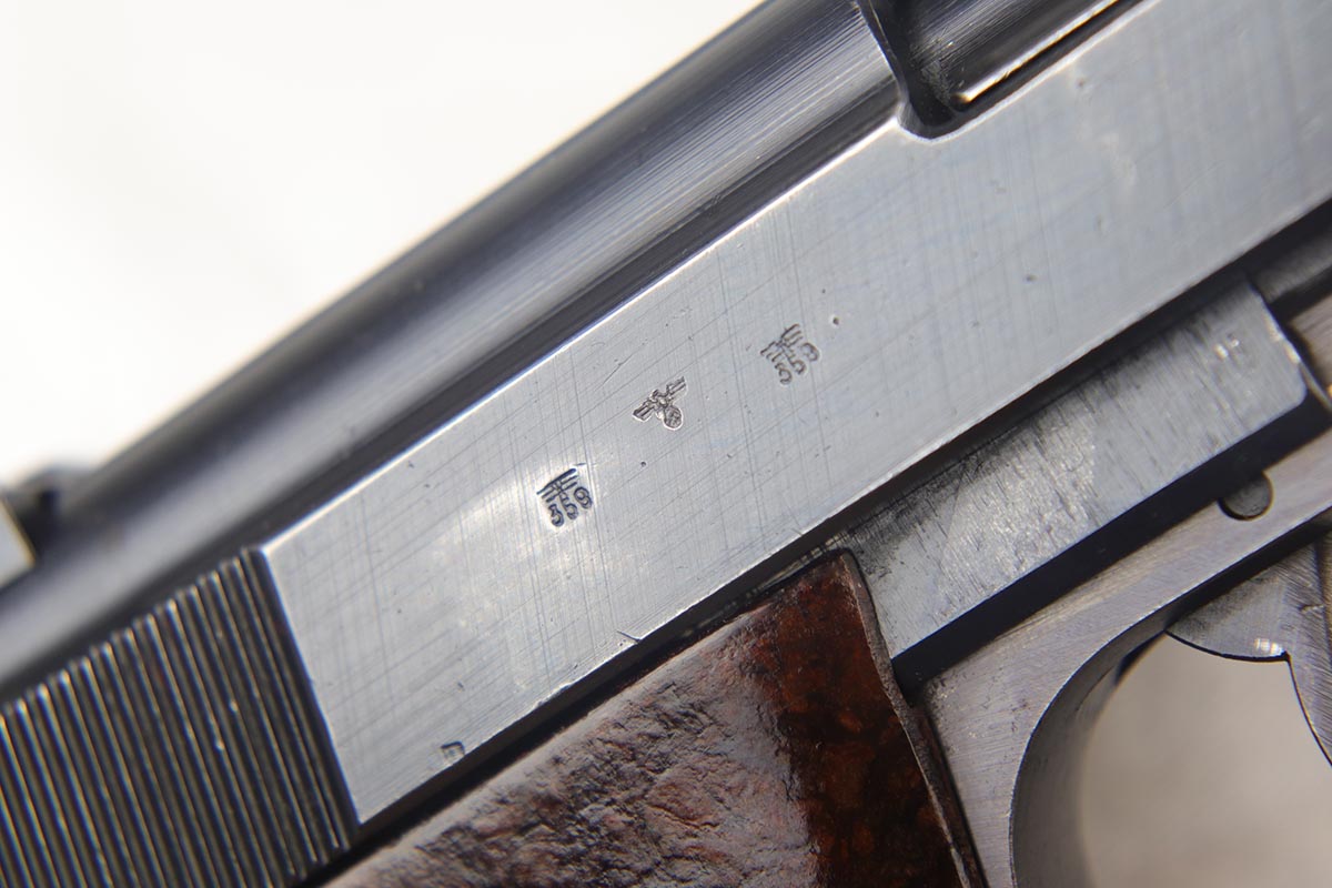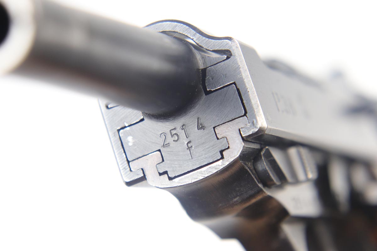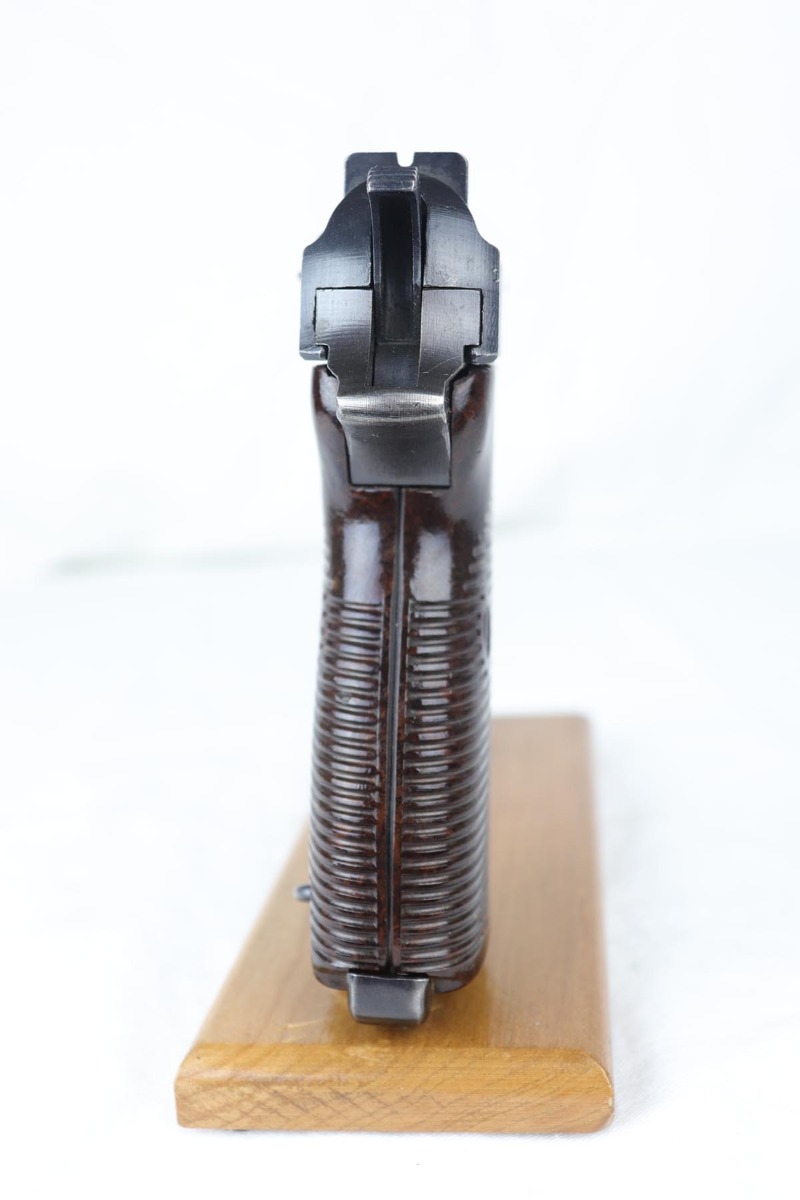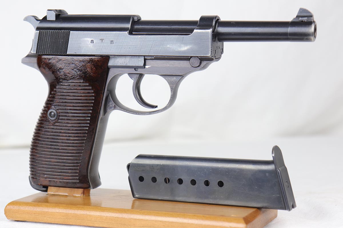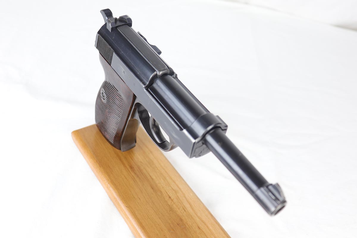 7/23/18 – This is an all matching and original Walther P.38 with stacked ‘ac 43’ marking on slide.  The original finish rates at 90+% with a thin front strap, as well as some minor high edge wear and some finish loss on the left side of the barrel.  Comes with excellent brown grips and a Walther magazine.  Minty bore.