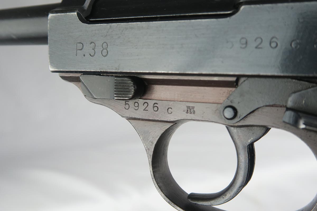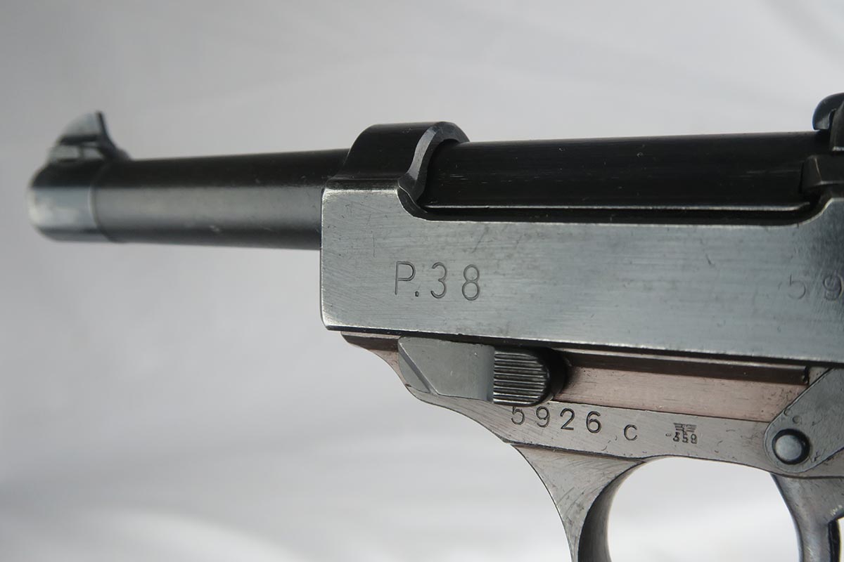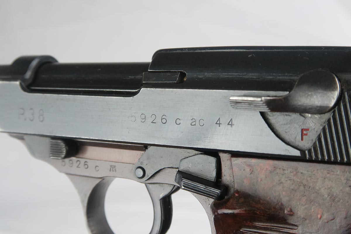 10/2/17 – This is a nice, original Walther P.38 from 1944.  It is all matching and correct with 95-97% blue remaining.  The slide is beautiful but there is minor muzzle wear and some thinning on the front strap.  Minty bore and excellent grips.