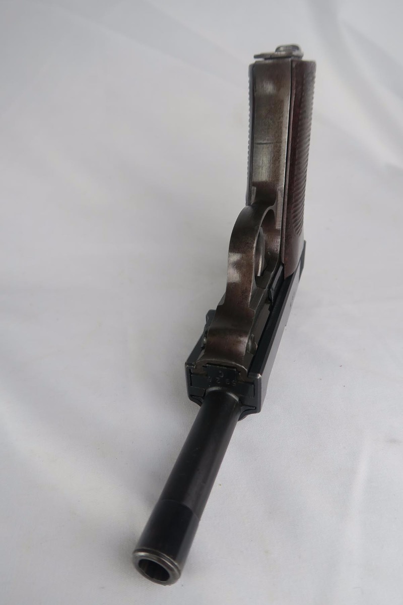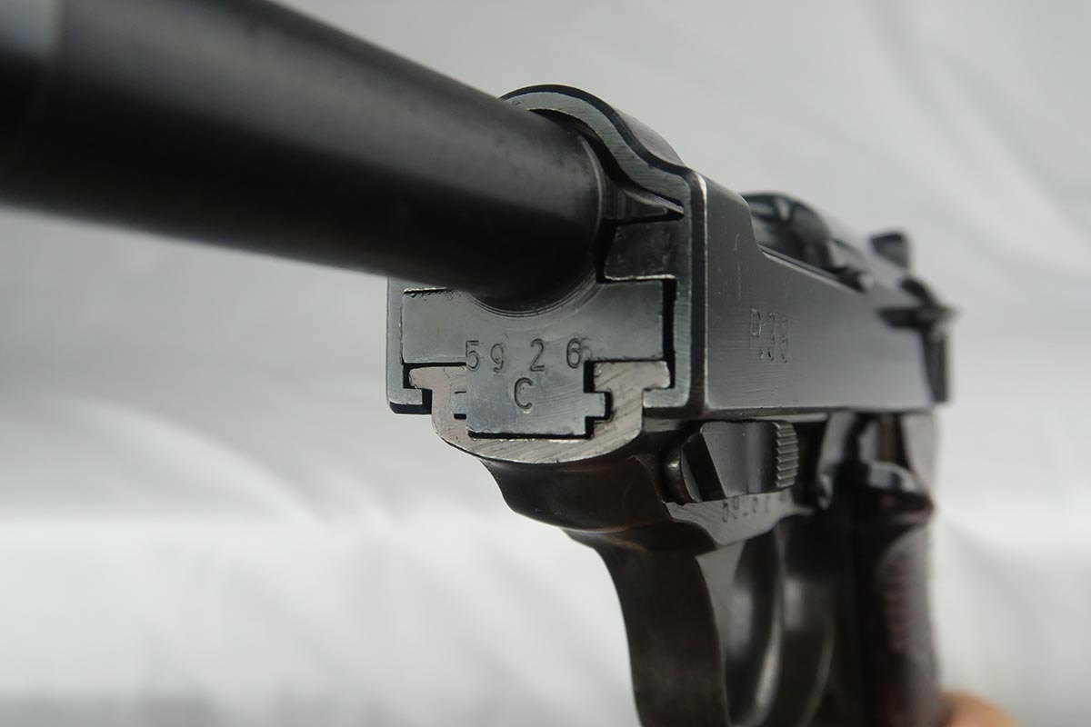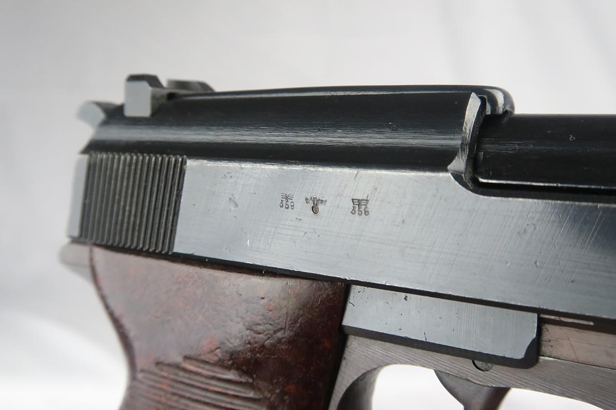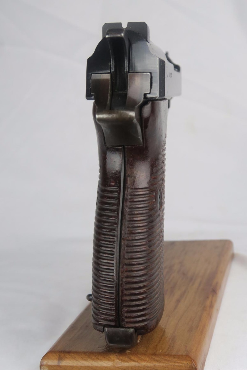 10/2/17 – This is a nice, original Walther P.38 from 1944.  It is all matching and correct with 95-97% blue remaining.  The slide is beautiful but there is minor muzzle wear and some thinning on the front strap.  Minty bore and excellent grips.
