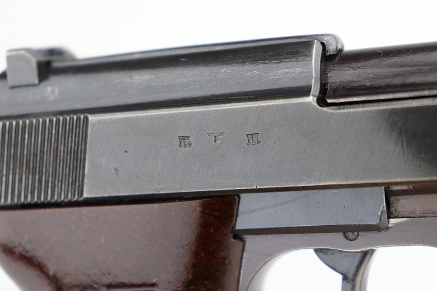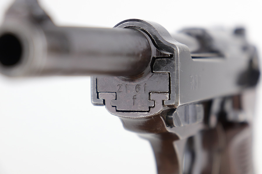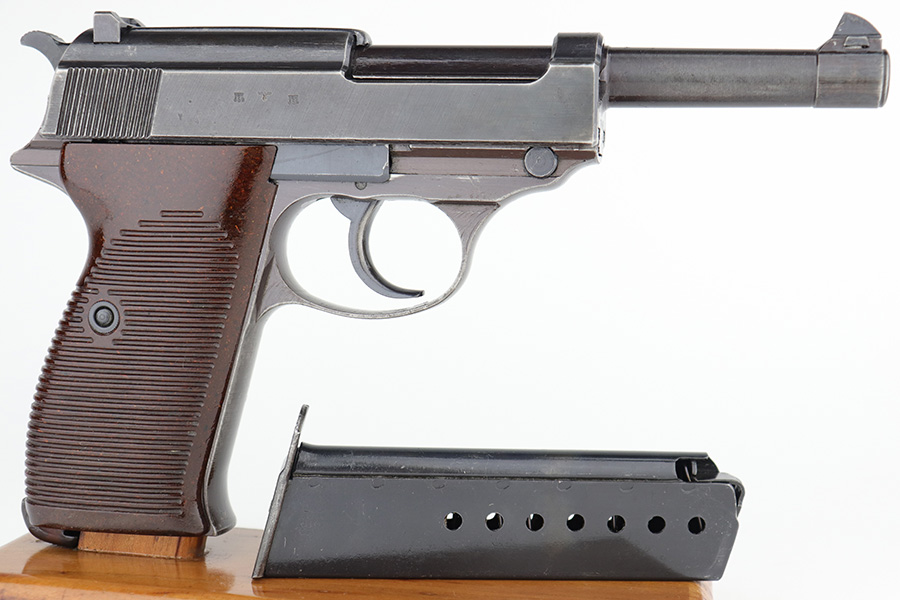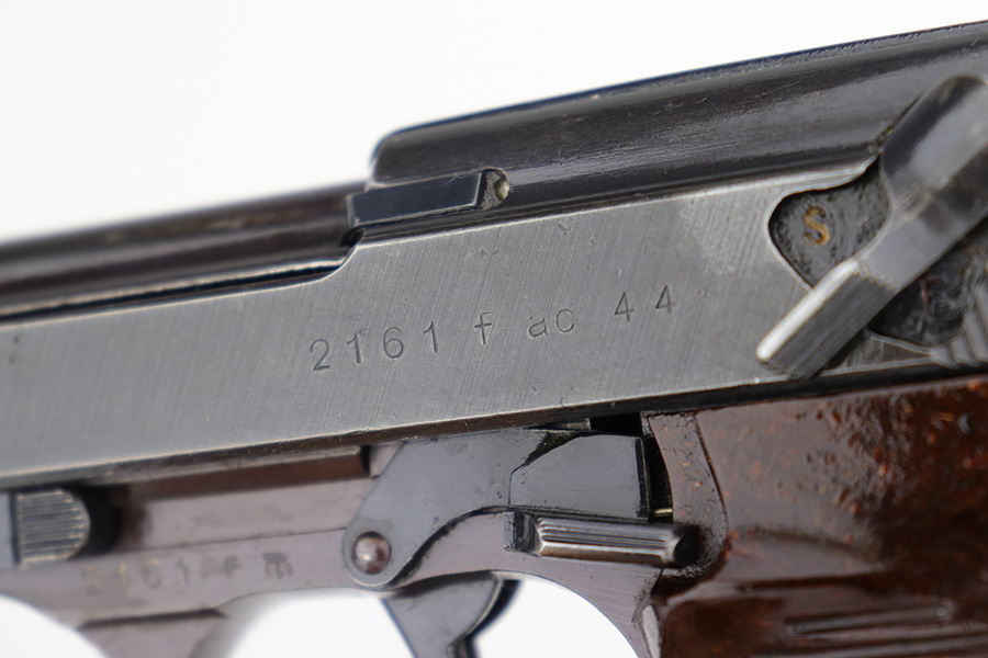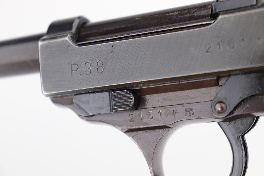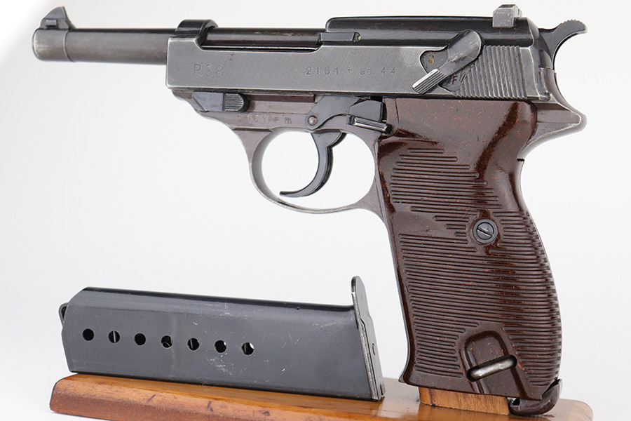 1/5/23 – This is a matching and original Walther P.38 from June of 1944. Most of the wear is on the front strap with a little more on the high edges. Nice plum tone to the frame. Strong, shiny bore. Good mechanics, including the de-cocker. Excellent reddish-brown Walther grips and a Walther mag.
