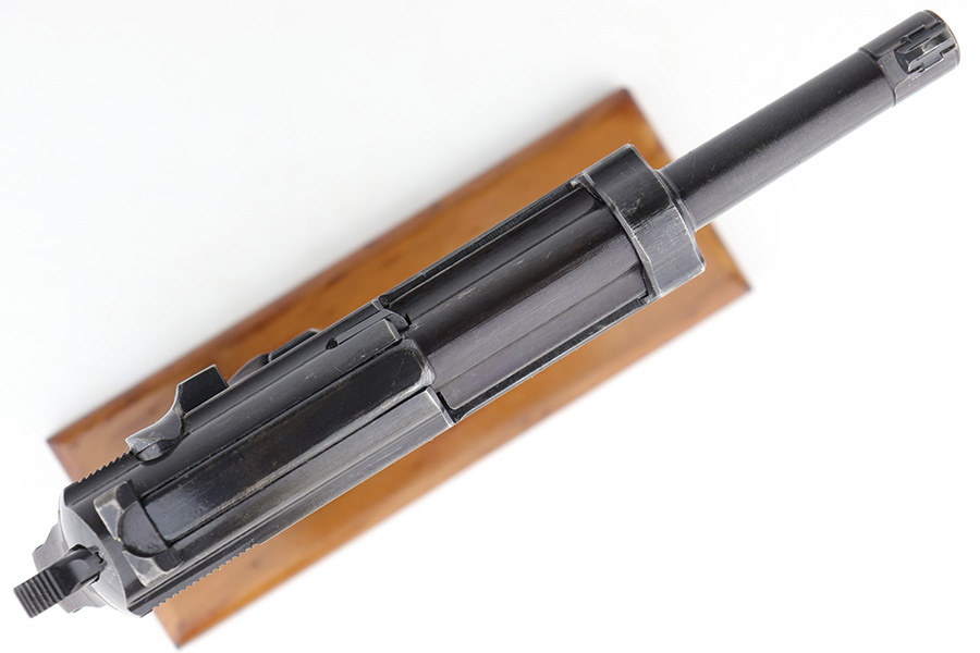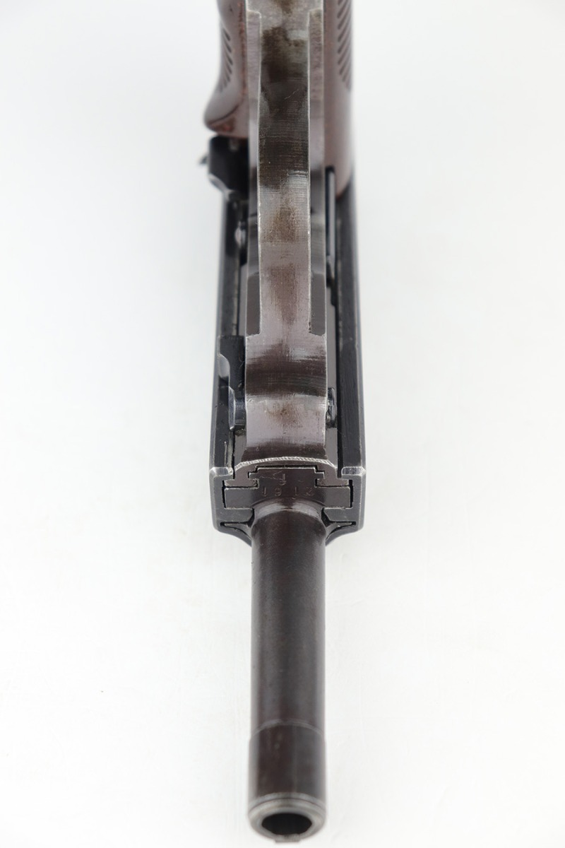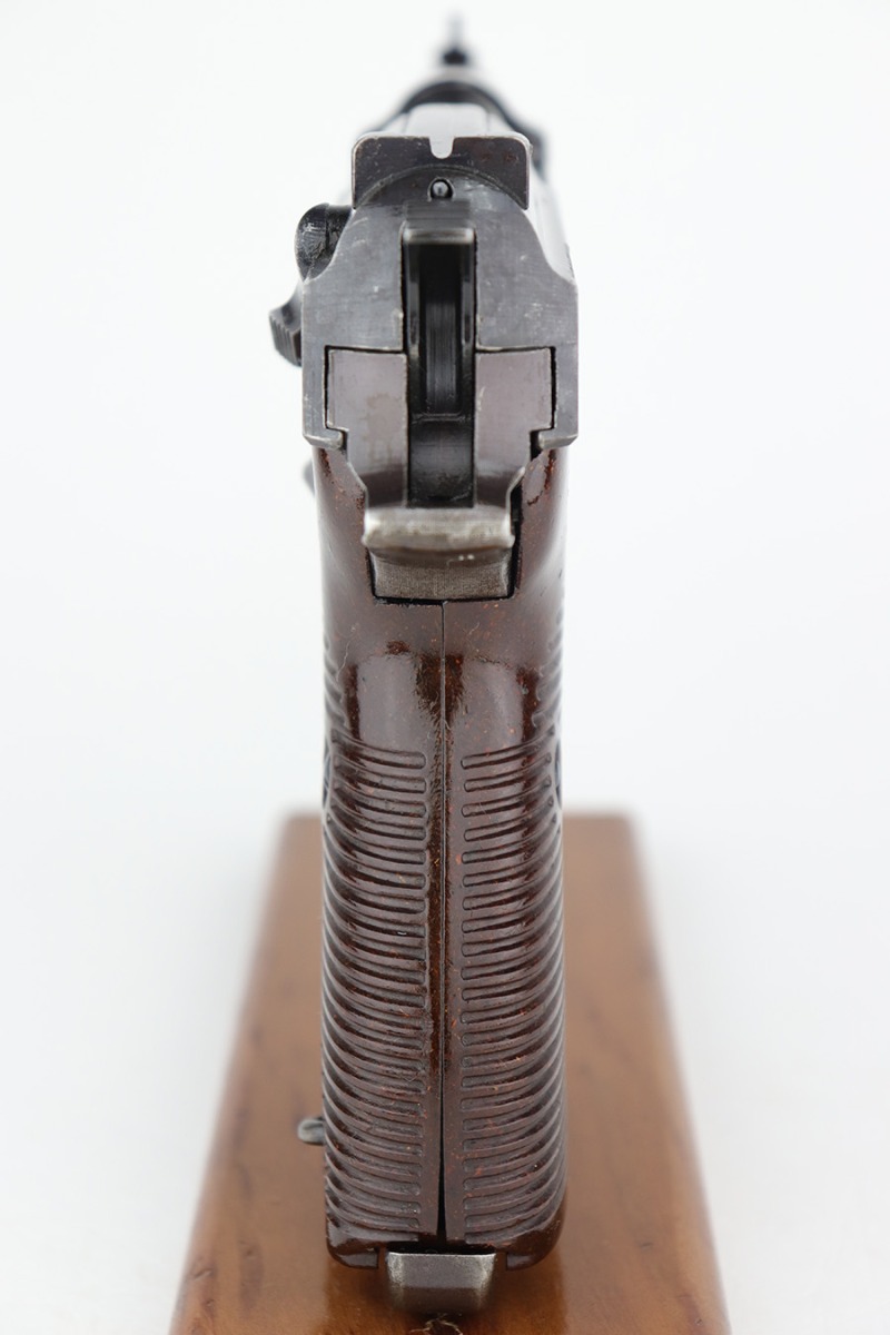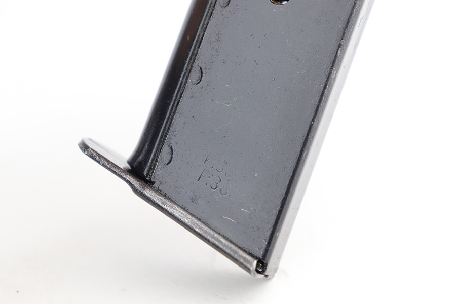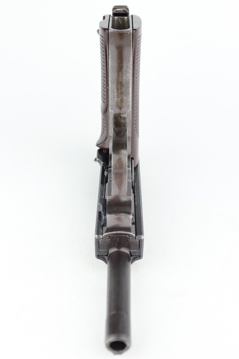1/5/23 – This is a matching and original Walther P.38 from June of 1944. Most of the wear is on the front strap with a little more on the high edges. Nice plum tone to the frame. Strong, shiny bore. Good mechanics, including the de-cocker. Excellent reddish-brown Walther grips and a Walther mag.