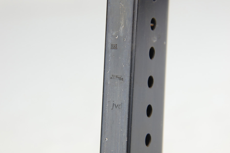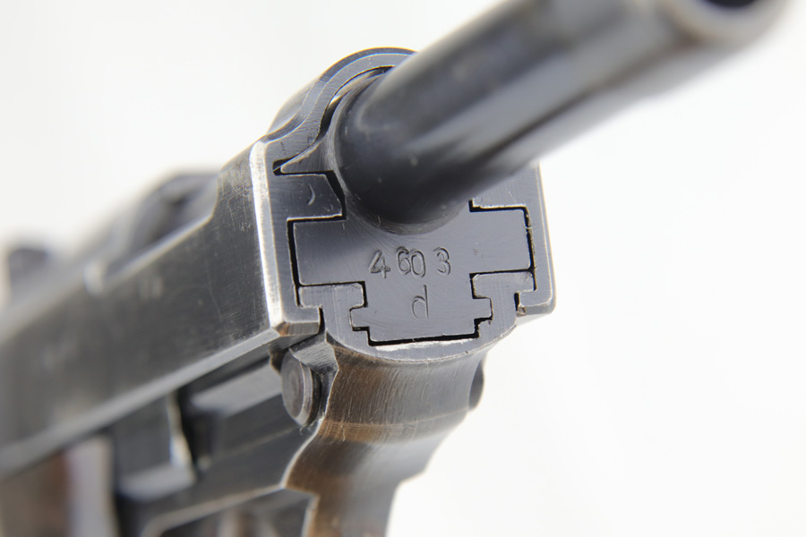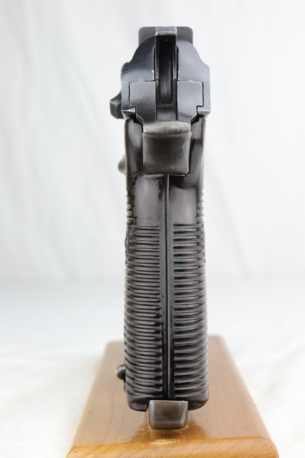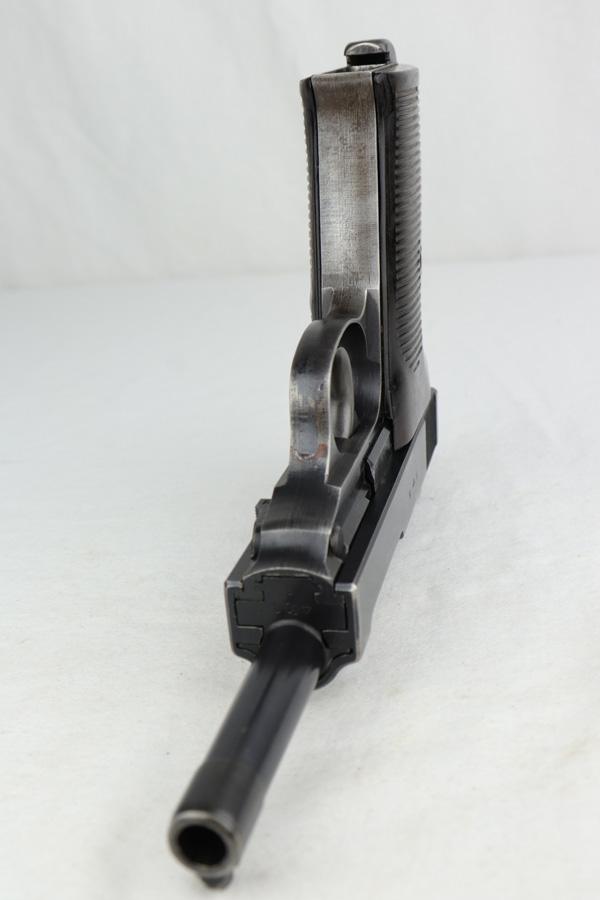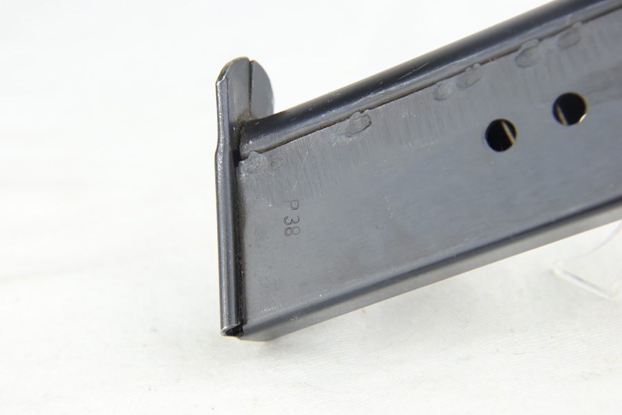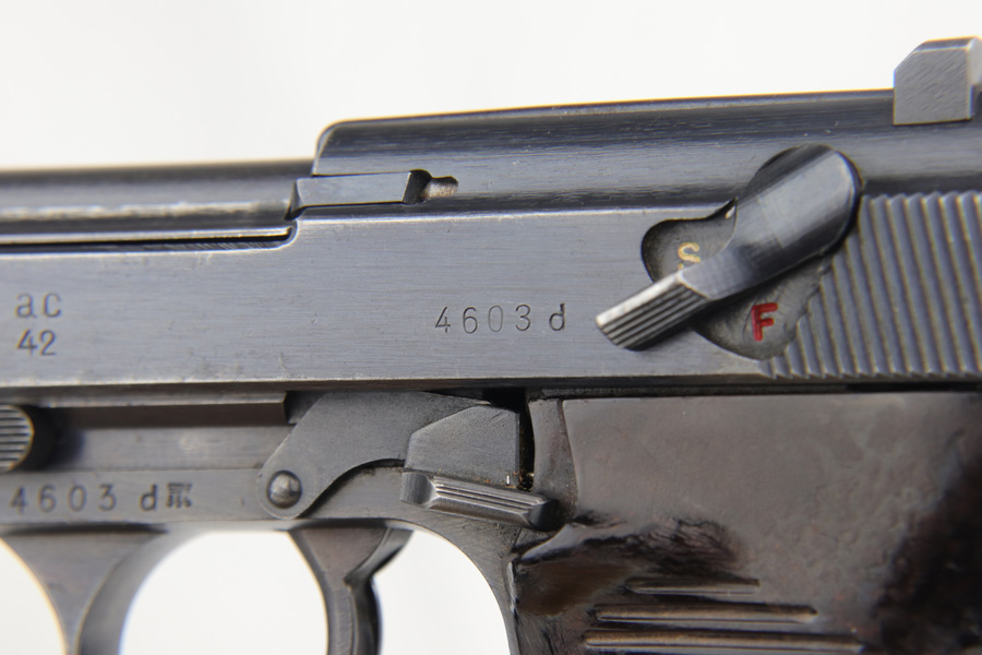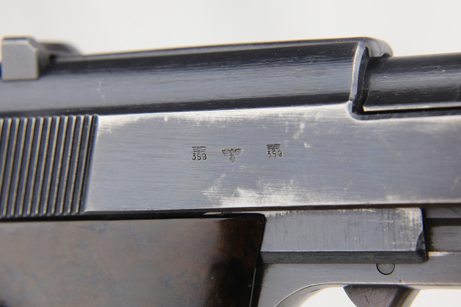 2/18/19 – This gun is a very nice example of a Nazi, Walther-made, 9mm, wartime P.38 (AC42). The finish is original (about 92-94%) with most of the bluing loss on the front strap. Otherwise, there is typical holster wear with no real rust or pitting. The gun has all matching parts, including the slide, frame, barrel and locking block. All of the parts are properly “eagle 359” military proofed including the magazine. The magazine is also “JVD” marked which means it was added later – most likely 1944. The grips are period correct. The gun functions very well, and the de-cocker works properly. The bore is excellent – shiny with good rifling (8/10). Guaranteed original and authentic.