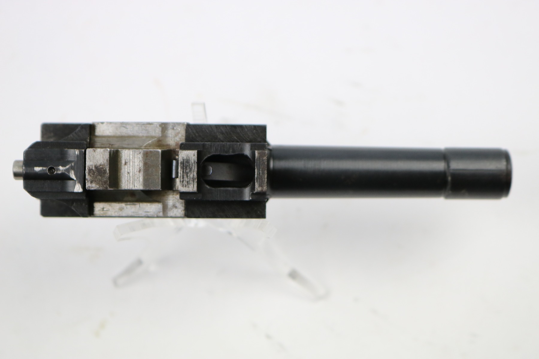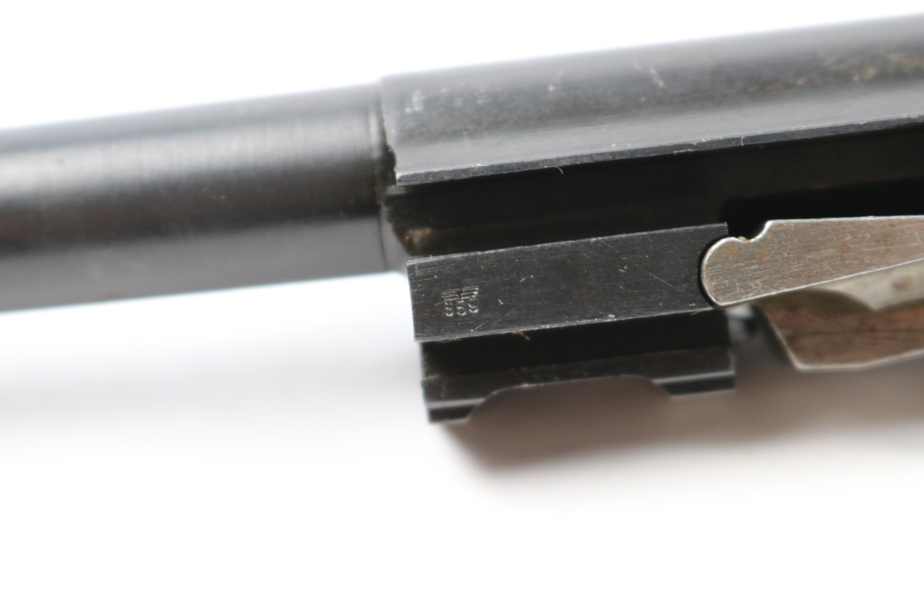 6/26/18 – This is an excellent condition Walther P.38 barrel from WW2. Most likely for an AC 44 or 45. The bluing is excellent and only about 1-2% wear on the bluing, mostly on top of the barrel. Properly eagle/359 proof stamped on the locking block and on the side of the barrel. The serial number font, and lack of serial number on the locking block also indicate late war.