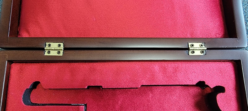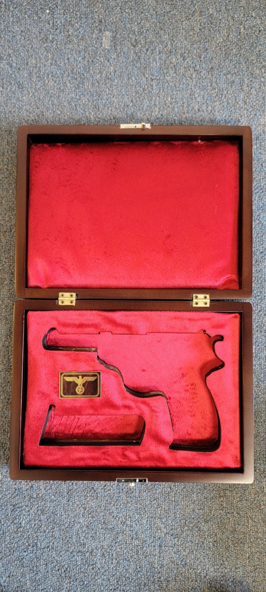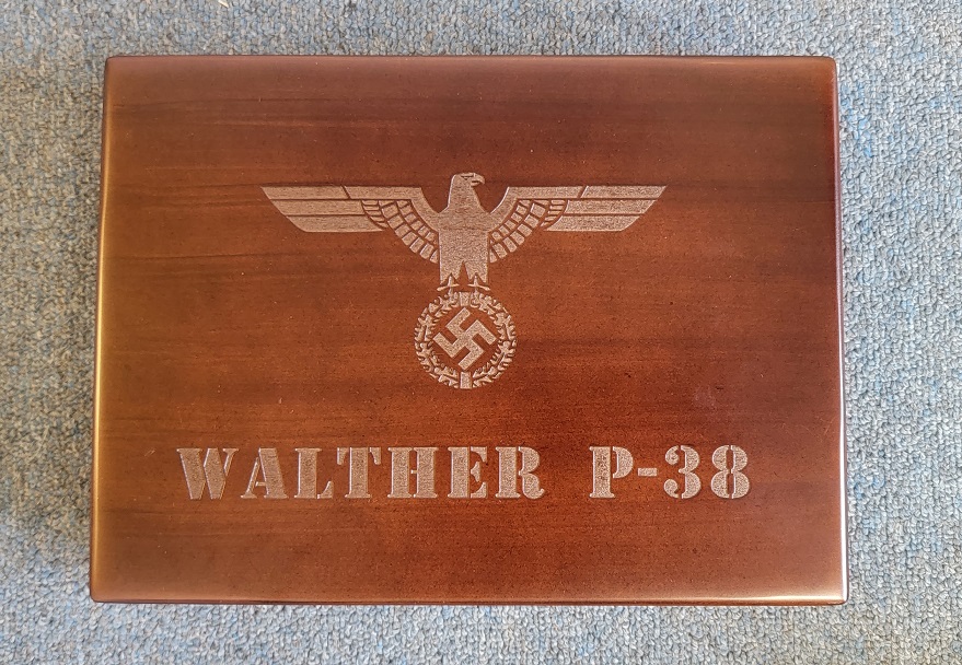 6/20/23 – This display case is a handmade wooden box with an identifying etched top and cushioned slotted interior perfect for storing and displaying a P.38 pistol. There is space inside for the pistol and an extra magazine or a space to store the magazine separate from the pistol. Note there are a few hairline cracks around the hinges on the interior wood.