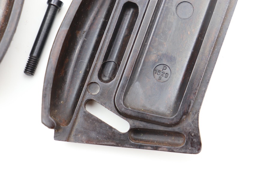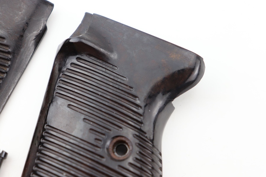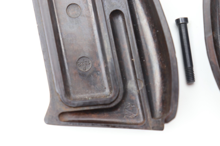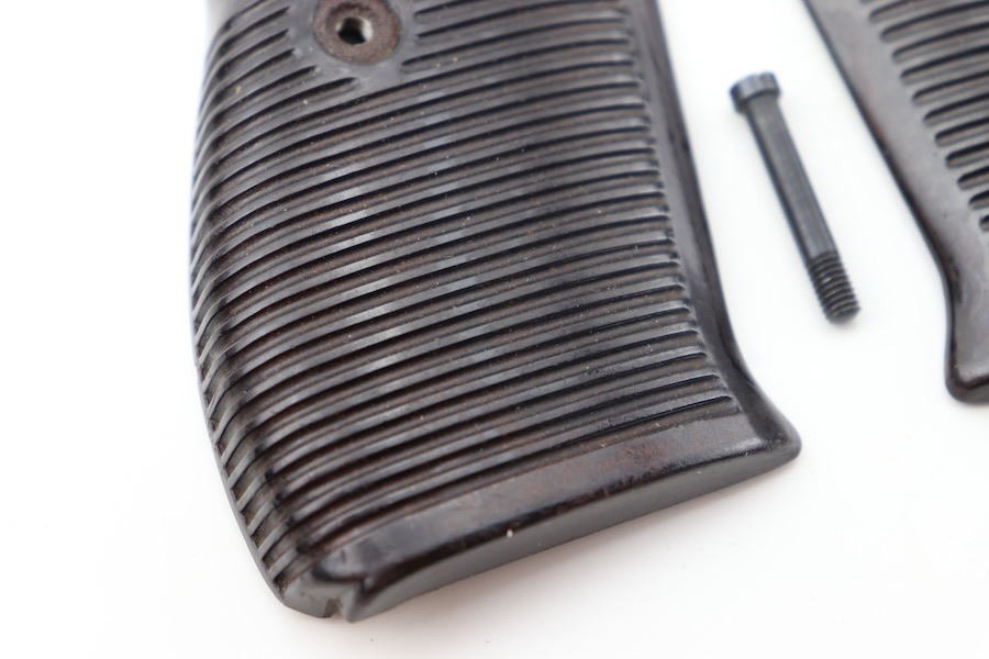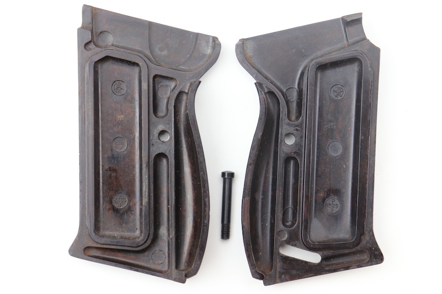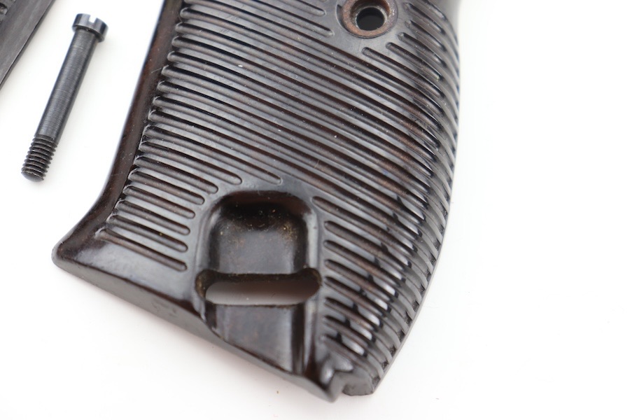 4/9/24 – This is an excellent condition pair of Eagle 359 Walther P.38 grip panels. These grips show little to no wear and are free from cracks, chips, or splits. On the inside part of both grips, there is an Eagle 359 stamp. These grips are correct for AC 41 and 42 Models. Grip screw is included.