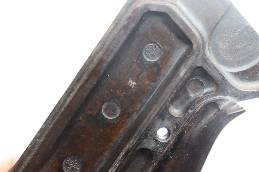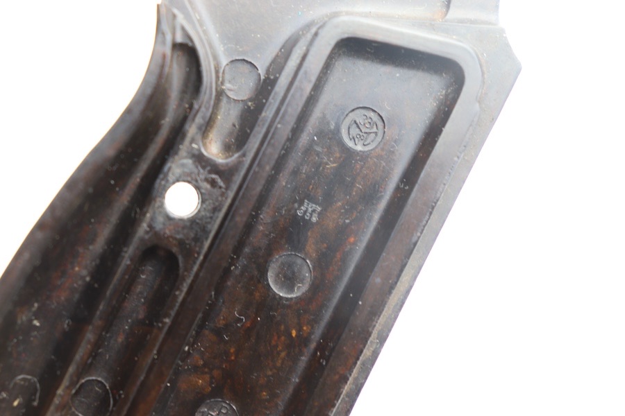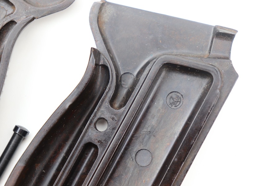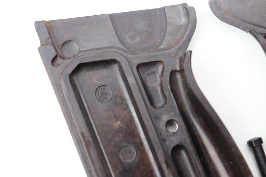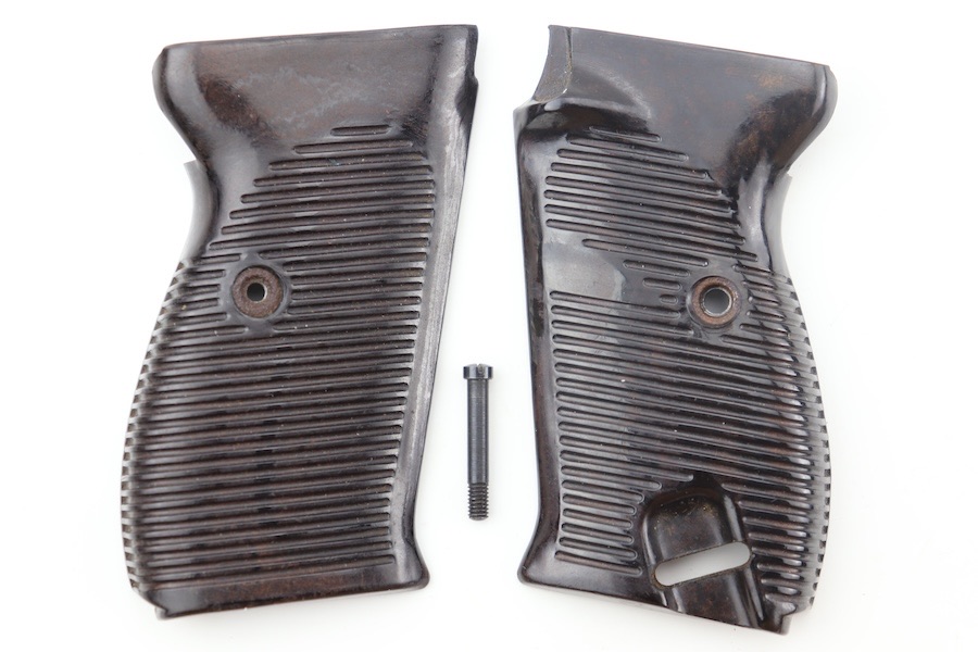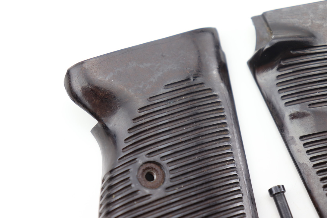4/9/24 – This is an excellent condition pair of Eagle 359 Walther P.38 grip panels. These grips show little to no wear and are free from cracks, chips, or splits. On the inside part of both grips, there is an Eagle 359 stamp. These grips are correct for AC 41 and 42 Models. Grip screw is included.