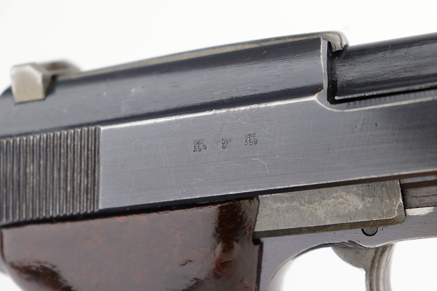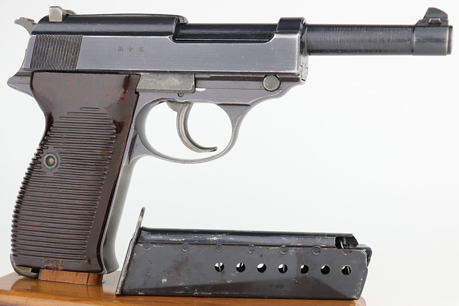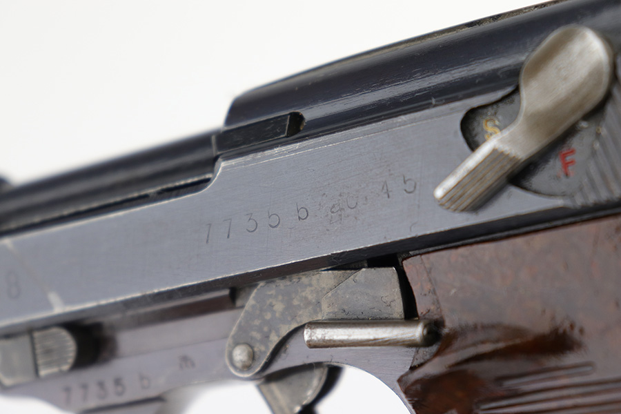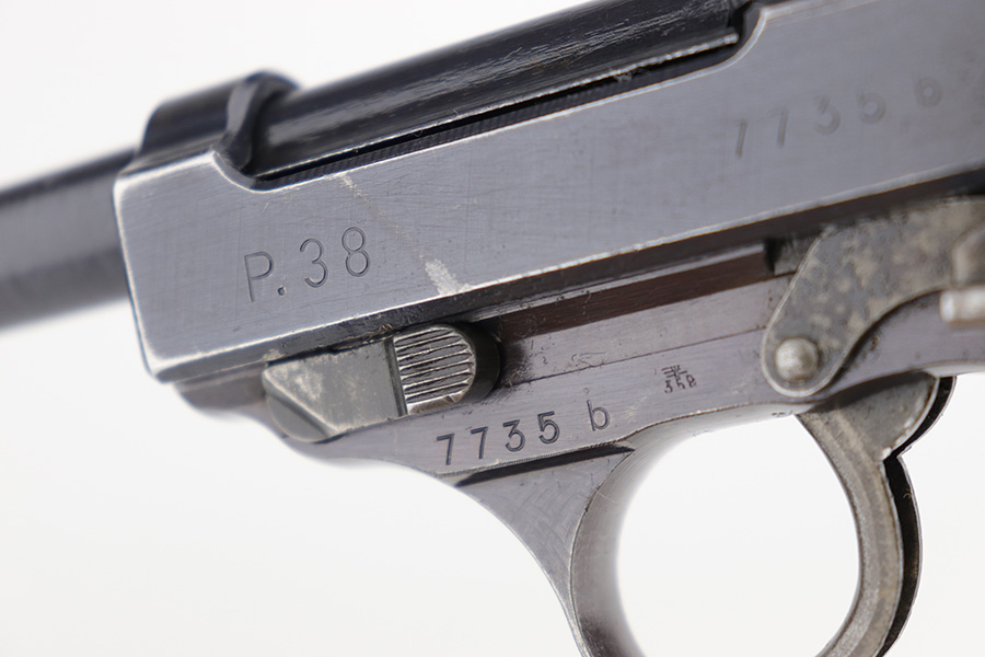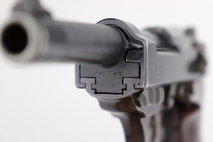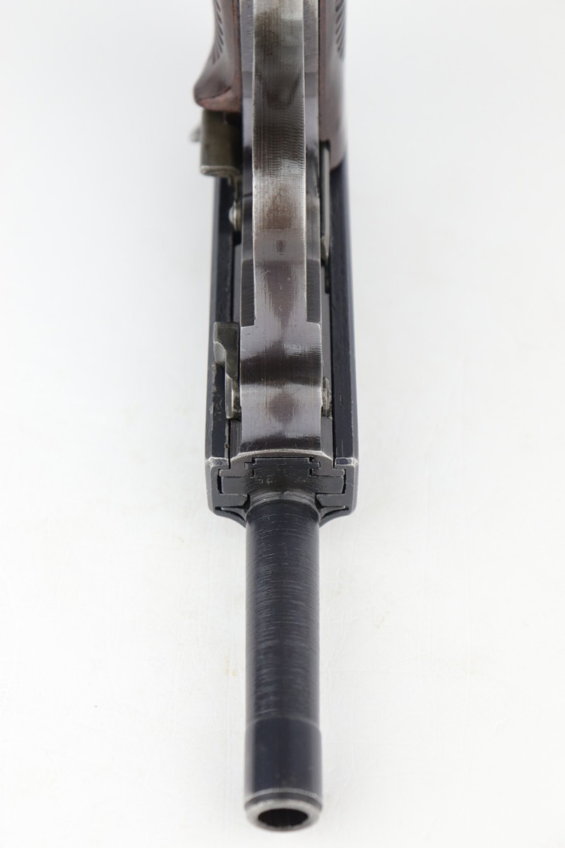 1/5/23 – This is a scarce Walther P.38 from 1945 with FNH produced barrel, only of only 5,000 made. All matching and original. Excellent profile view with only minor high edge wear and a nice mix of blued and phosphate small parts. Most of the wear is on the front strap, though it’s difficult to rate as it may just be the duller late-war finish. Excellent reddish grips aside from a small defect on the bottom of the right panel. Bore shows minor use and frost. E/135 marked magazine.