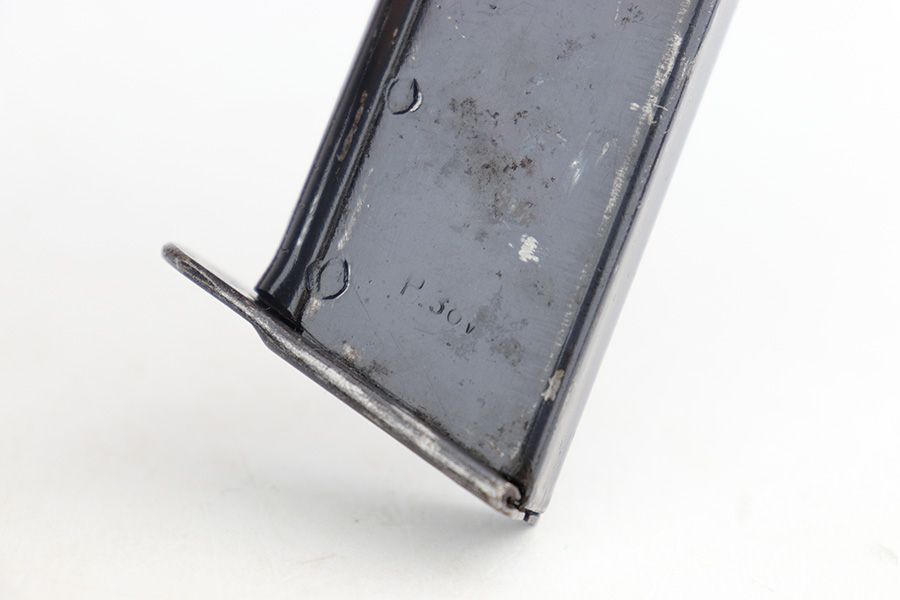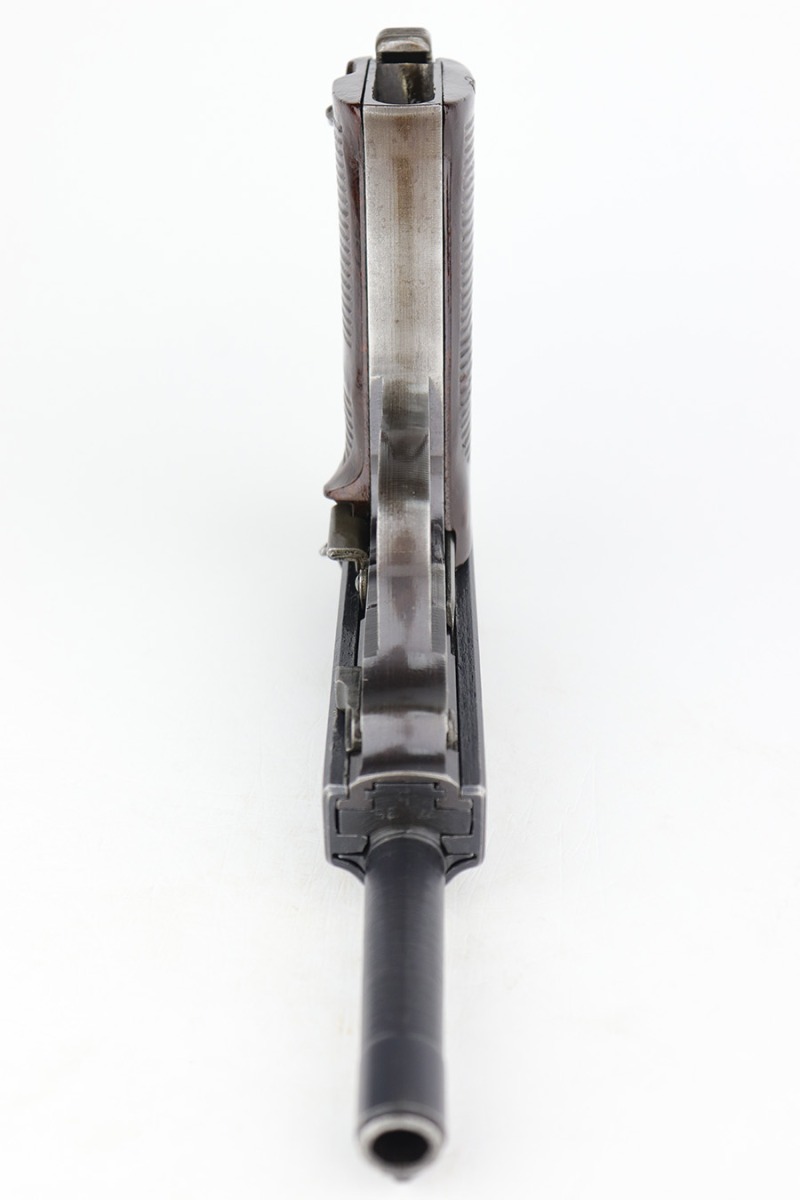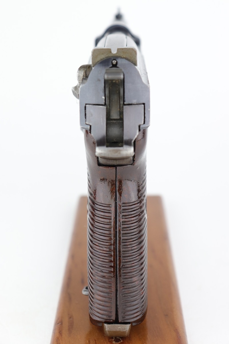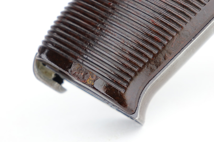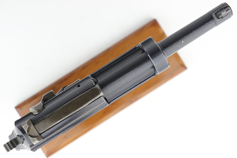1/5/23 – This is a scarce Walther P.38 from 1945 with FNH produced barrel, only of only 5,000 made. All matching and original. Excellent profile view with only minor high edge wear and a nice mix of blued and phosphate small parts. Most of the wear is on the front strap, though it’s difficult to rate as it may just be the duller late-war finish. Excellent reddish grips aside from a small defect on the bottom of the right panel. Bore shows minor use and frost. E/135 marked magazine.
