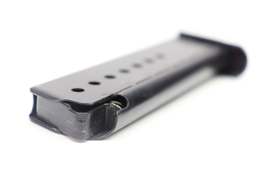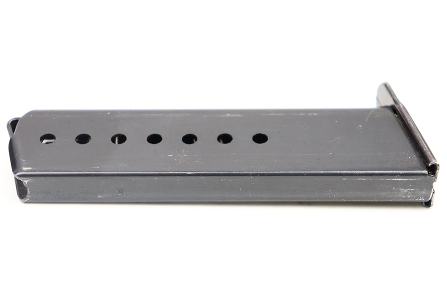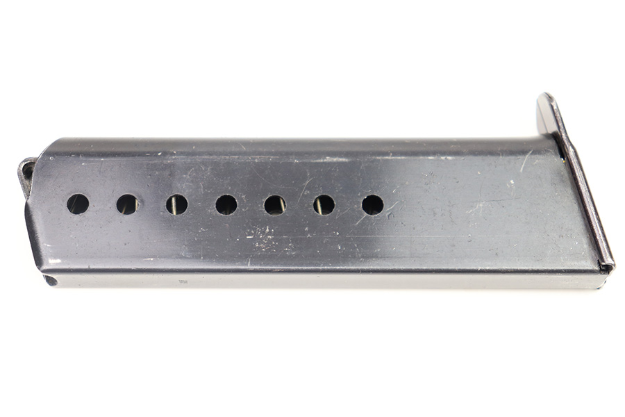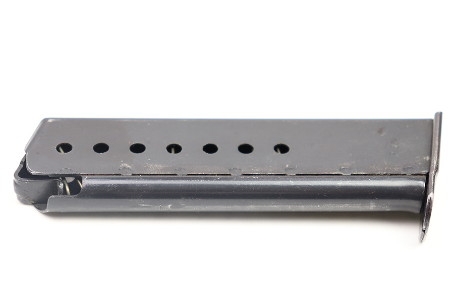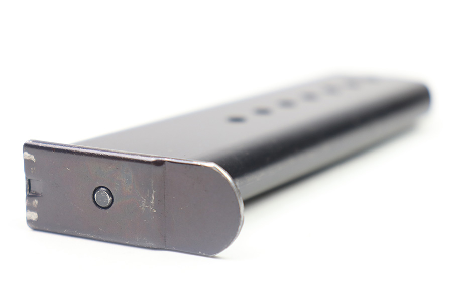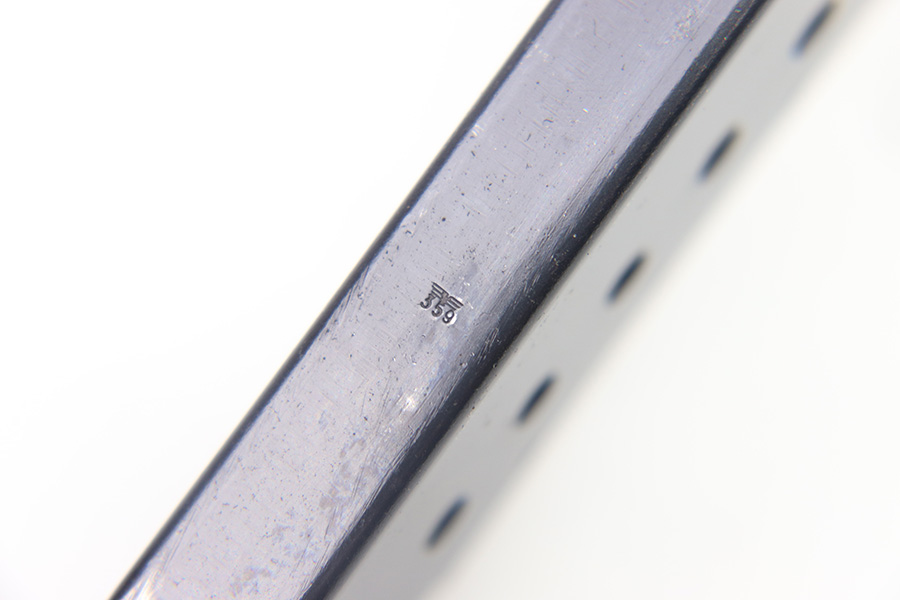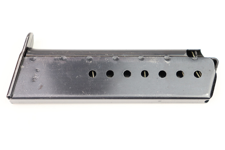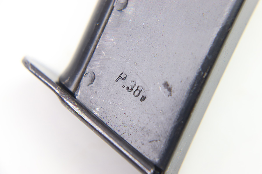 9/23/22 – This is an excellent condition Walther P.38 magazine from WW2. The magazine is P.38v stamped on one side of the frame, and Walther proof stamped on the spine. Excellent bluing throughout with minimal finish loss and a fully functional spring.