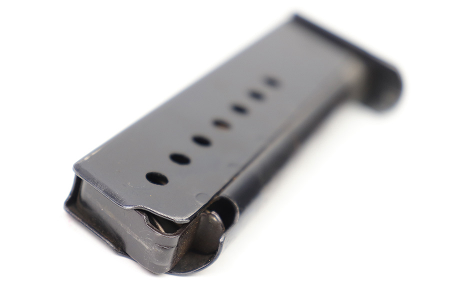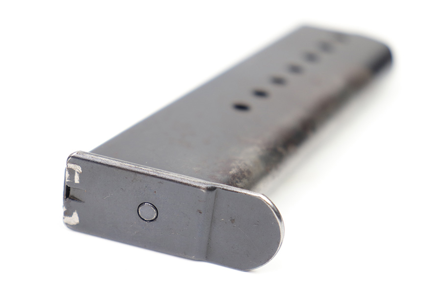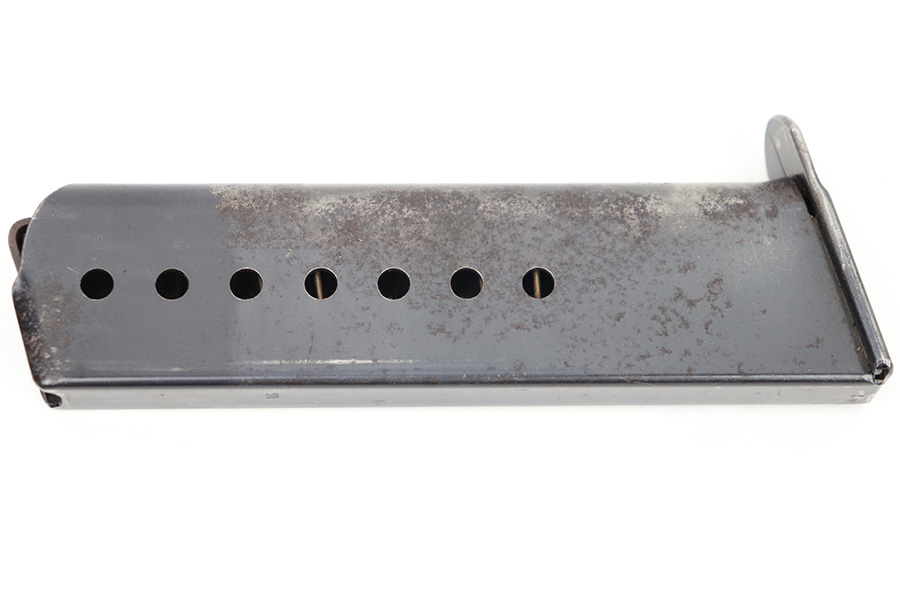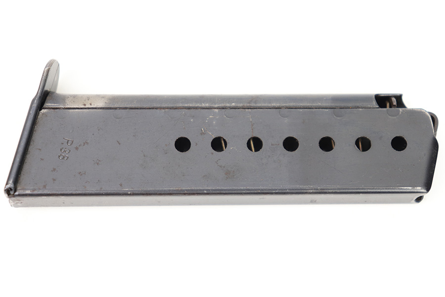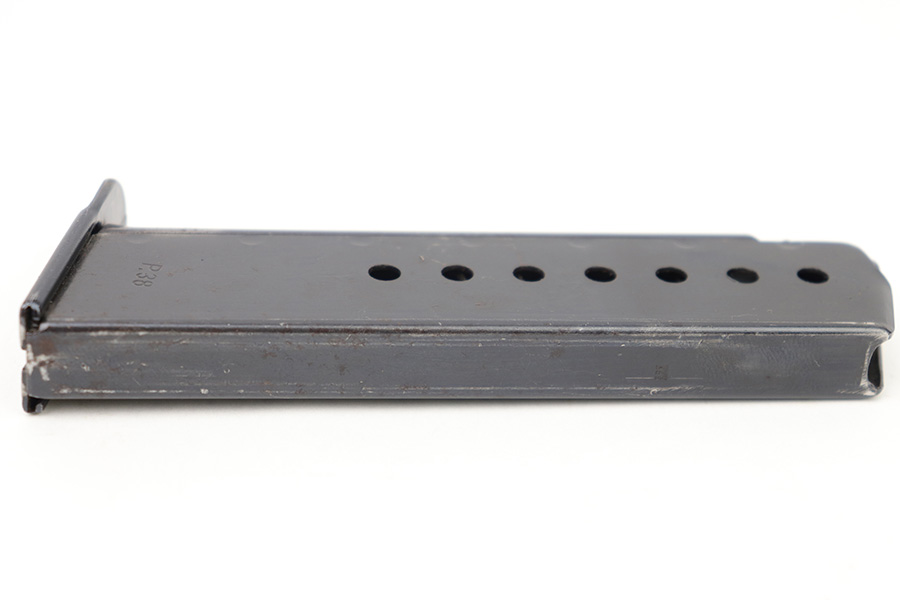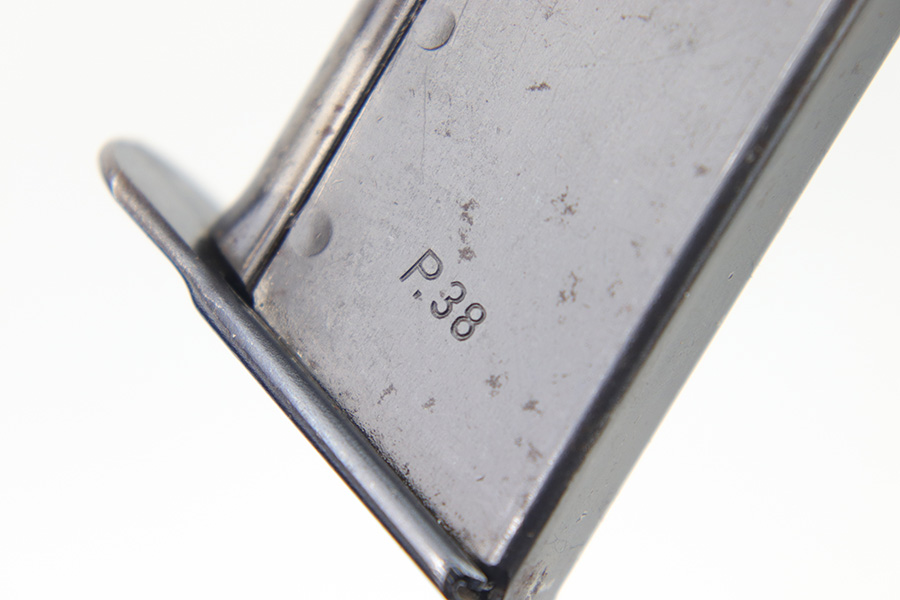3/1/23 – This is an original WW2 production Walther P.38 magazine. The magazine is stamped P.38 on the left side of the tube, and eagle 359 military proof stamped on the spine. The right side of the tube shows dark surface patina and pitting. There’s finish loss on the front spine as well. The base is excellent. The spring is strong and fully functional.