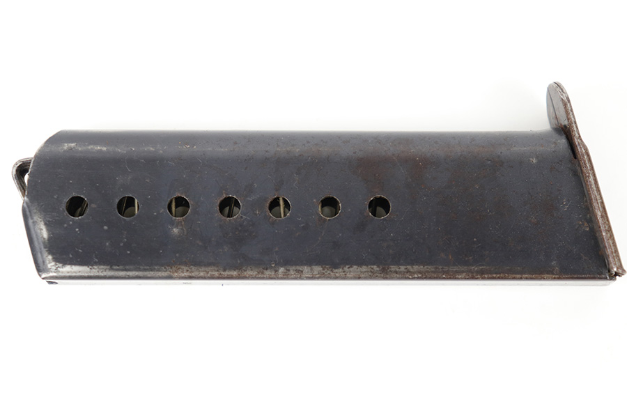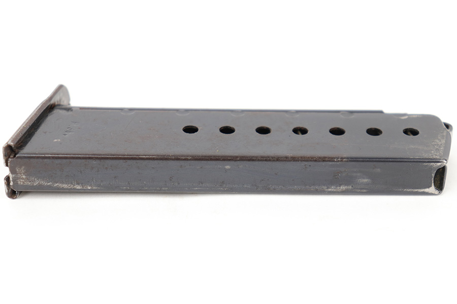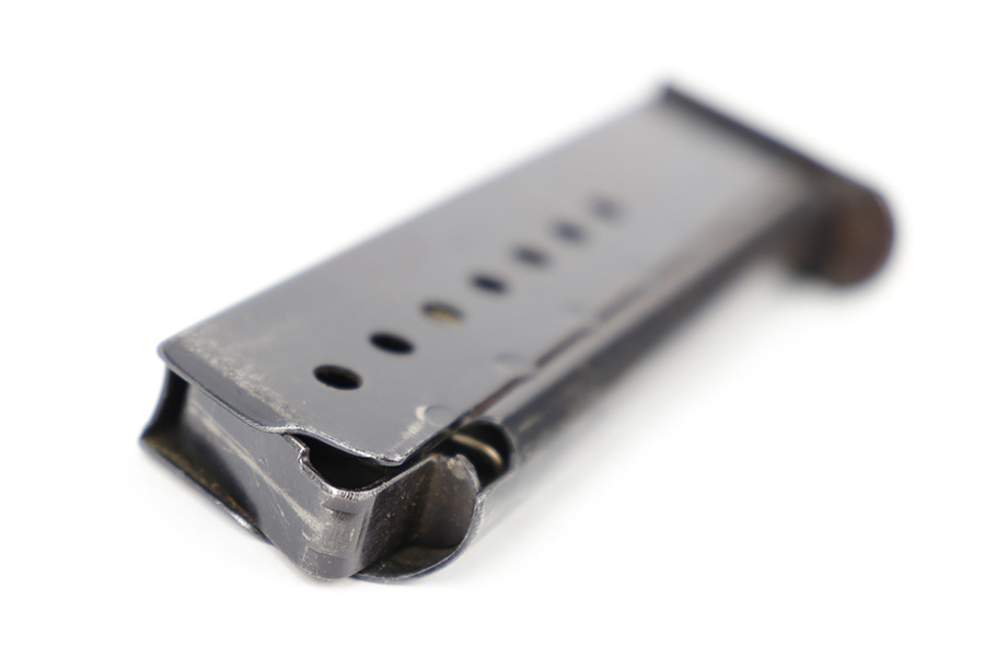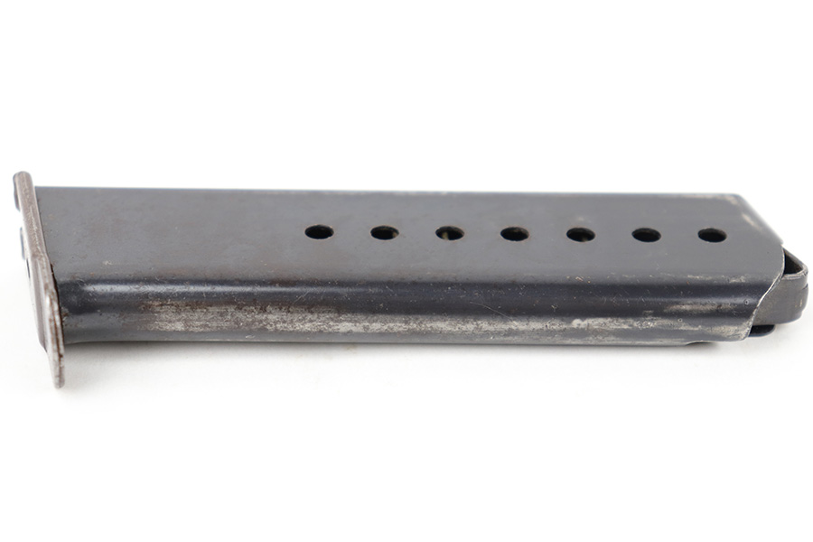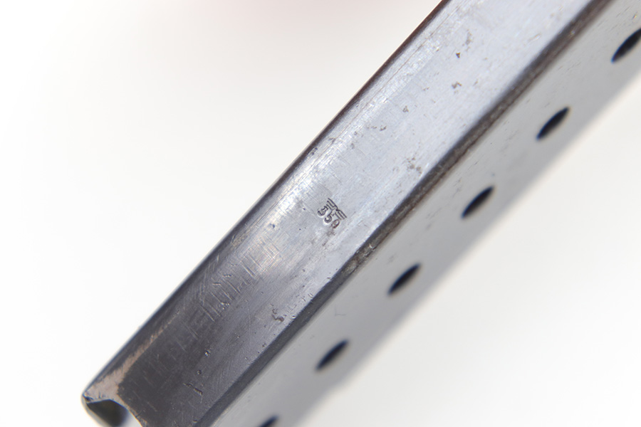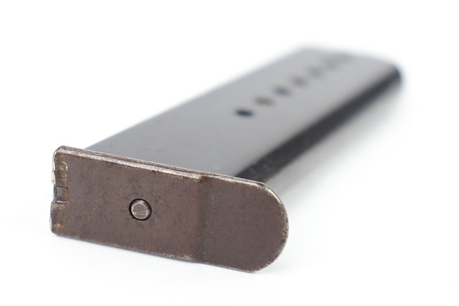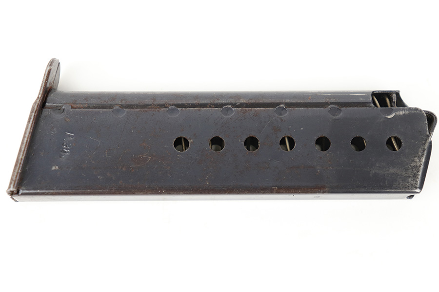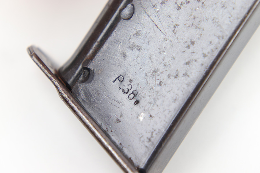 5/8/23 – This is an original Walther P.38 magazine from WW2. The magazine has excellent, original blued finish throughout. However, there’s spotty dark surface patina throughout the magazine tube and dark brown patina throughout the base. The tube is P.38v stamped on the left side, and military proofed on the spine. The spring is strong and fully functional.