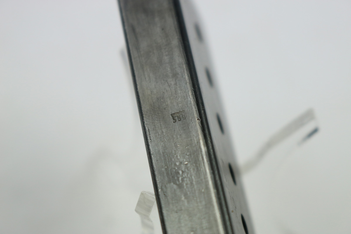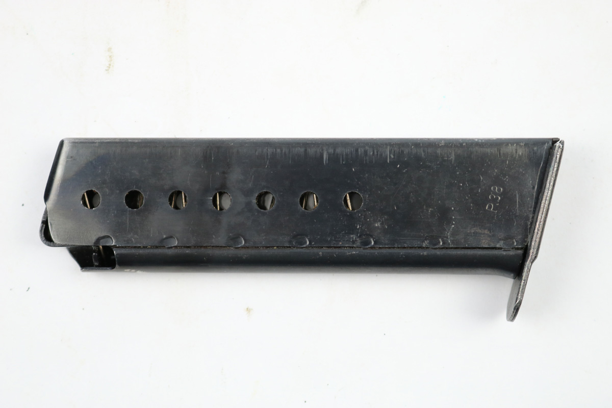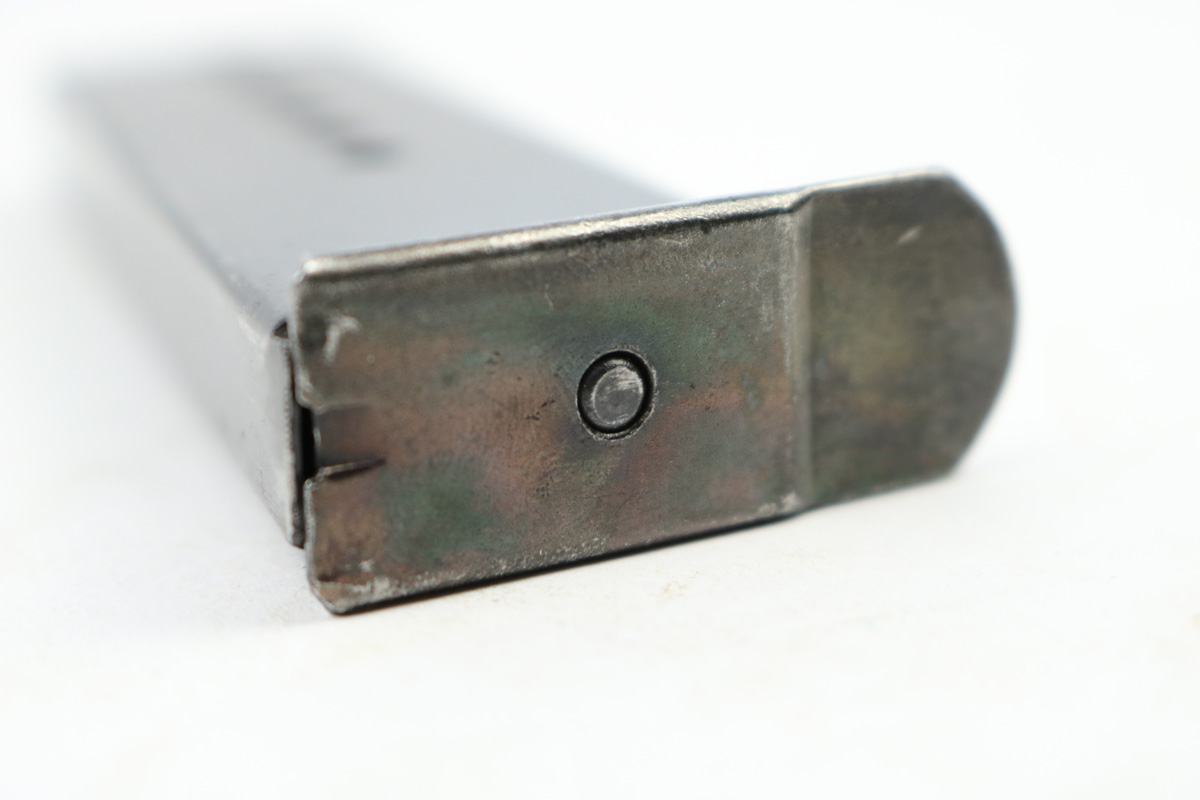 8/2/18 – This is an original Walther P.38 magazine. The magazine is “P.38” stamped, and has one eagle/359 stamp on the spine. This is the earlier wartime production variation, but not the earliest with double 359 stamps. The spring is strong and fully functional, and the magazine is overall excellent condition. There is some pinpricking and strange greenish/plumb discoloration on the base. This could be from some sort of chemical spill on the base. Guaranteed original.
