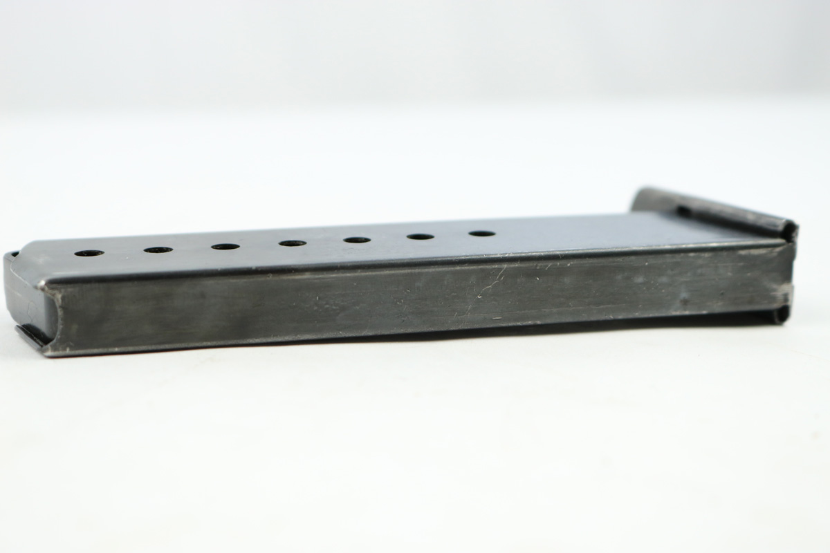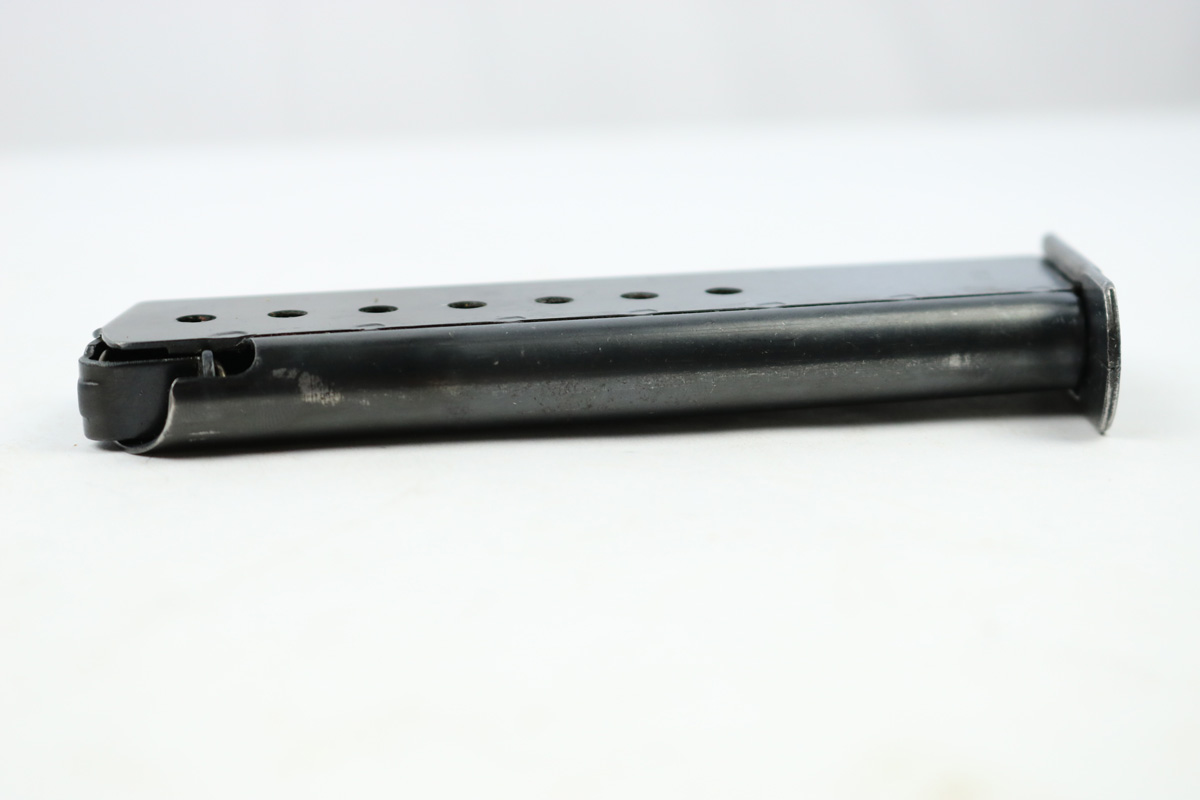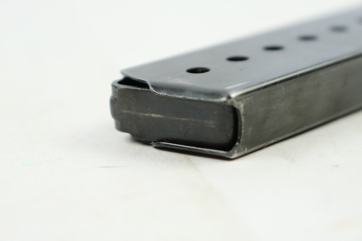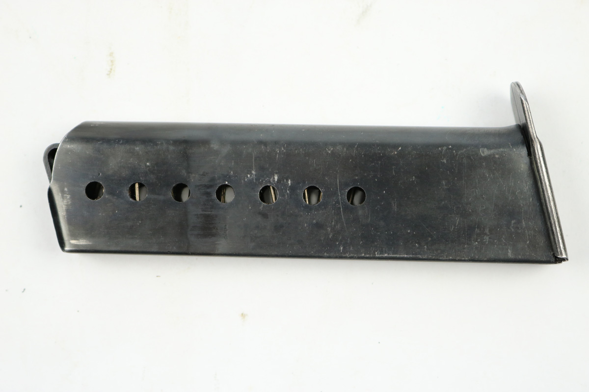 8/2/18 – This is an original Walther P.38 magazine. The magazine is “P.38” stamped, and has one eagle/359 stamp on the spine. This is the earlier wartime production variation, but not the earliest with double 359 stamps. The spring is strong and fully functional, and the magazine is overall excellent condition. There is some pinpricking and strange greenish/plumb discoloration on the base. This could be from some sort of chemical spill on the base. Guaranteed original.