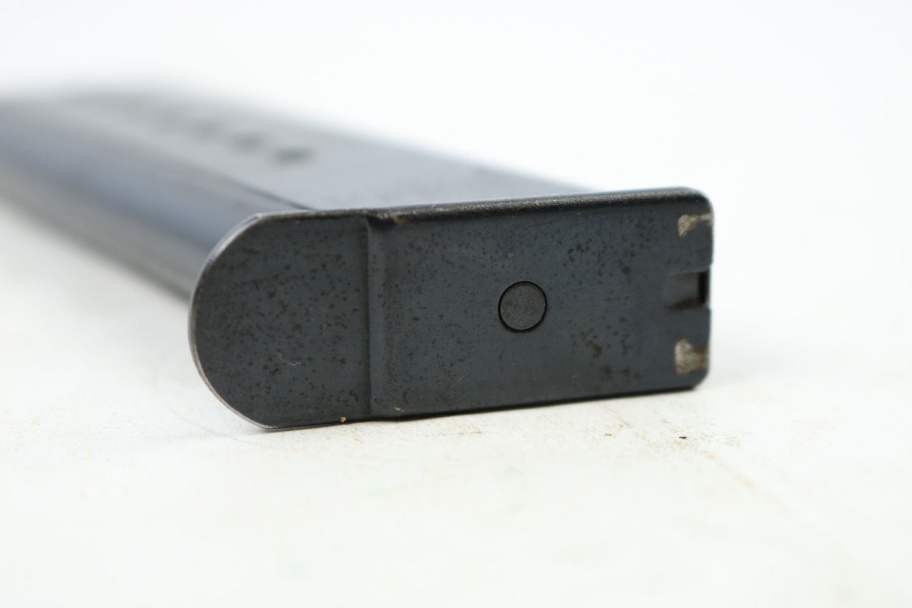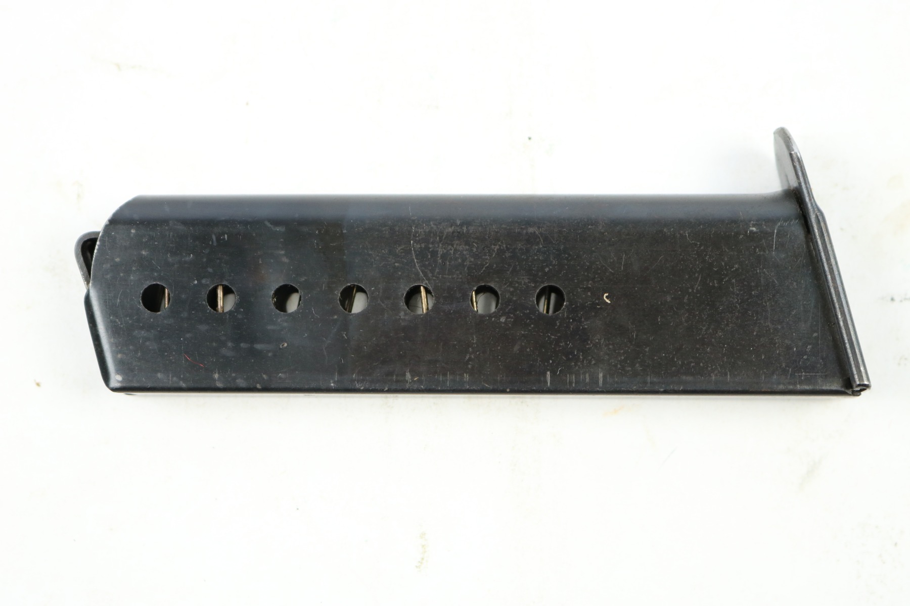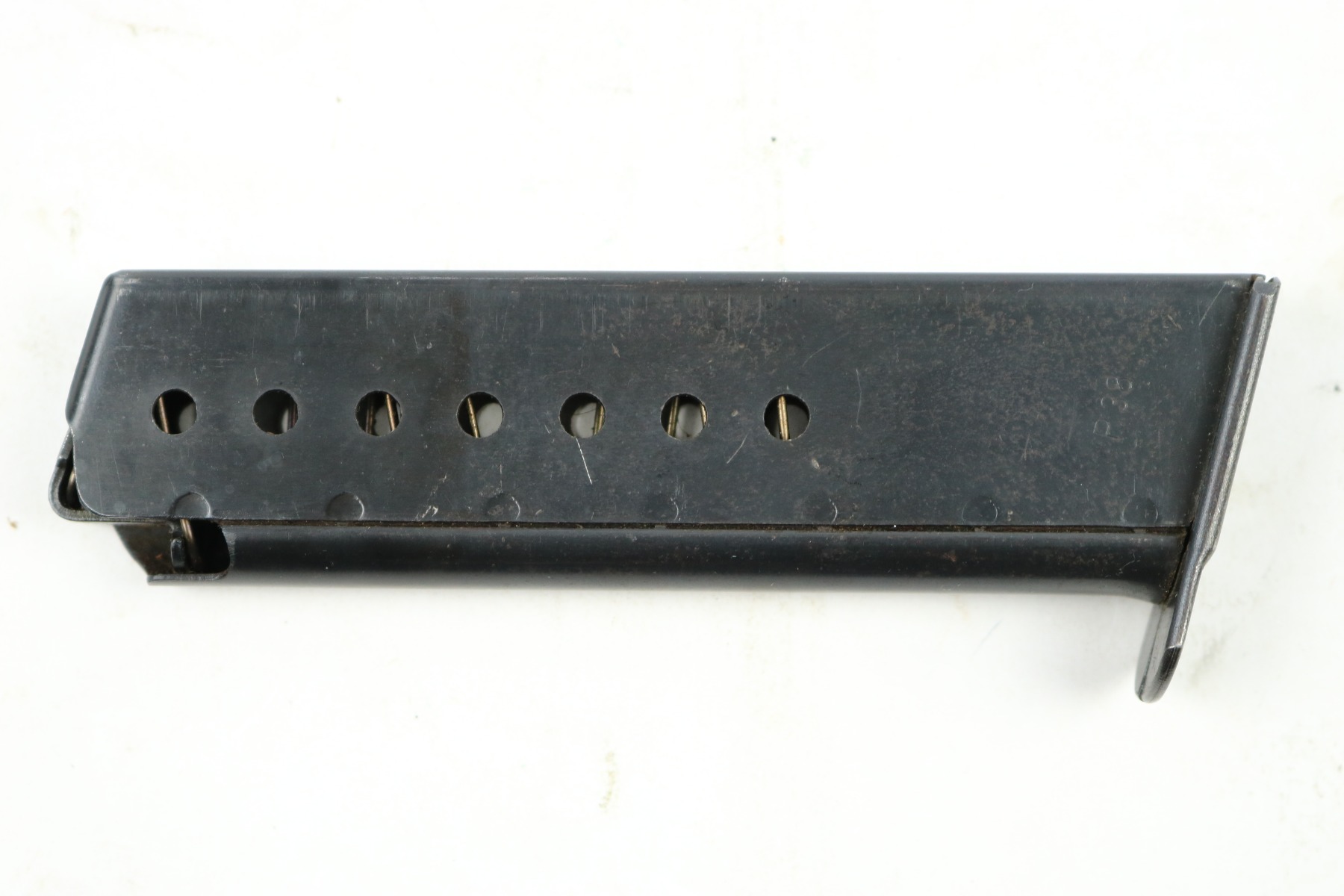 8/24/18 – This is a WW2 production (most likely 1942) Walther P.38 magazine. There’s no “v” after the “p.38” stamp on the left side of the frame. The spine has an eagle/359 proof stamp. The spring is strong and functional. There is some minor spotty discoloration on the tube, mostly on each side near the lower half. Overall the magazine is in great shape – guaranteed original.