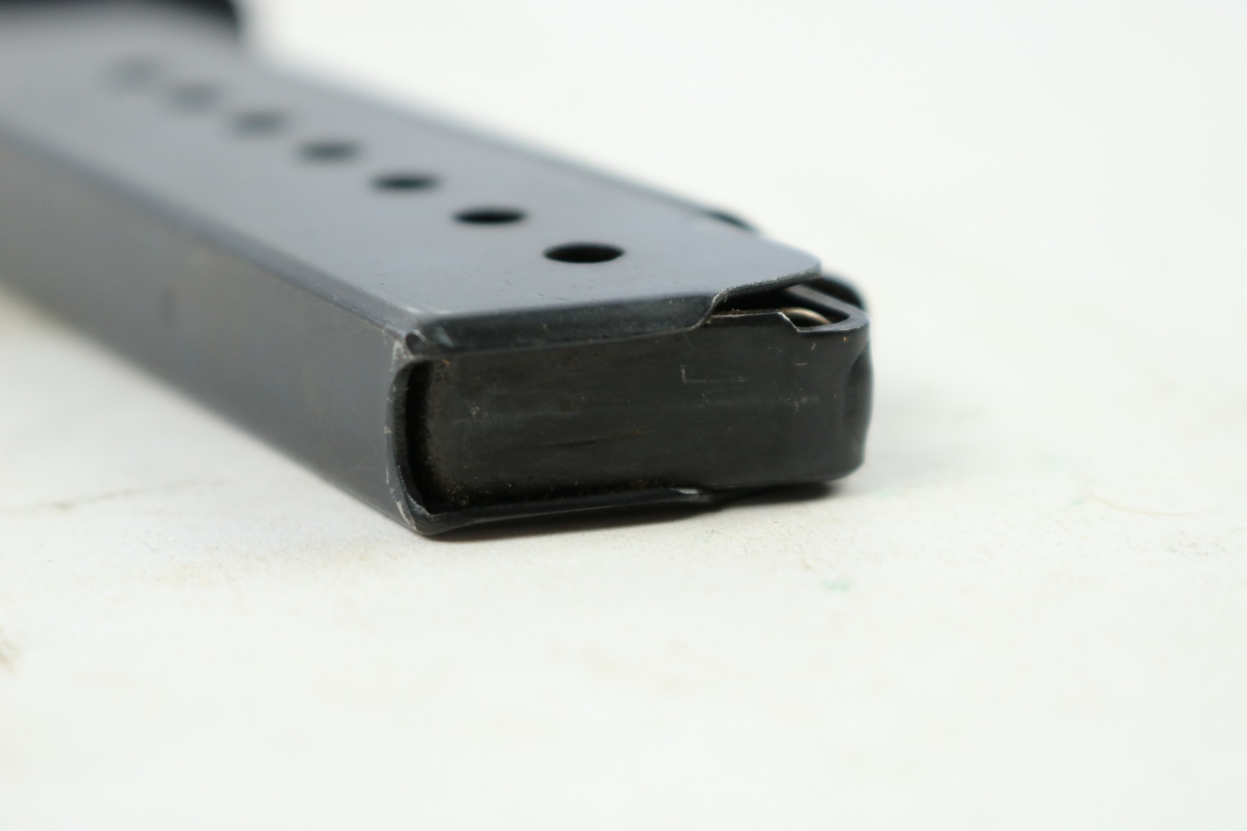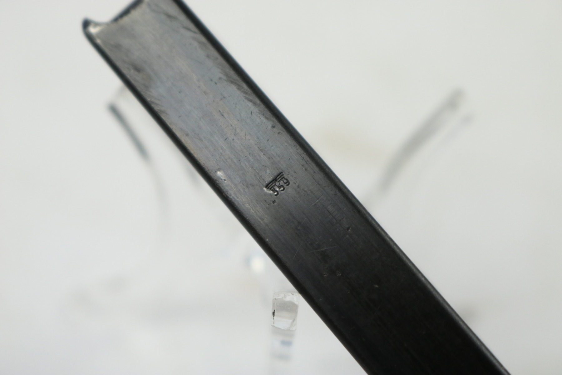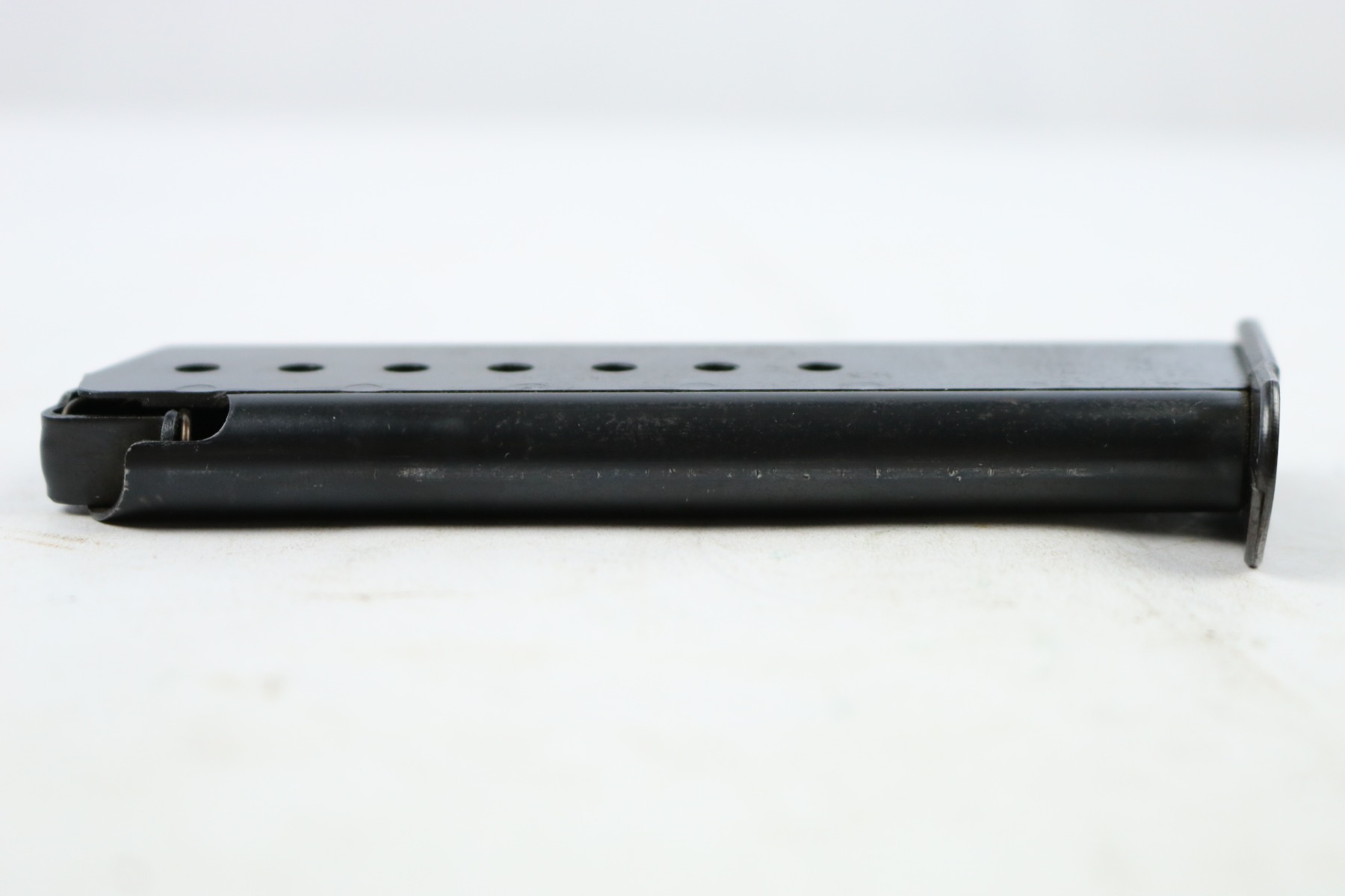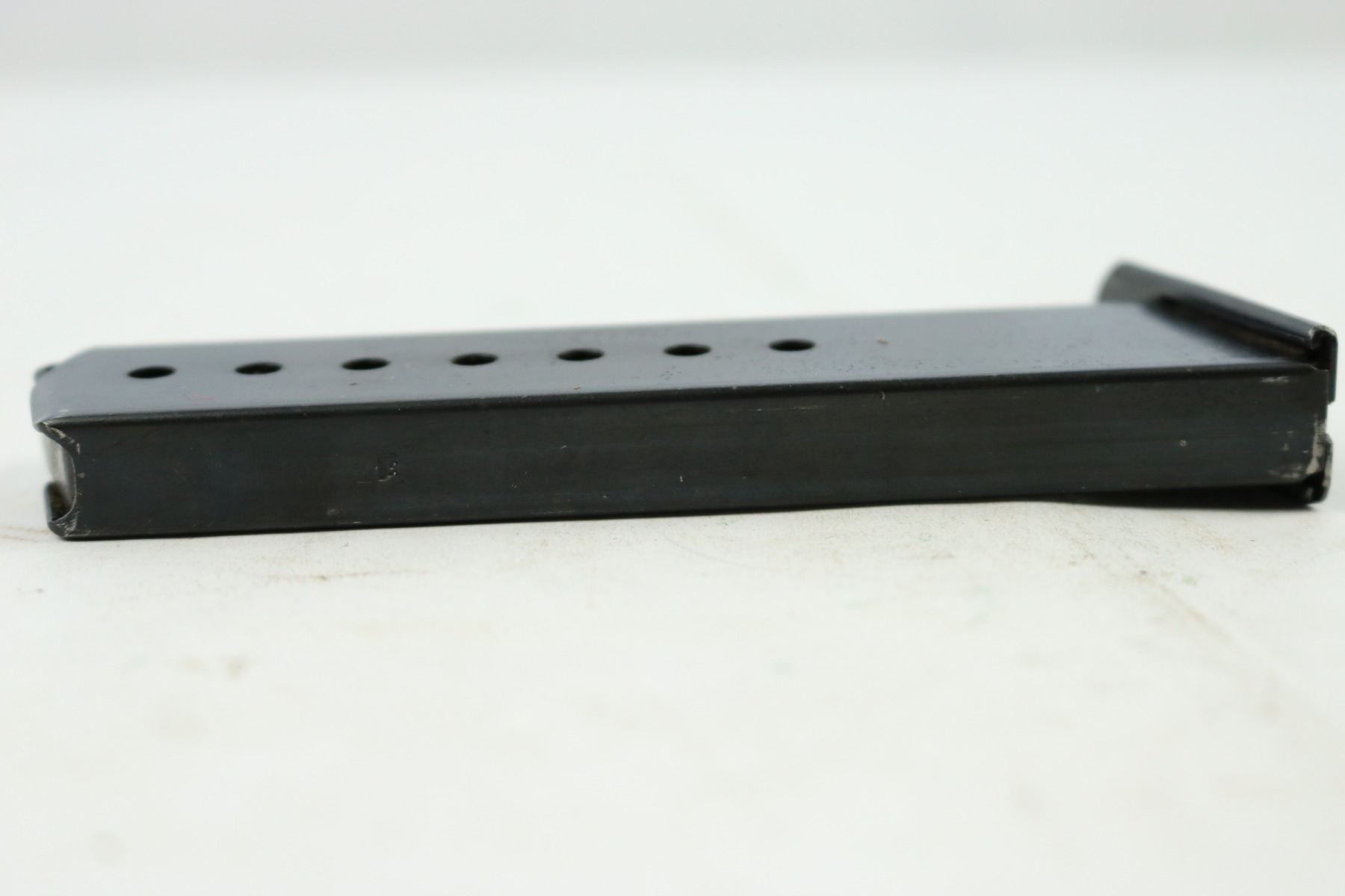 8/24/18 – This is a WW2 production (most likely 1942) Walther P.38 magazine. There’s no “v” after the “p.38” stamp on the left side of the frame. The spine has an eagle/359 proof stamp. The spring is strong and functional. There is some minor spotty discoloration on the tube, mostly on each side near the lower half. Overall the magazine is in great shape – guaranteed original.