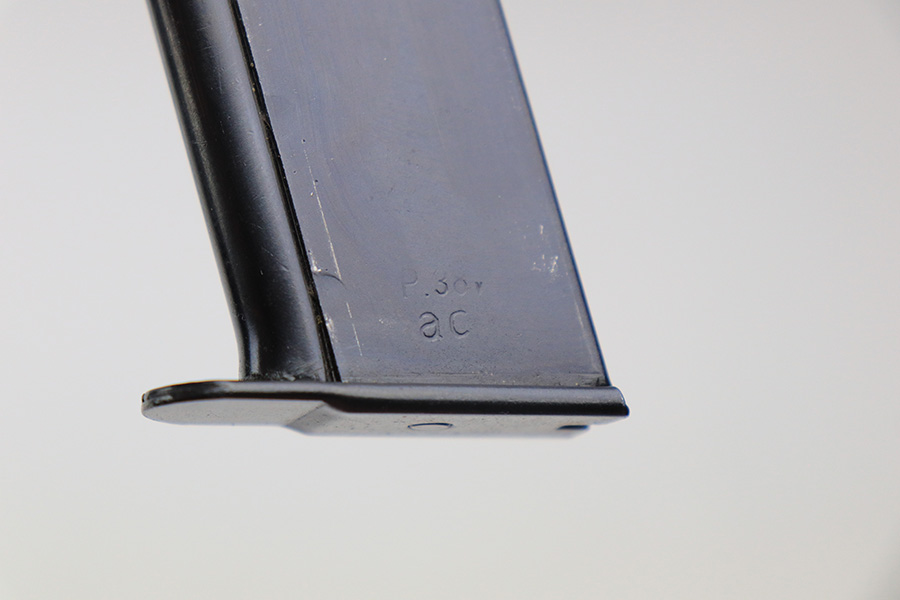 12/9/21 – This is an original Walther P.38 armorer replacement magazine from WW2. The magazine is excellent with strong finish throughout and a fully functional spring. Stamped “AC” under the P.38 stamp, and waffen eagle 359 proof stamped on the spine.