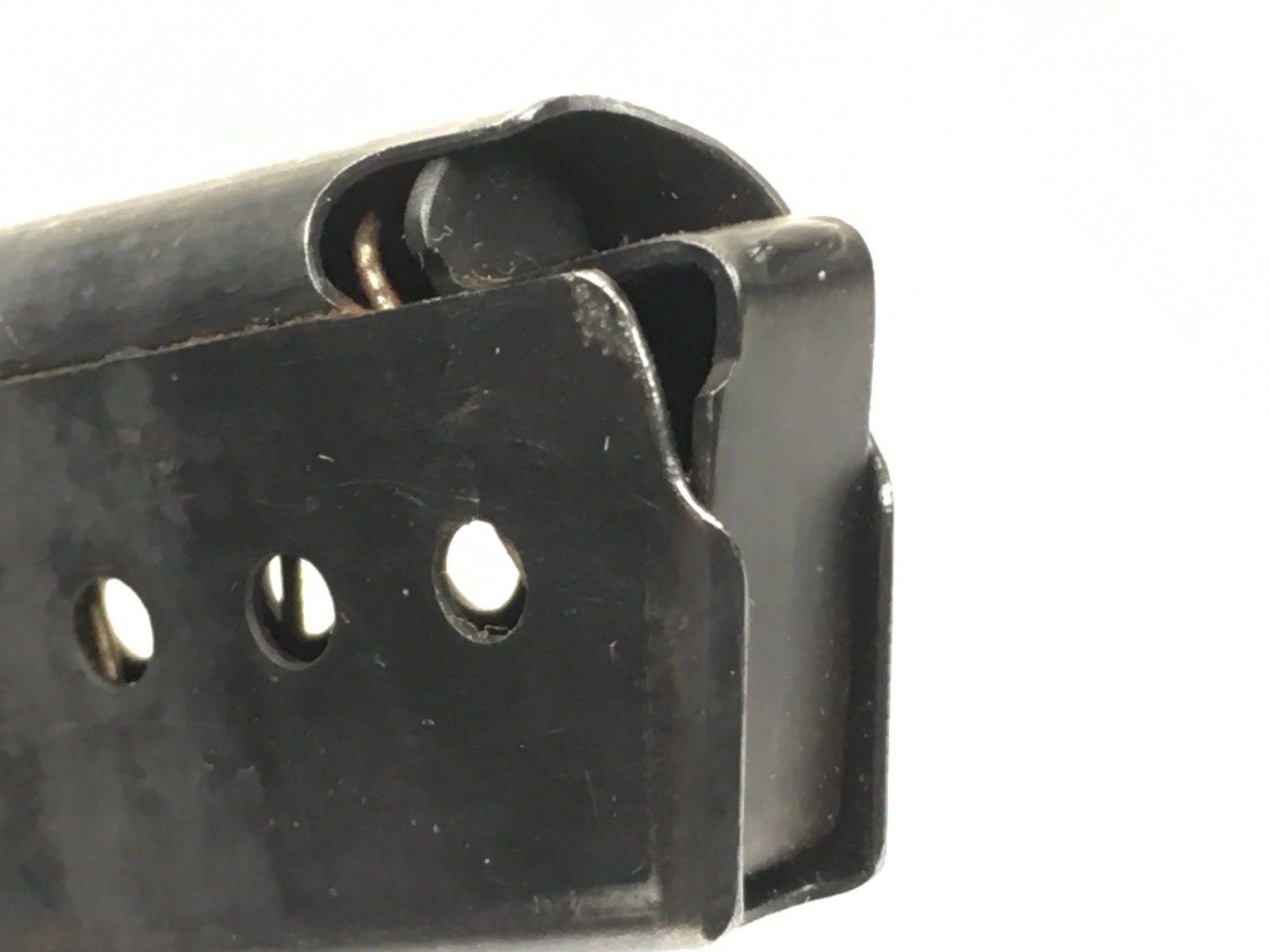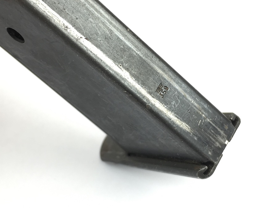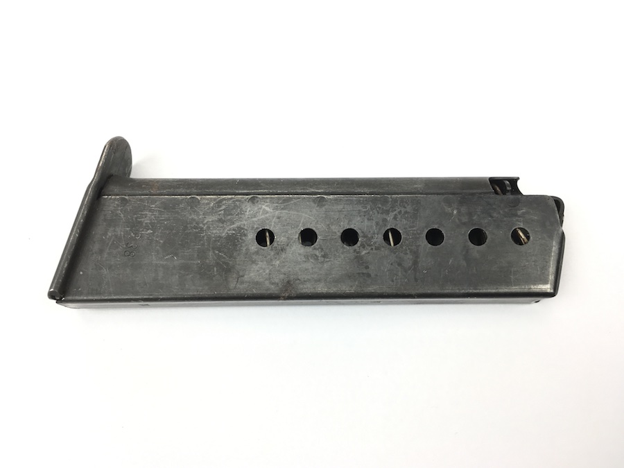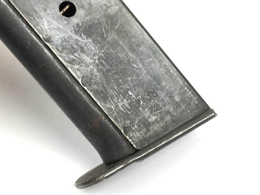 7/19/19 – This original wartime magazine was produced by Walther as can be seen by the Walther acceptance stamp E/359 on the top and bottom of the spine. P.38 stamped on the left frame. No other markings. There is no corrosion or damage to this magazine. Nice bluing throughout with minmal wear. Strong spring. Gaurenteed original and fully functional.