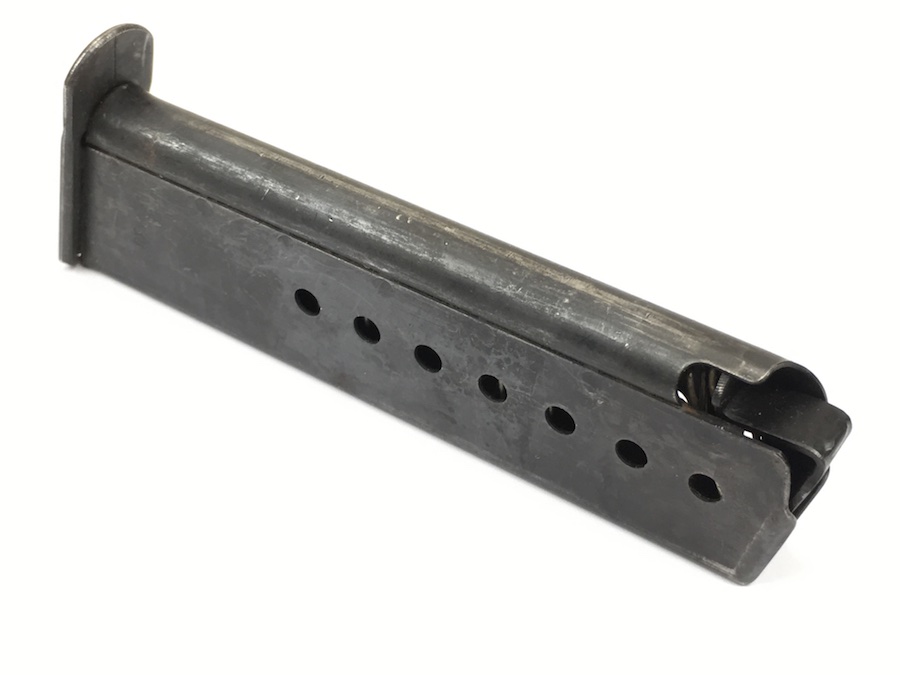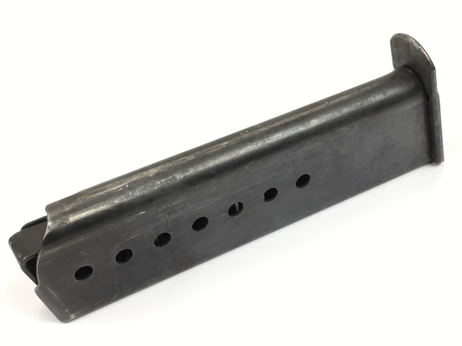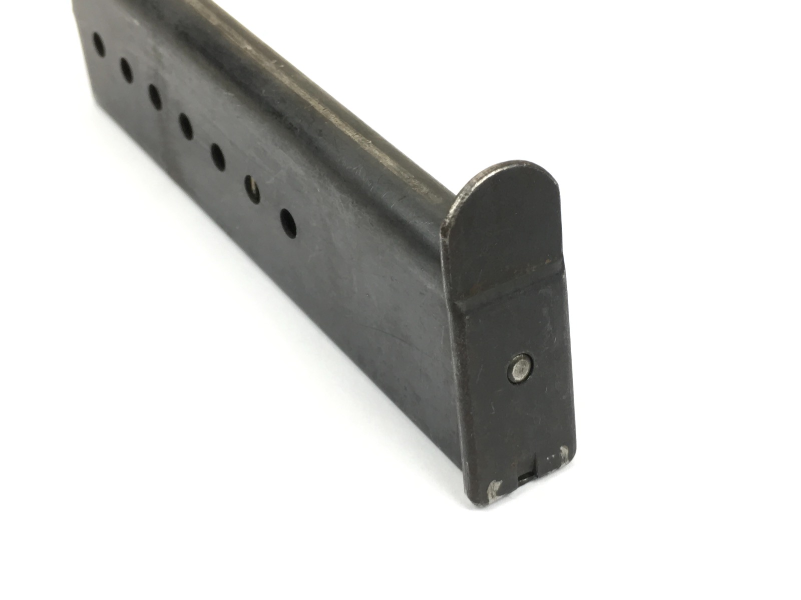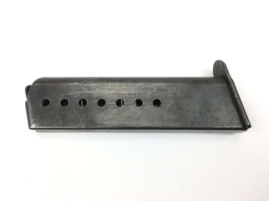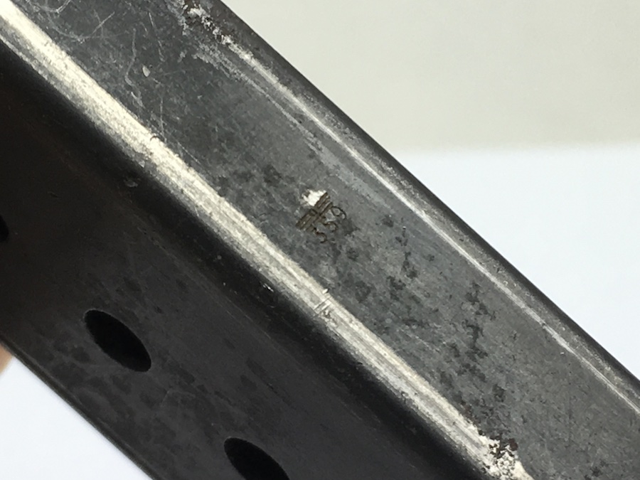 7/19/19 – This original wartime magazine was produced by Walther as can be seen by the Walther acceptance stamp E/359 on the top and bottom of the spine. P.38 stamped on the left frame. No other markings. There is no corrosion or damage to this magazine. Nice bluing throughout with minmal wear. Strong spring. Gaurenteed original and fully functional.