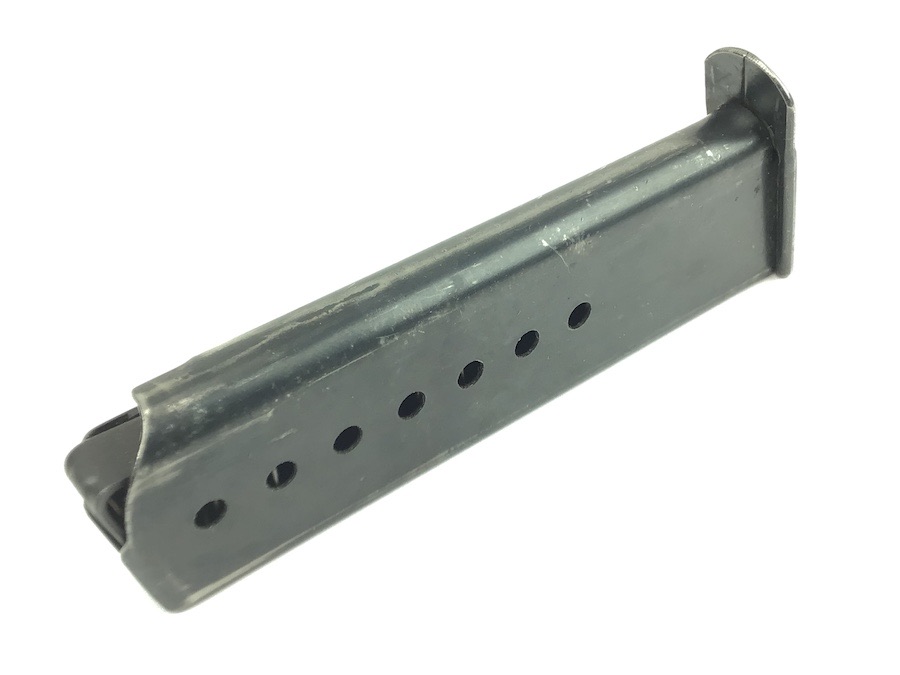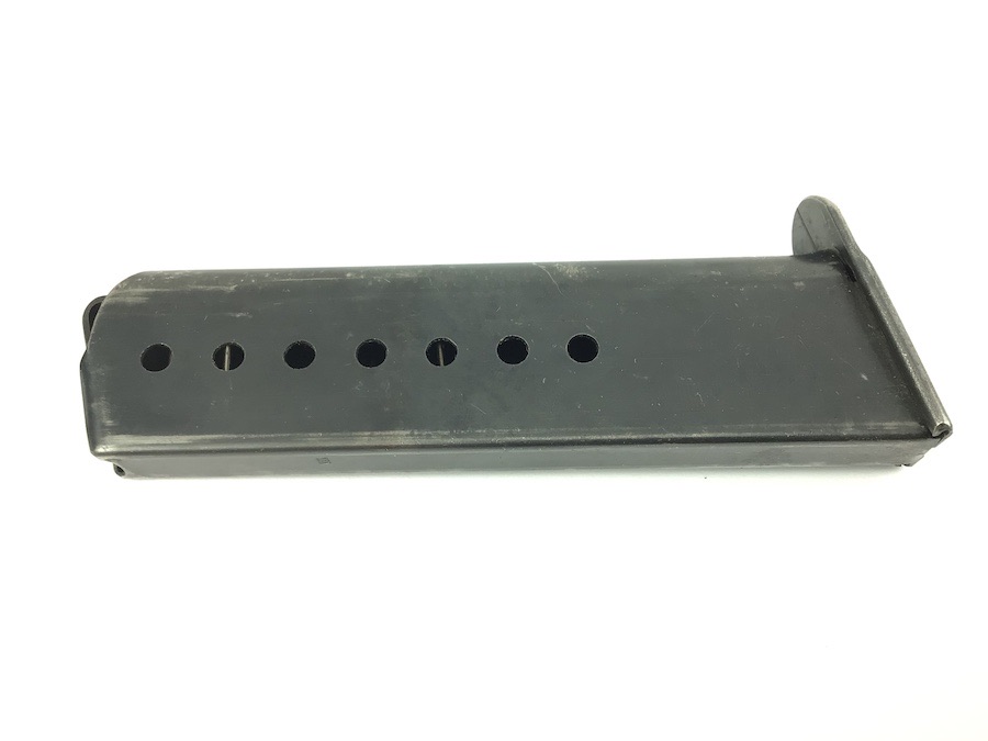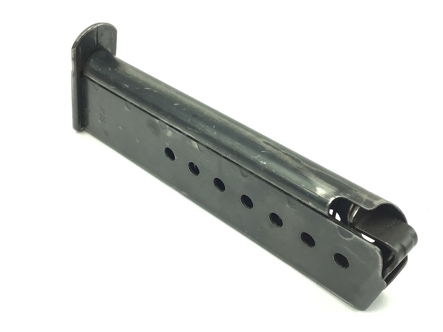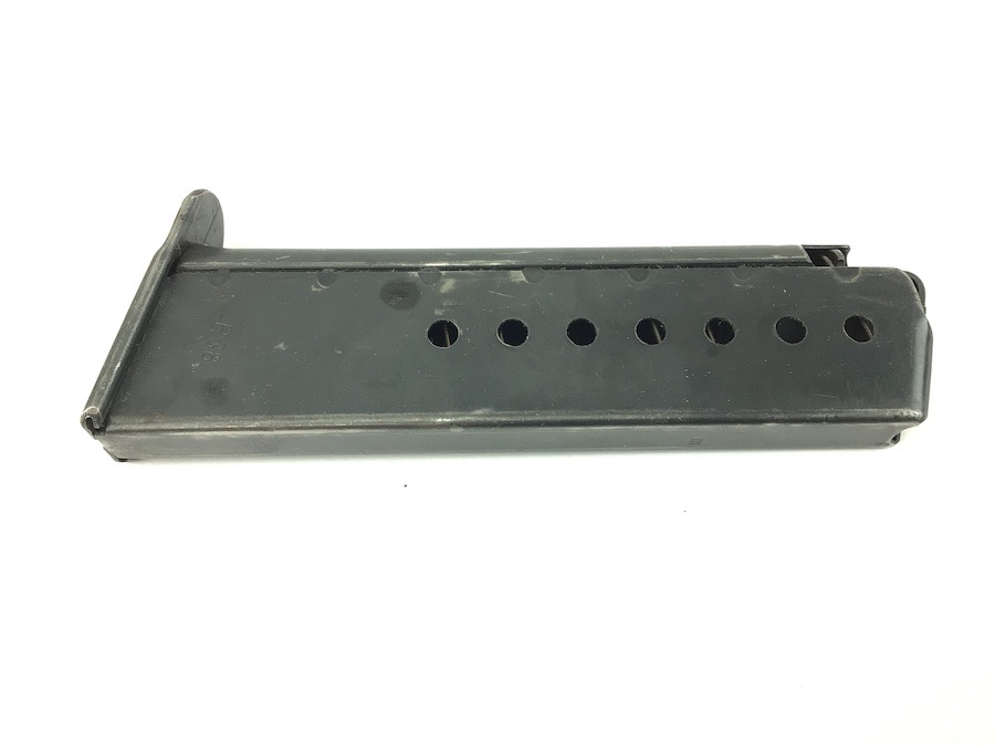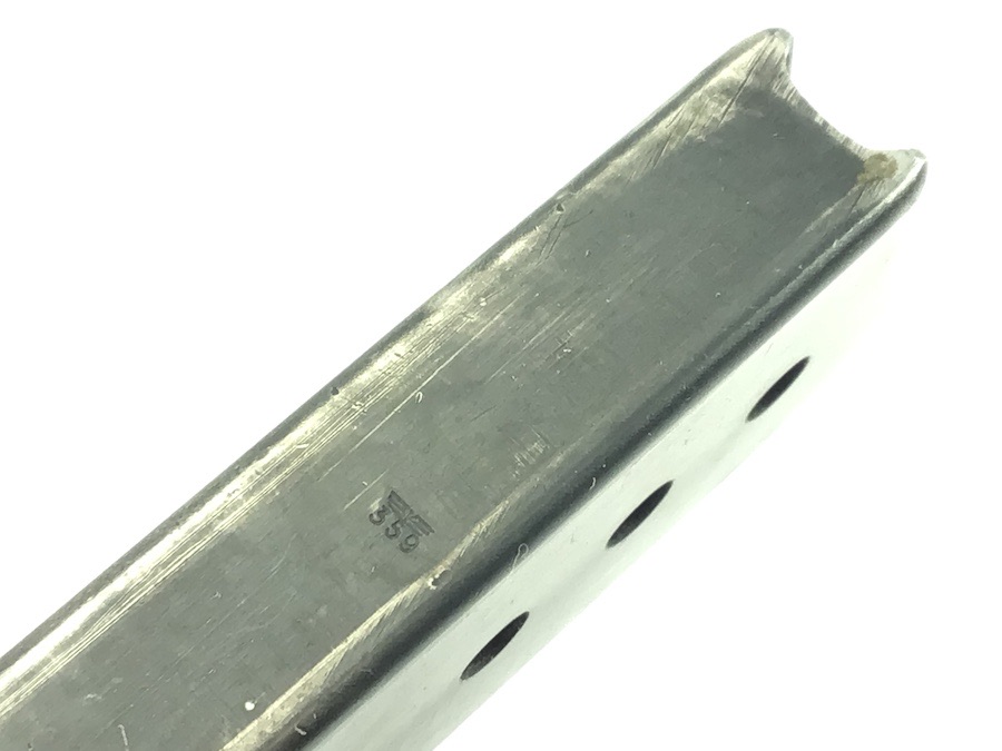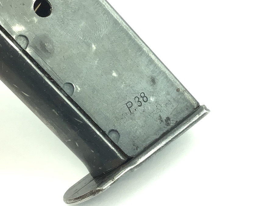 4/11/22 – This is an original WW2 variation P.38 magazine. The left side of the frame is stamped “P.38”.  The spine is stamped with one, eagle 359 proof stamps. There are no other markings. The spring is excellent and fully functional. The original blued finish has minimal wear with no pitting or corrosion.