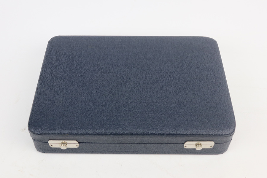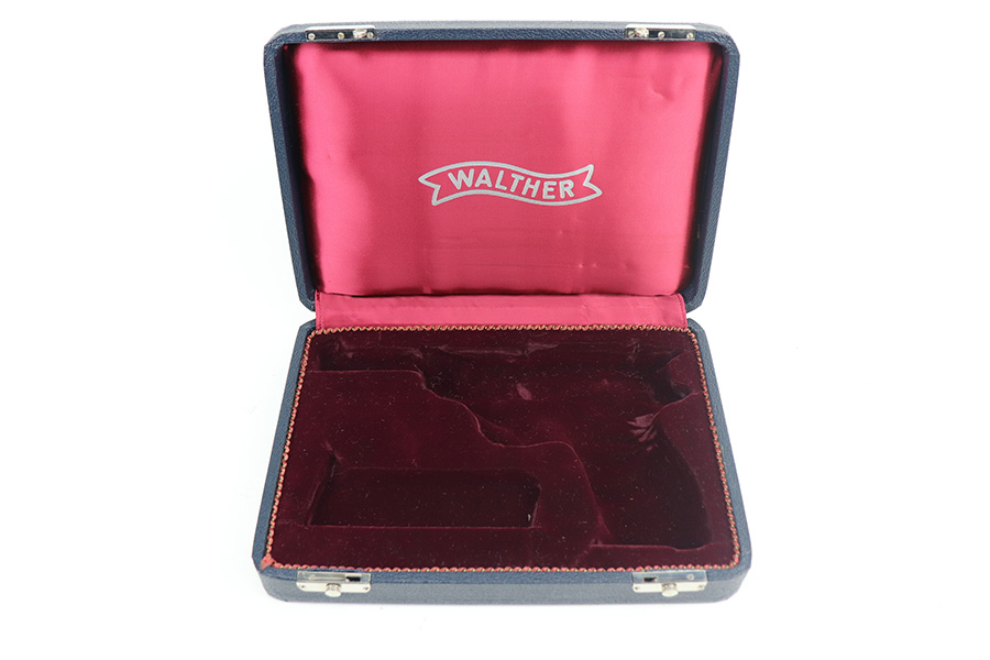5/12/21 – This is an original Walther P.38 presentation case. This case has blue stretched leather on the exterior and red interior. There’s some mild wear along the edges of the exteriors, and normal signs of use having previously held a pistol. The case is a great way to display, store, or gift a Walther P.38.