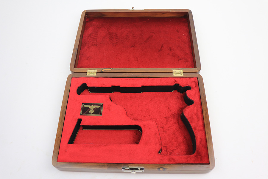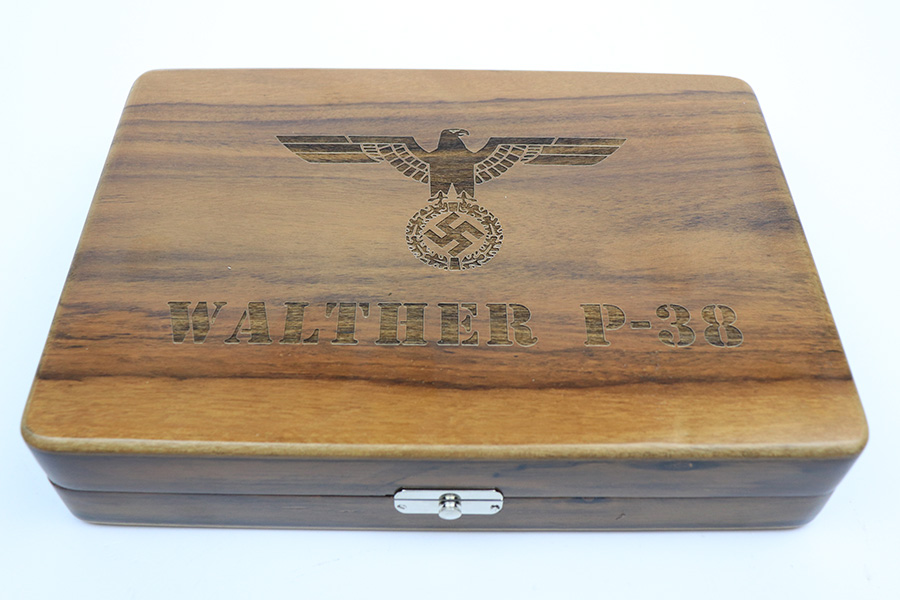 12/17/21 – This is an excellent custom-made wood presentation case for a Walther P.38 pistol. The inside of the case is lined with foam and red velvet. Also on the inside is a Nazi Eagle insignia. This is a great way to present your collectible firearm. Note, the gun photographed is not included here.