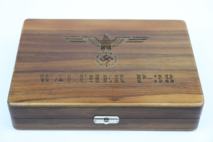 1/23/23 – This is an excellent custom-made wood presentation case for a Walther P.38 pistol. The inside of the case is lined with foam and red velvet. Also on the inside is a Nazi Eagle insignia. This is a great way to present your collectible firearm. Note, the gun photographed is not included here.