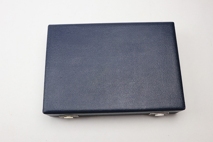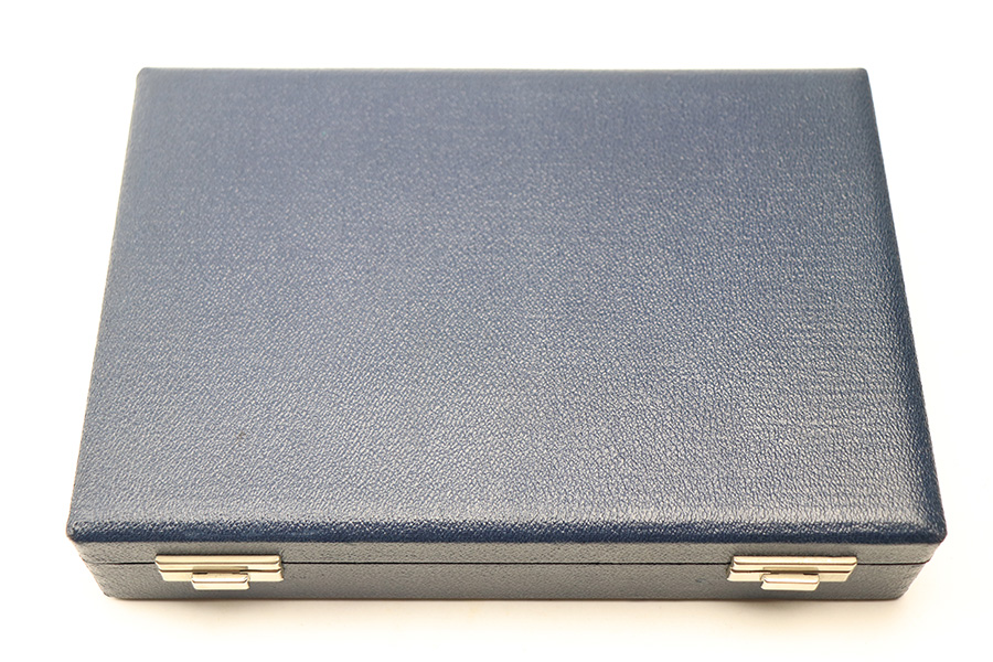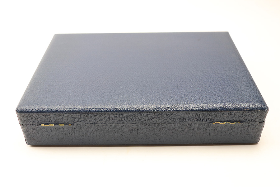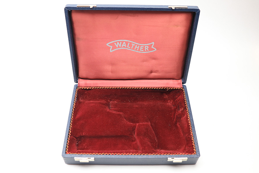 2/15/22 – This is a post WW2 production (1950s-60s) Walther P.38 presentation case. The case has an excellent blue leather exterior and a fairly clean red interior. The interior lid shows the Walther banner. There’s some interior wear and signs of previous use but no major damage. The exterior has no markings or notable flaws. Clasps secure and open without issue.
