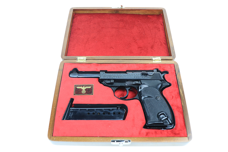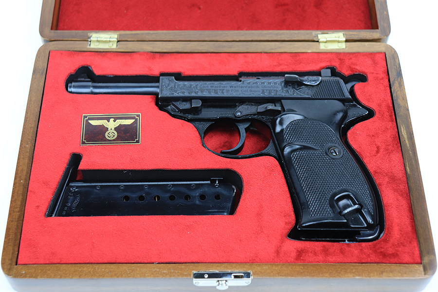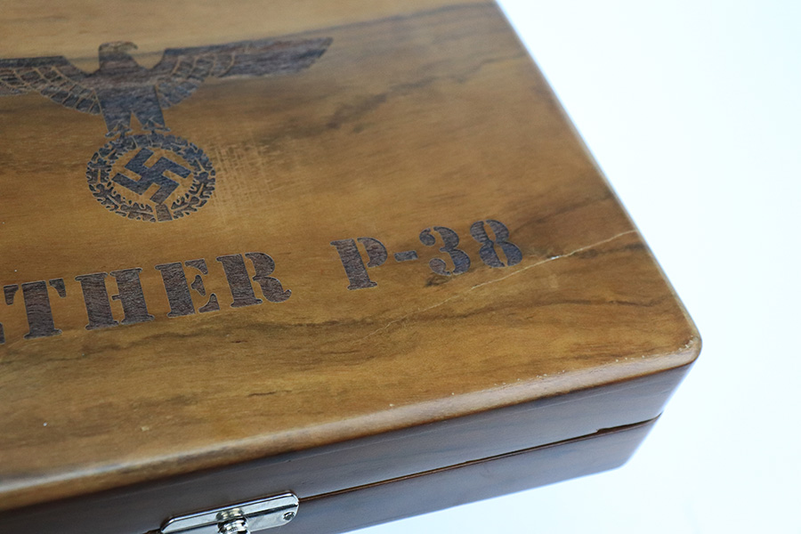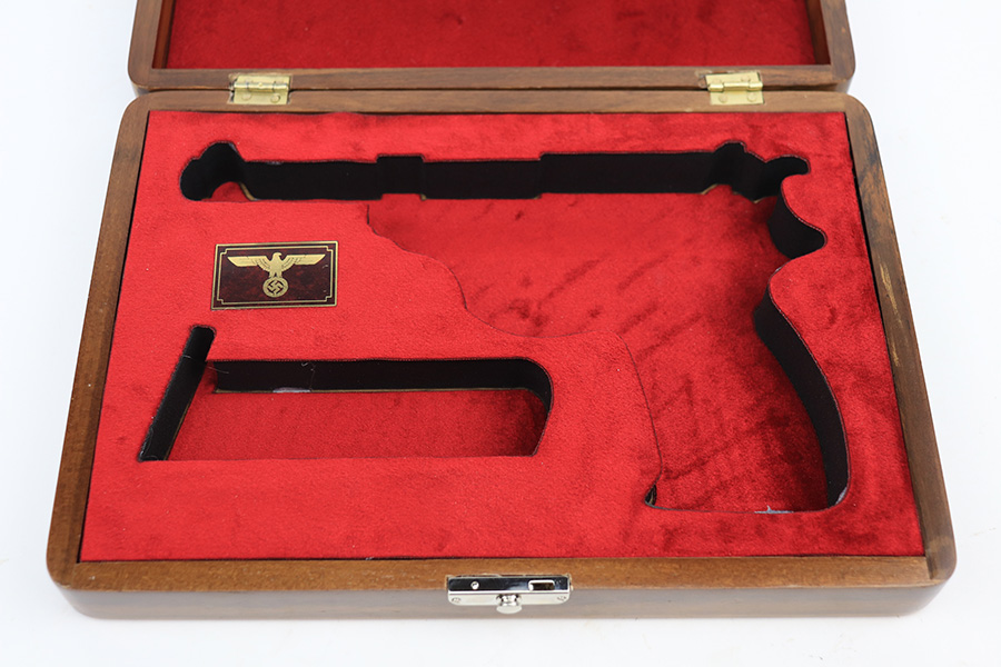 7/26/22 – This is an excellent custom-made wood presentation case for a Walther P.38 pistol. The inside of the case is lined with foam and red velvet. Also on the inside is a Nazi Eagle insignia. This is a great way to present your collectible firearm. Note, the gun photographed is not included here. Note: as shown in photographs, the front of the case has a thin crack on the lid. Doesn’t affect functionality.